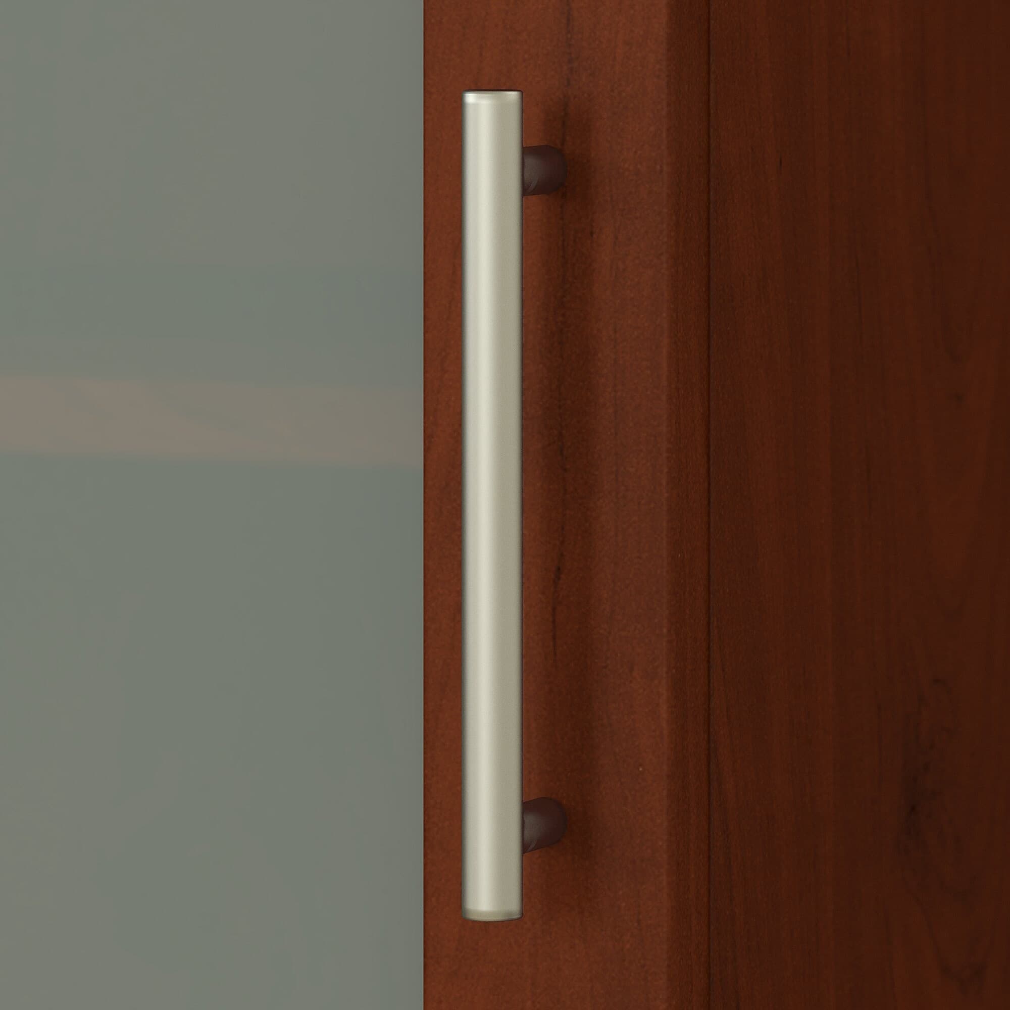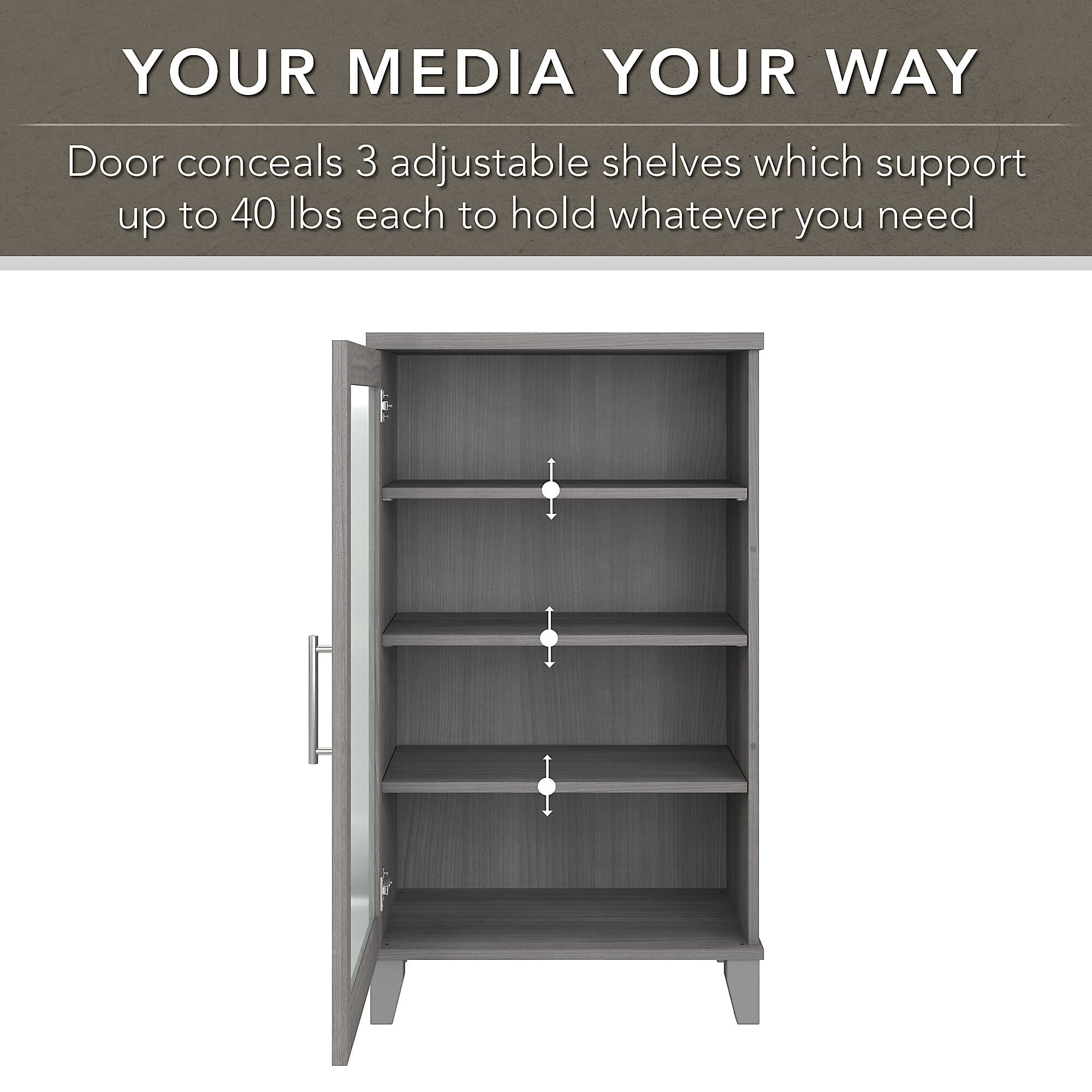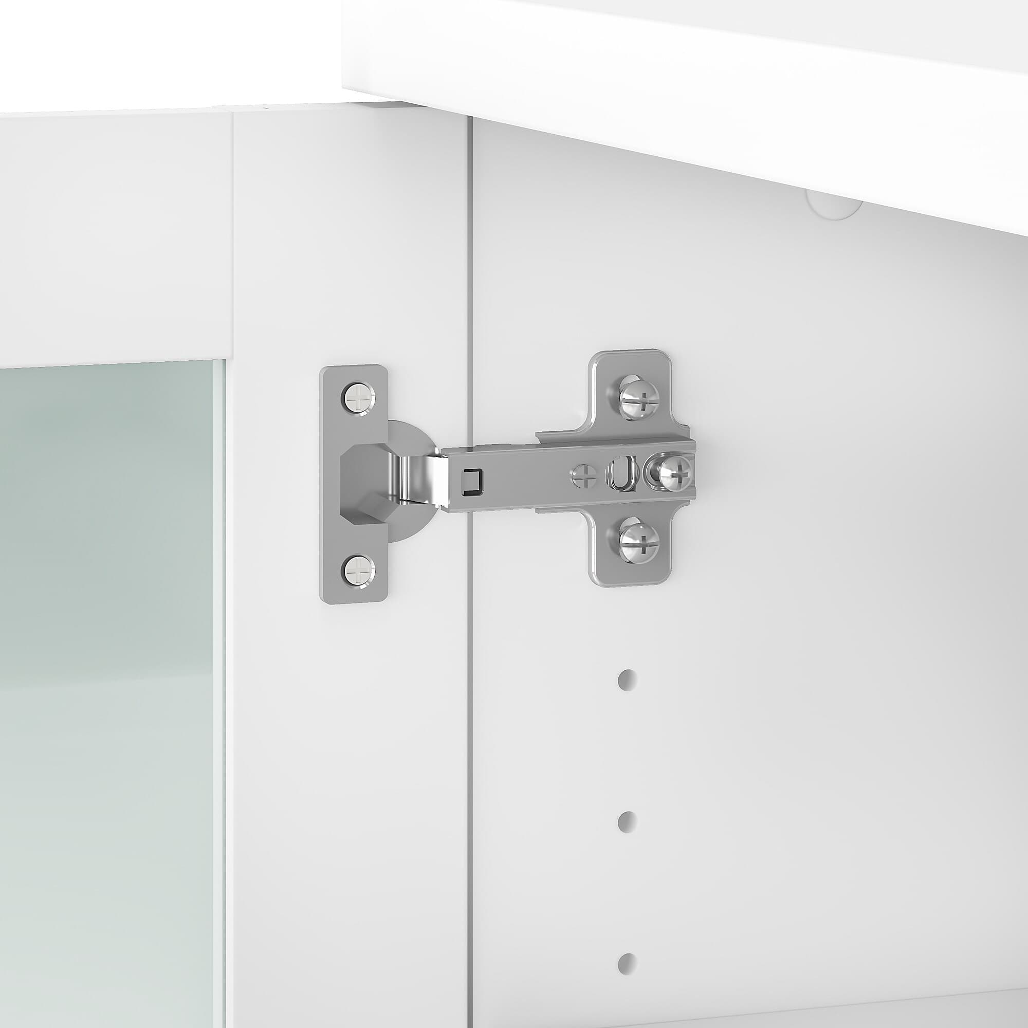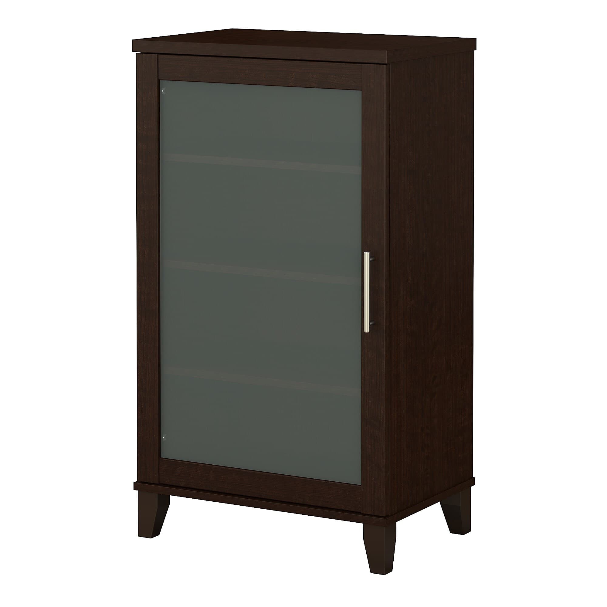 Enhance your living space with the mocha media cabinet. The frosted glass door, with its Euro-style hinges, reveals one fixed and three adjustable shelves. Each can support up to 40 pounds, making it ideal for holding a stereo, record player, DVD player, gaming console, and more. The back panel features cutouts for wire management, keeping cables organized.