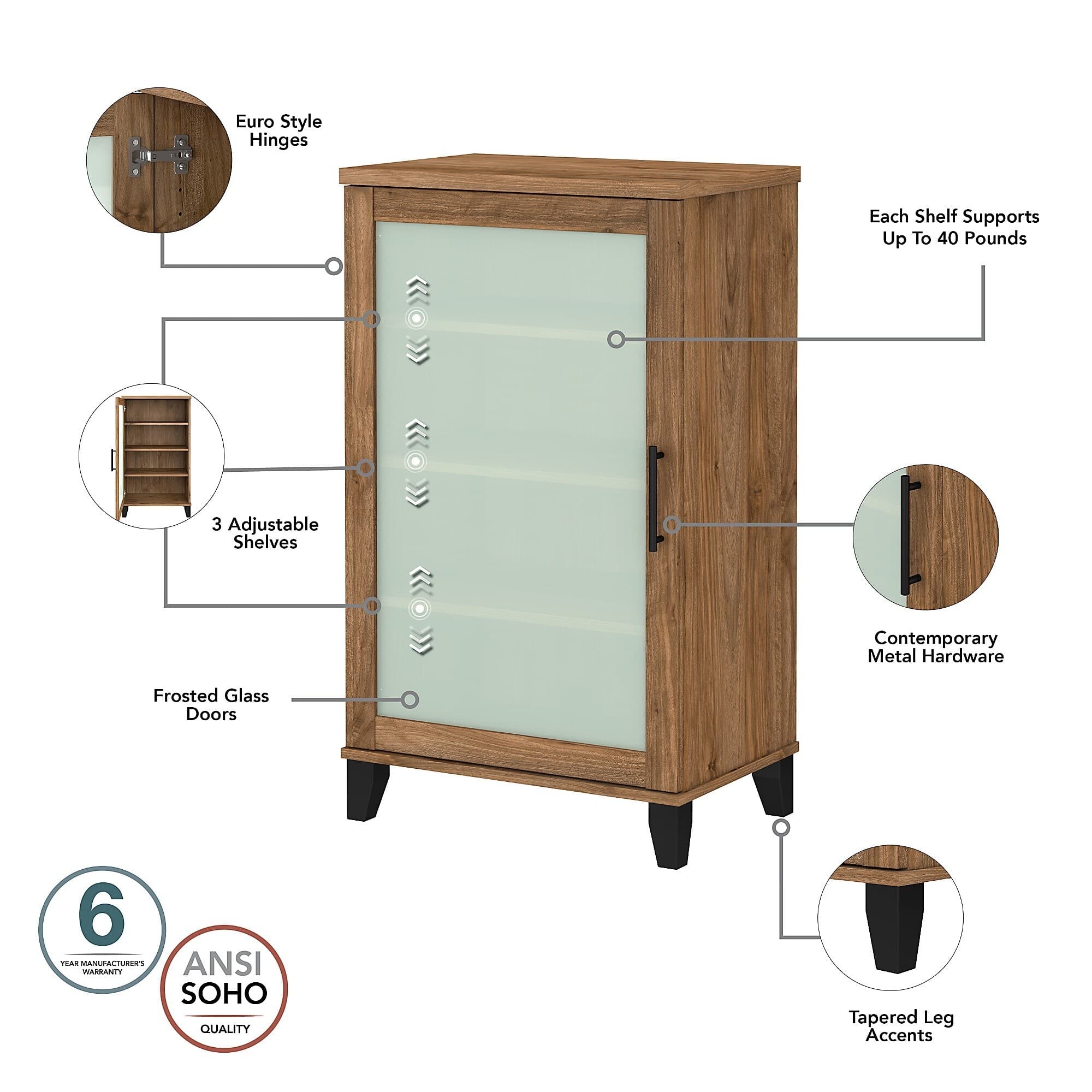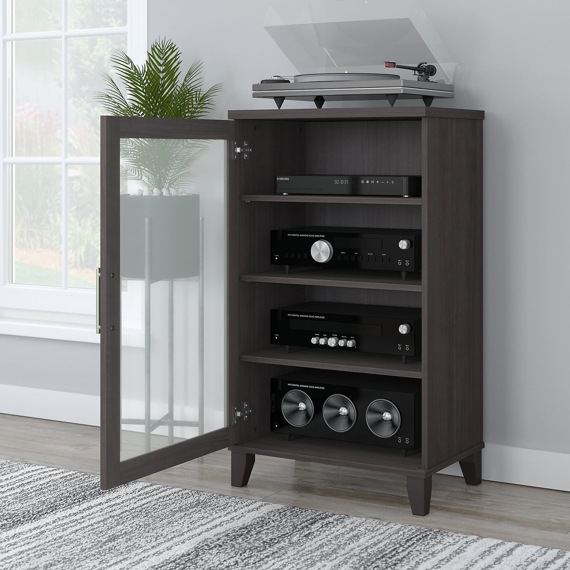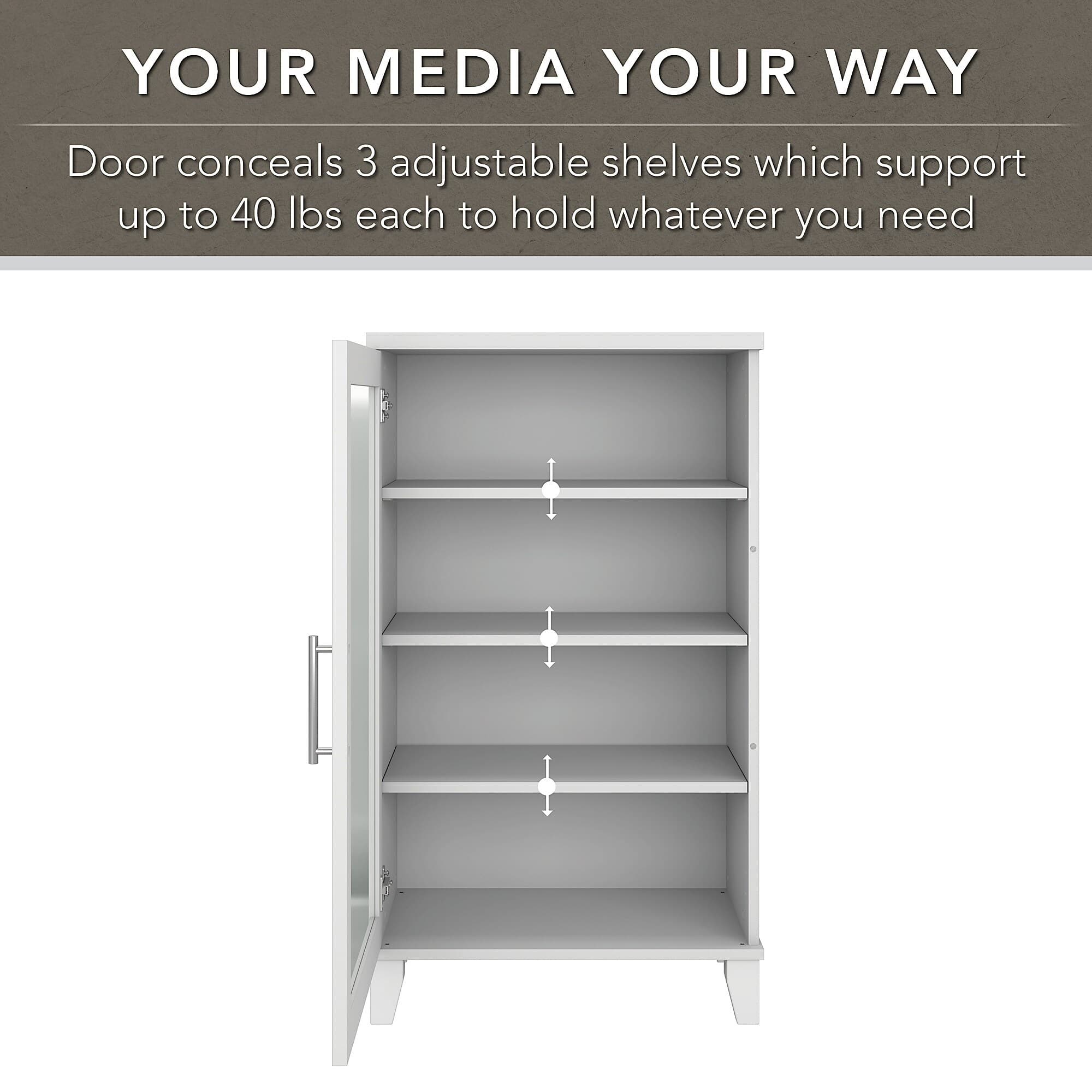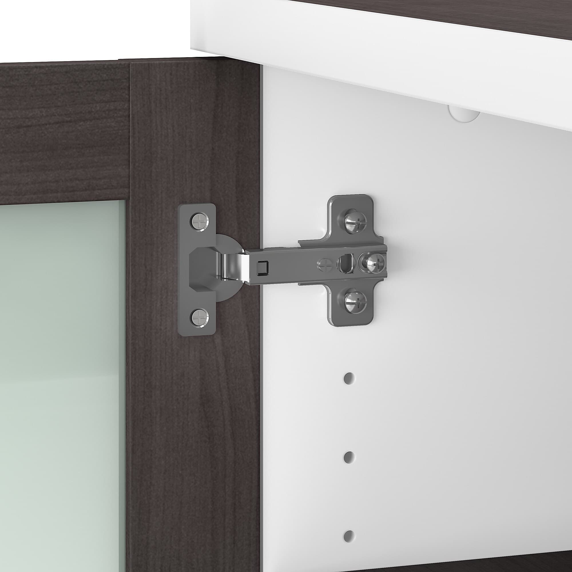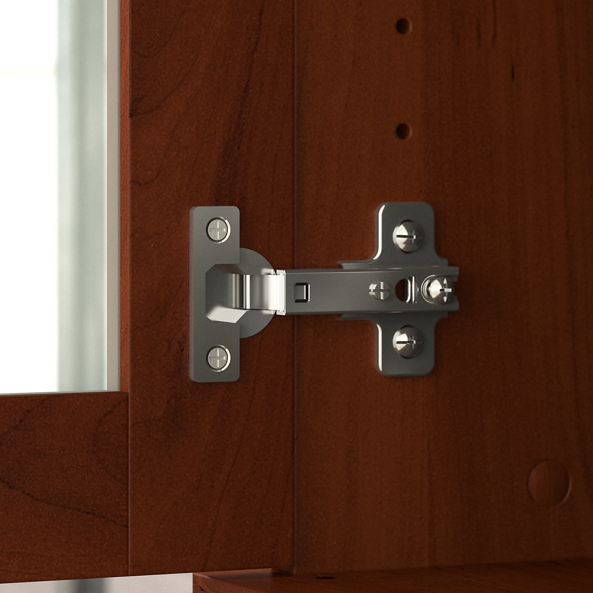 Enhance your living space with the mocha media cabinet. The frosted glass door, with its Euro-style hinges, reveals one fixed and three adjustable shelves. Each can support up to 40 pounds, making it ideal for holding a stereo, record player, DVD player, gaming console, and more. The back panel features cutouts for wire management, keeping cables organized.