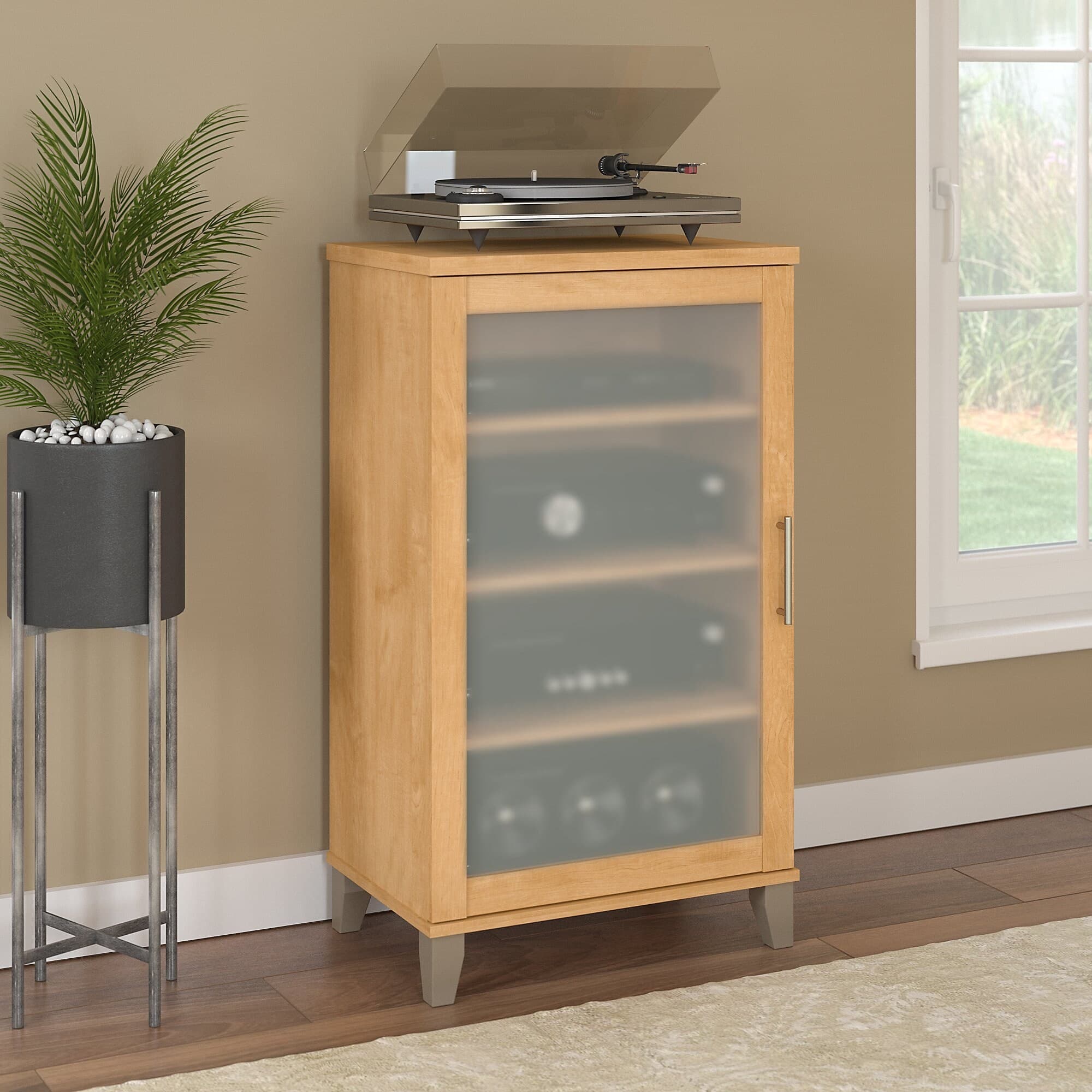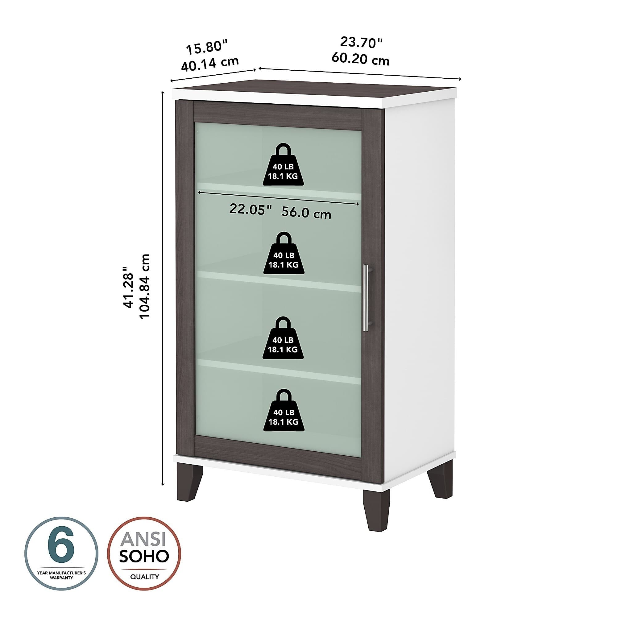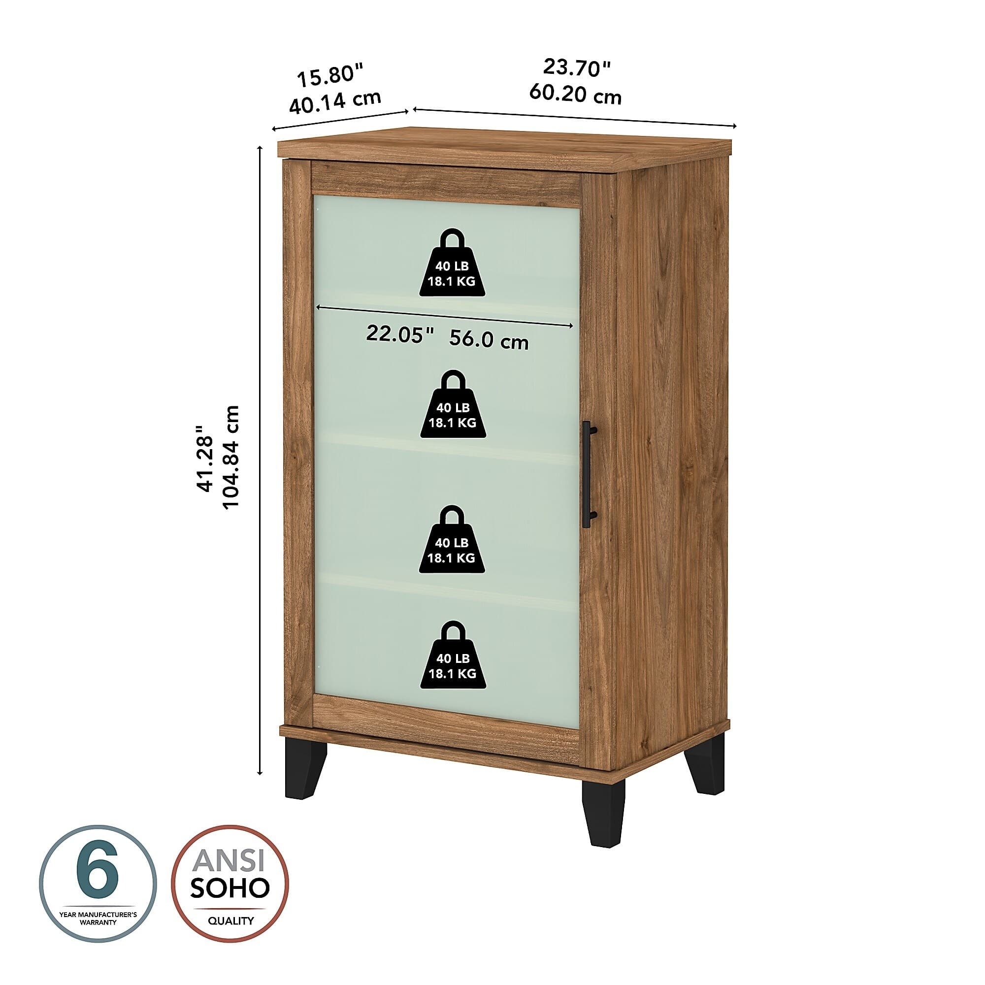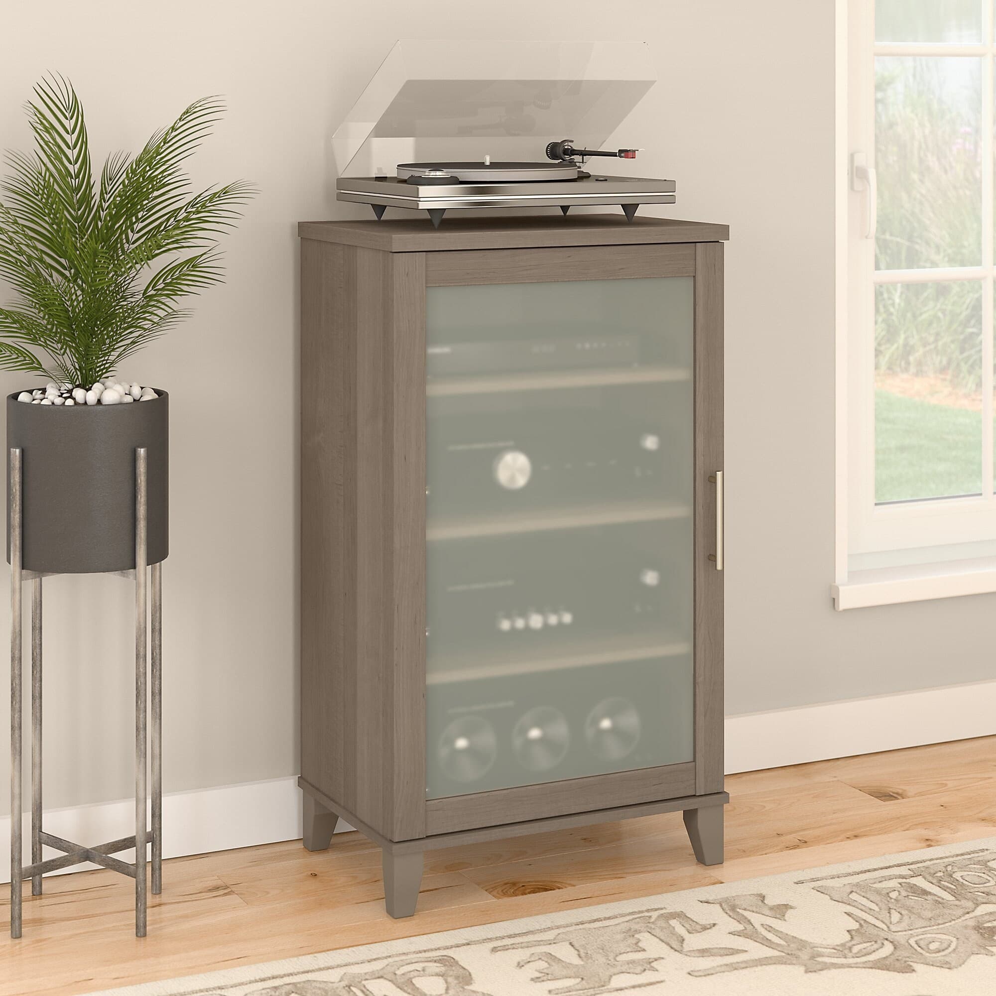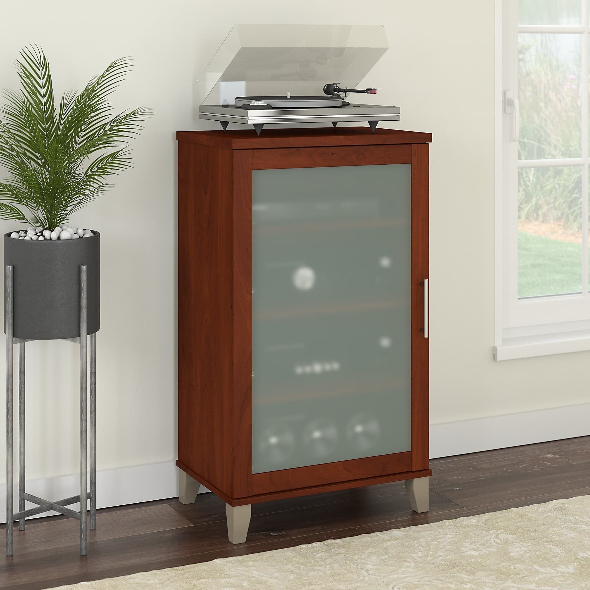 Enhance your living space with the mocha media cabinet. The frosted glass door, with its Euro-style hinges, reveals one fixed and three adjustable shelves. Each can support up to 40 pounds, making it ideal for holding a stereo, record player, DVD player, gaming console, and more. The back panel features cutouts for wire management, keeping cables organized.