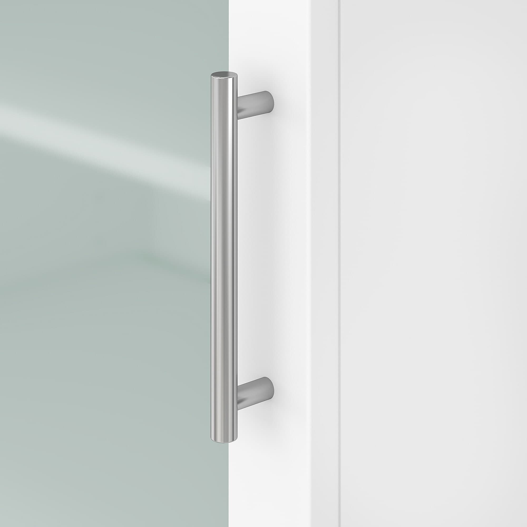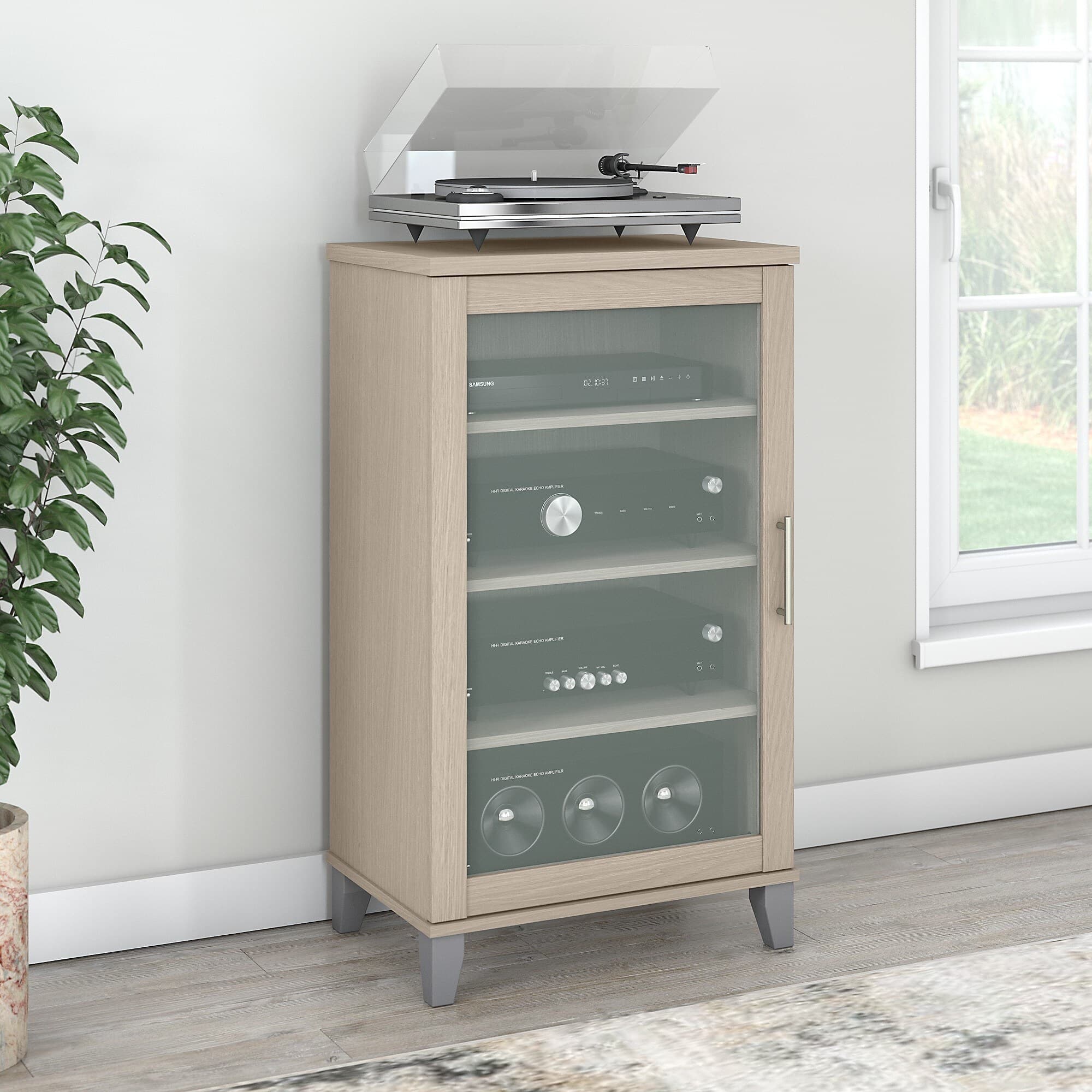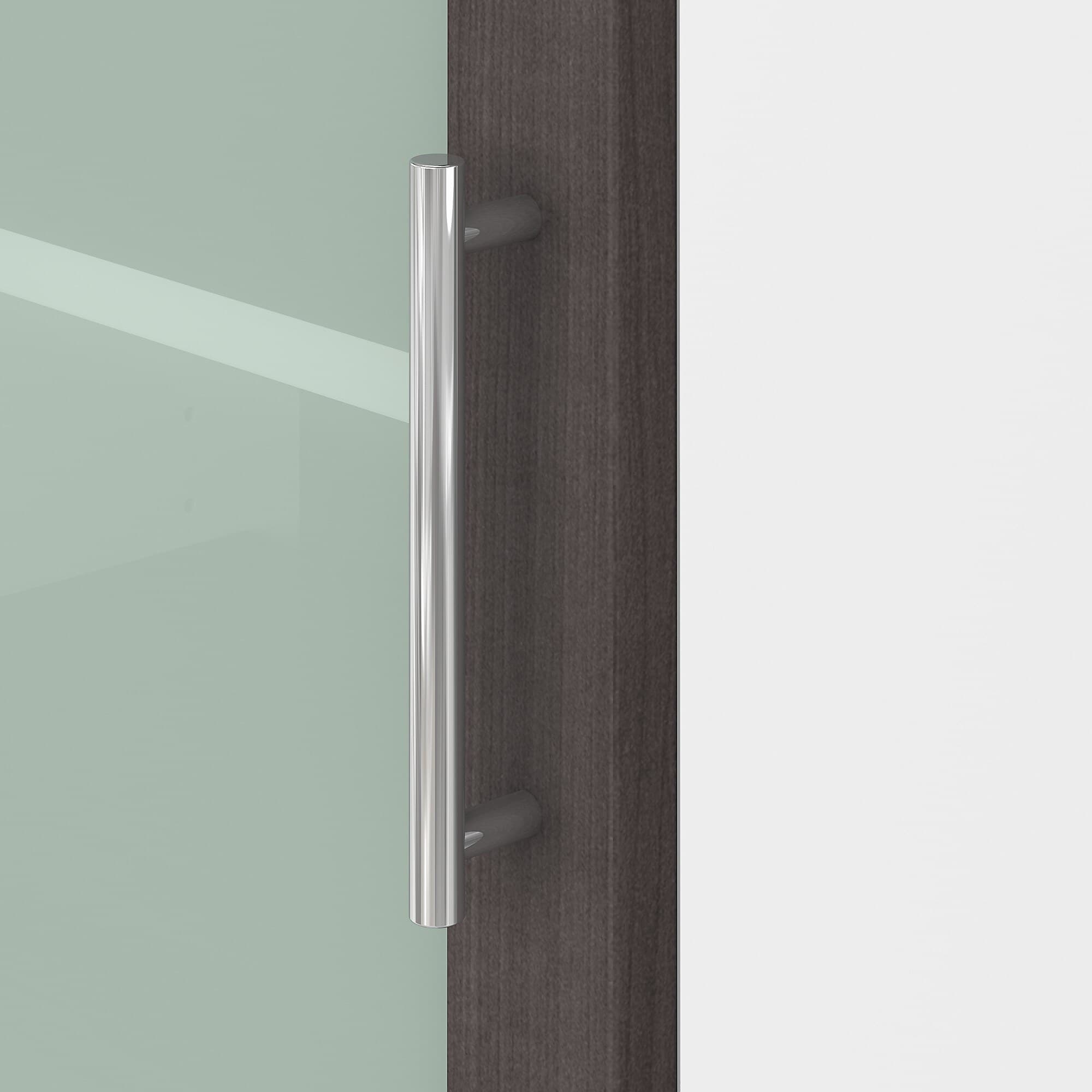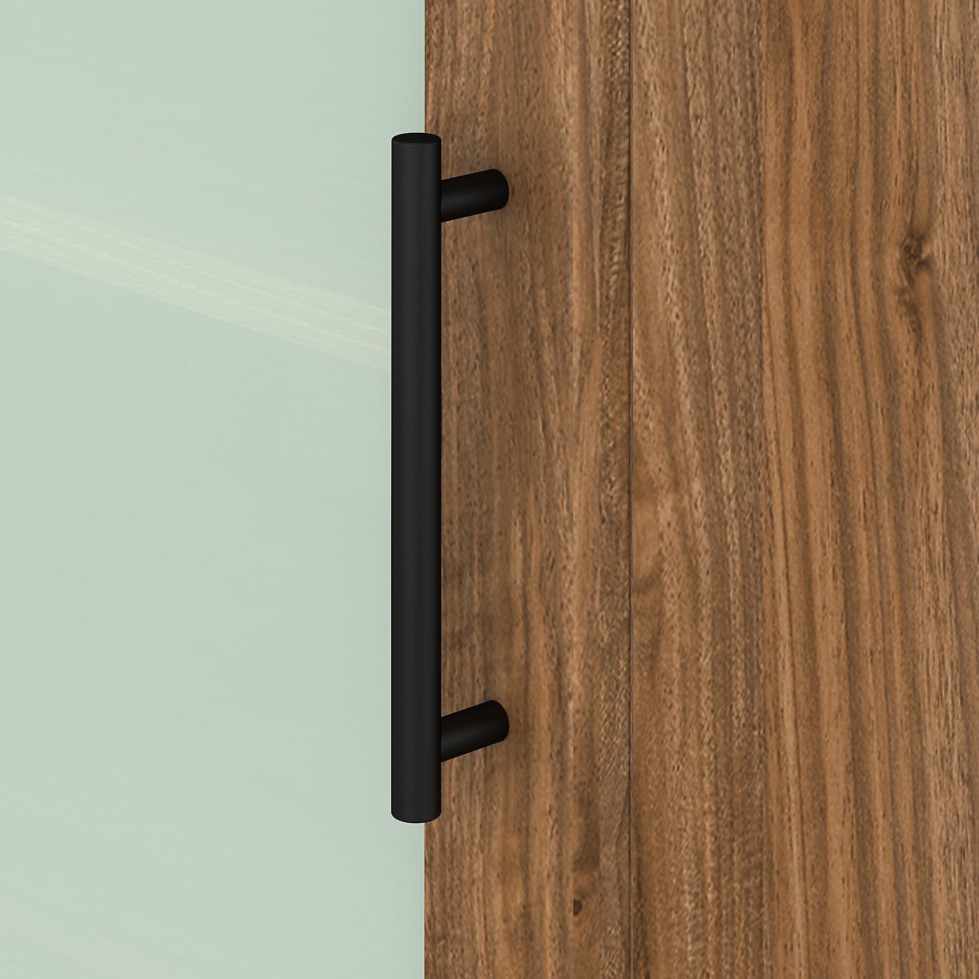Enhance your living space with the mocha media cabinet. The frosted glass door, with its Euro-style hinges, reveals one fixed and three adjustable shelves. Each can support up to 40 pounds, making it ideal for holding a stereo, record player, DVD player, gaming console, and more. The back panel features cutouts for wire management, keeping cables organized.