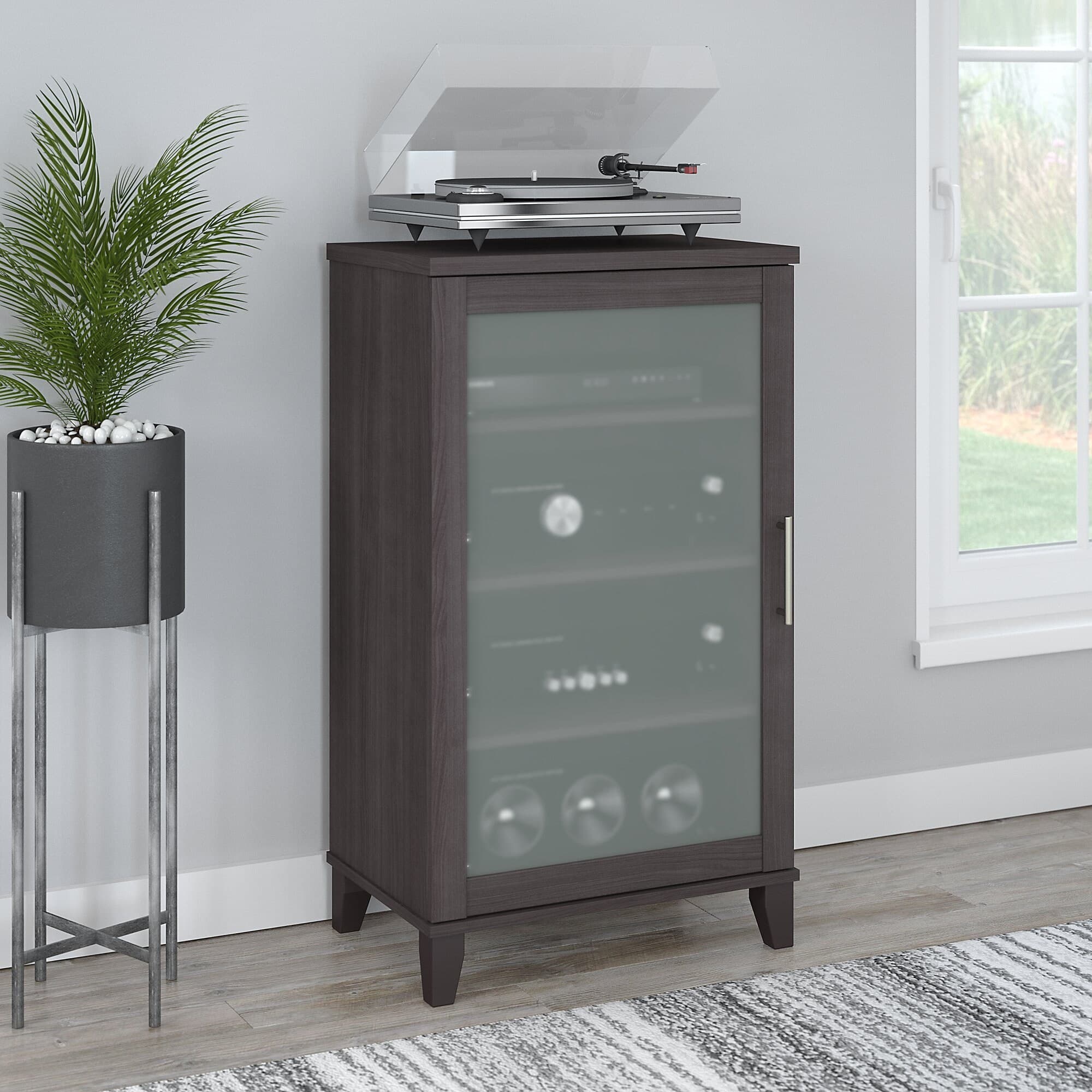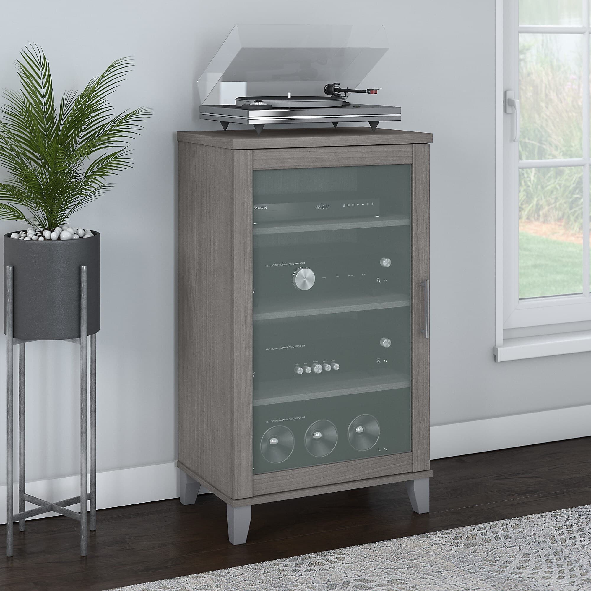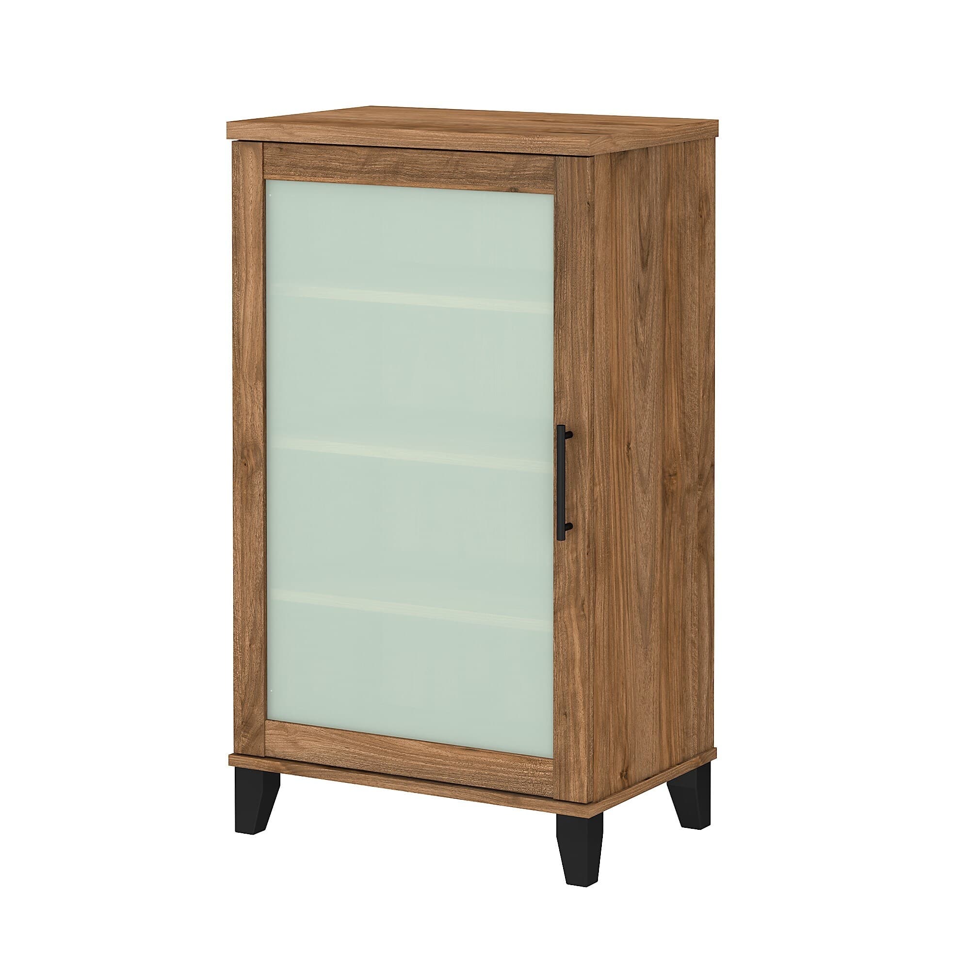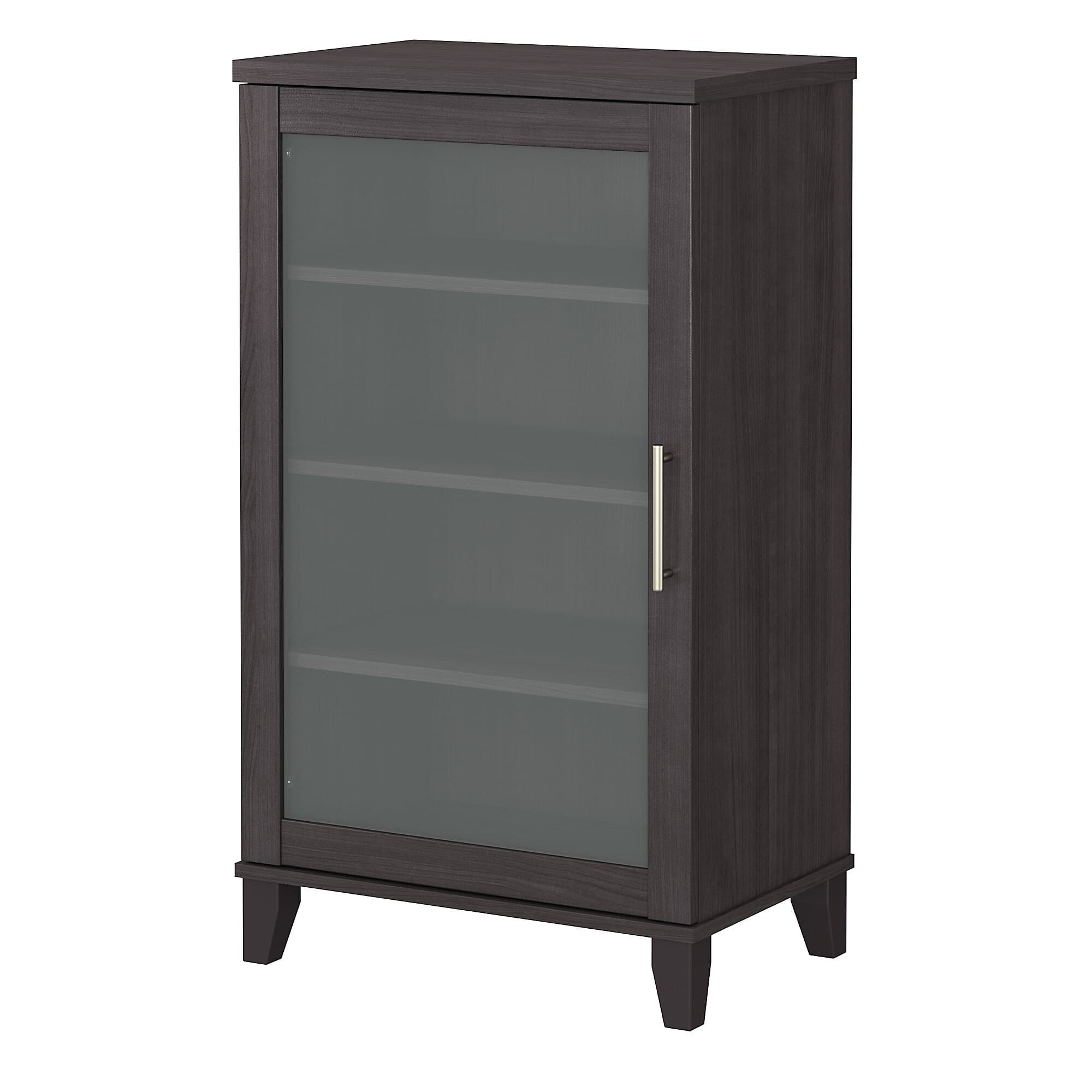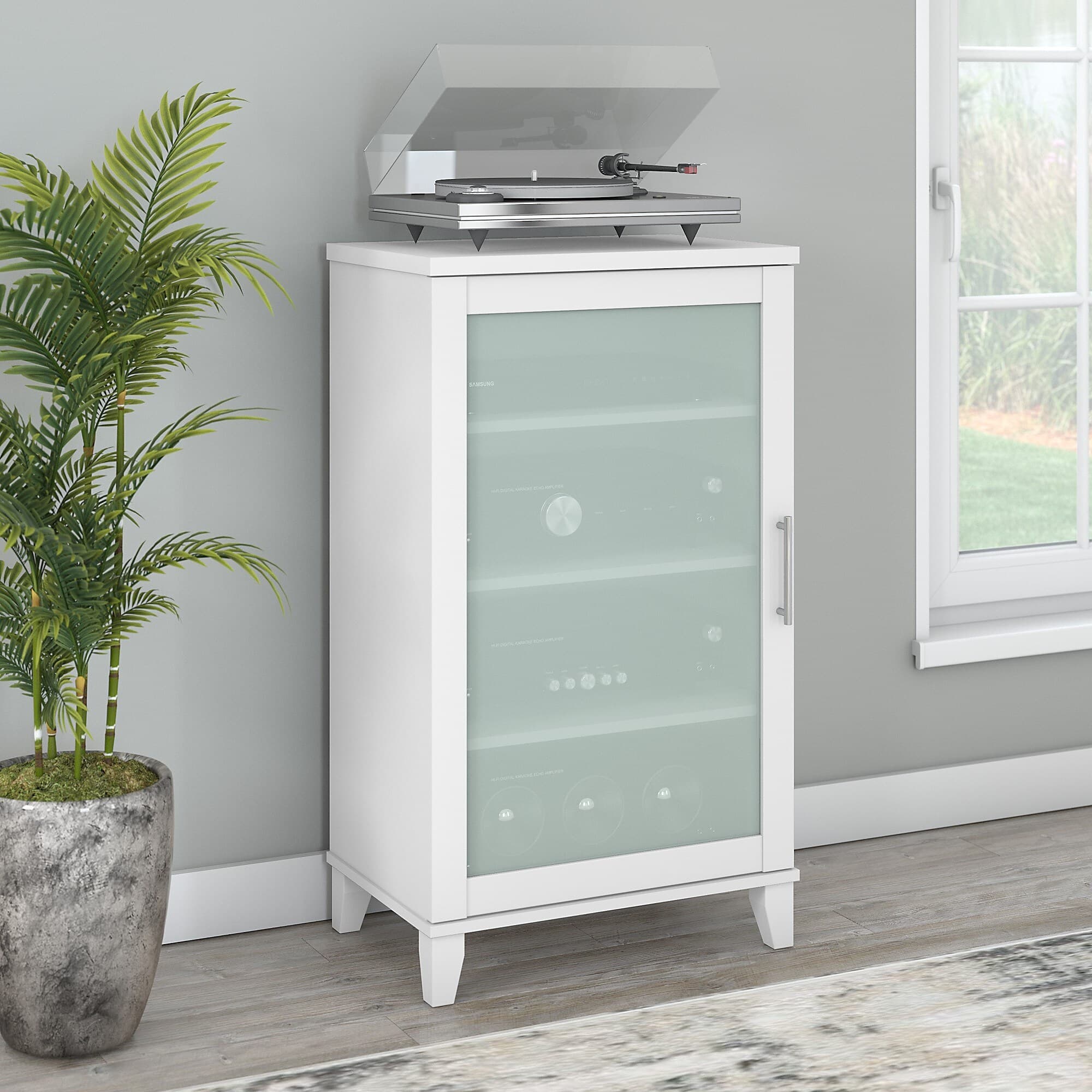 Enhance your living space with the mocha media cabinet. The frosted glass door, with its Euro-style hinges, reveals one fixed and three adjustable shelves. Each can support up to 40 pounds, making it ideal for holding a stereo, record player, DVD player, gaming console, and more. The back panel features cutouts for wire management, keeping cables organized.