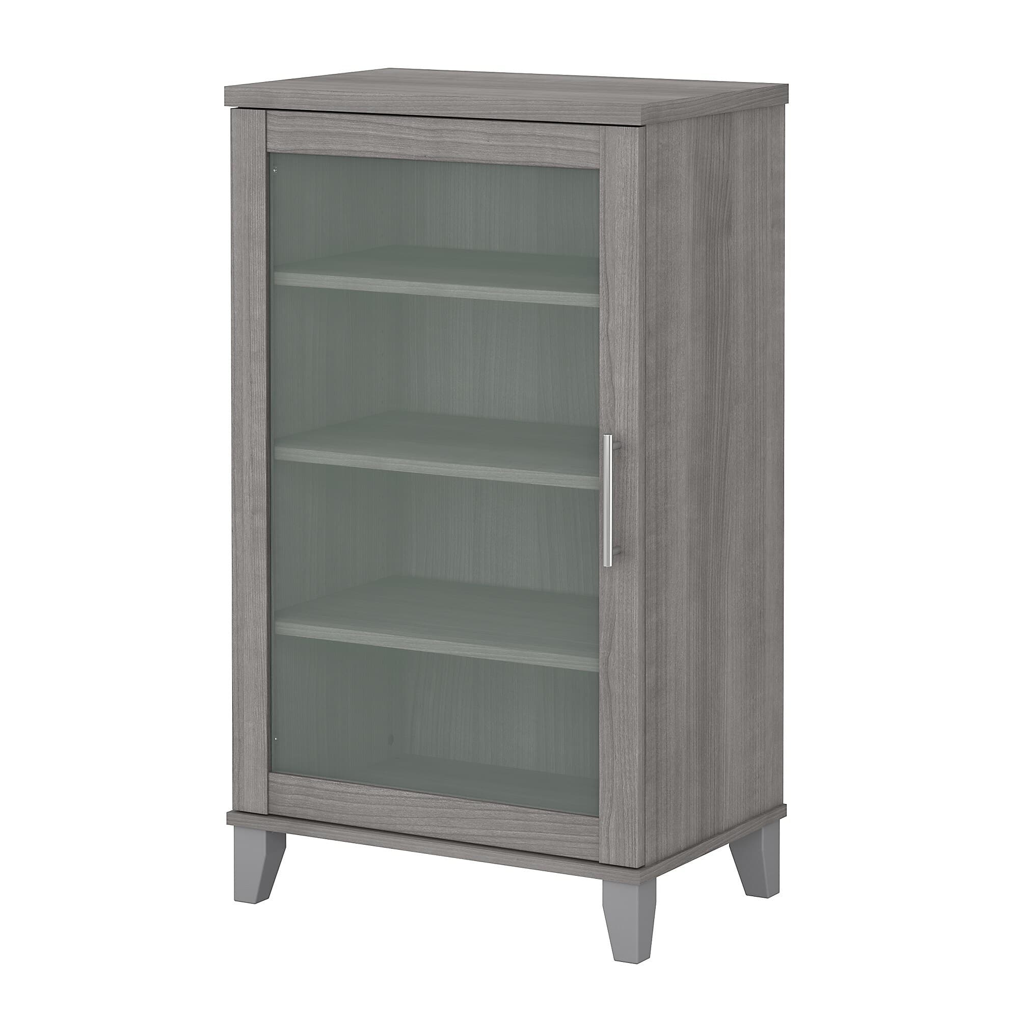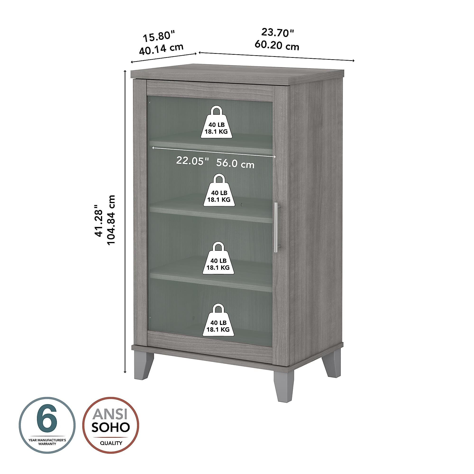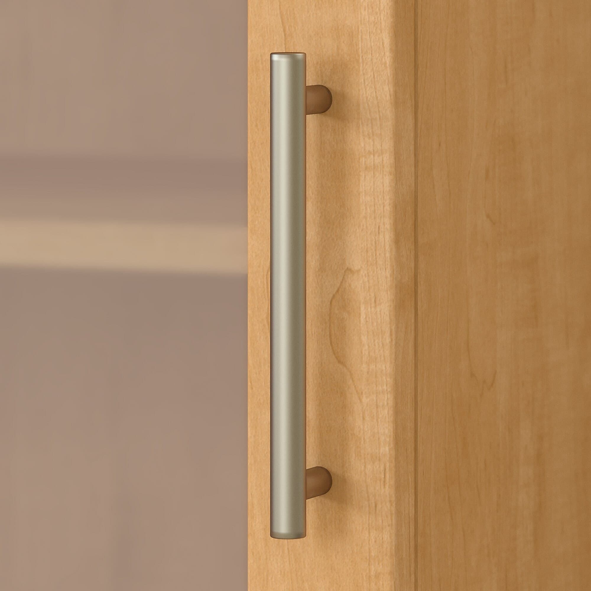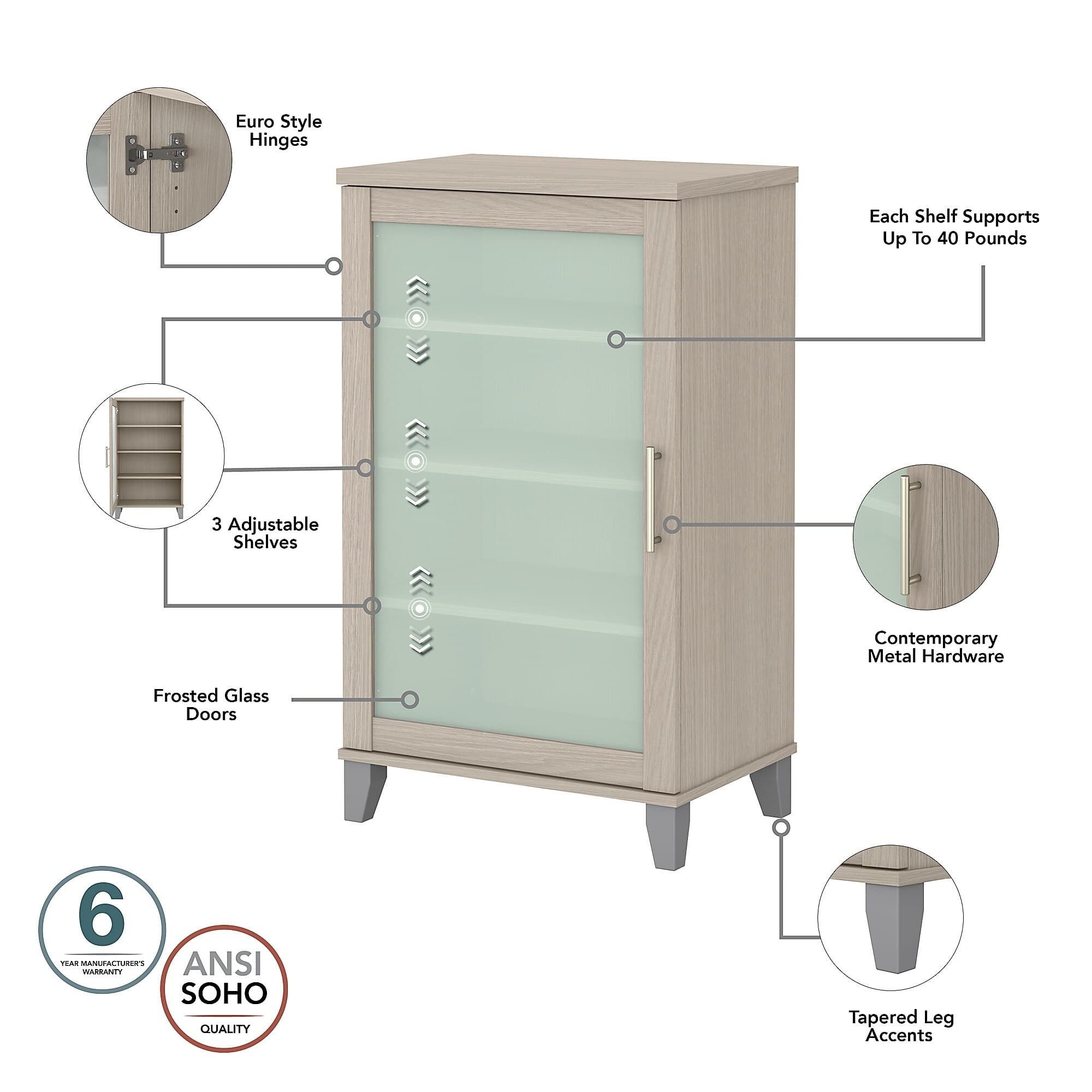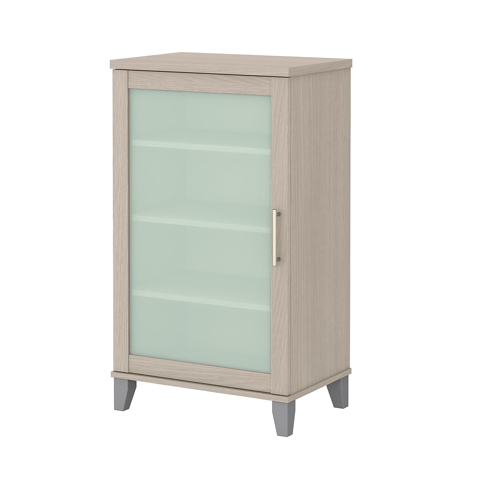 Enhance your living space with the mocha media cabinet. The frosted glass door, with its Euro-style hinges, reveals one fixed and three adjustable shelves. Each can support up to 40 pounds, making it ideal for holding a stereo, record player, DVD player, gaming console, and more. The back panel features cutouts for wire management, keeping cables organized.