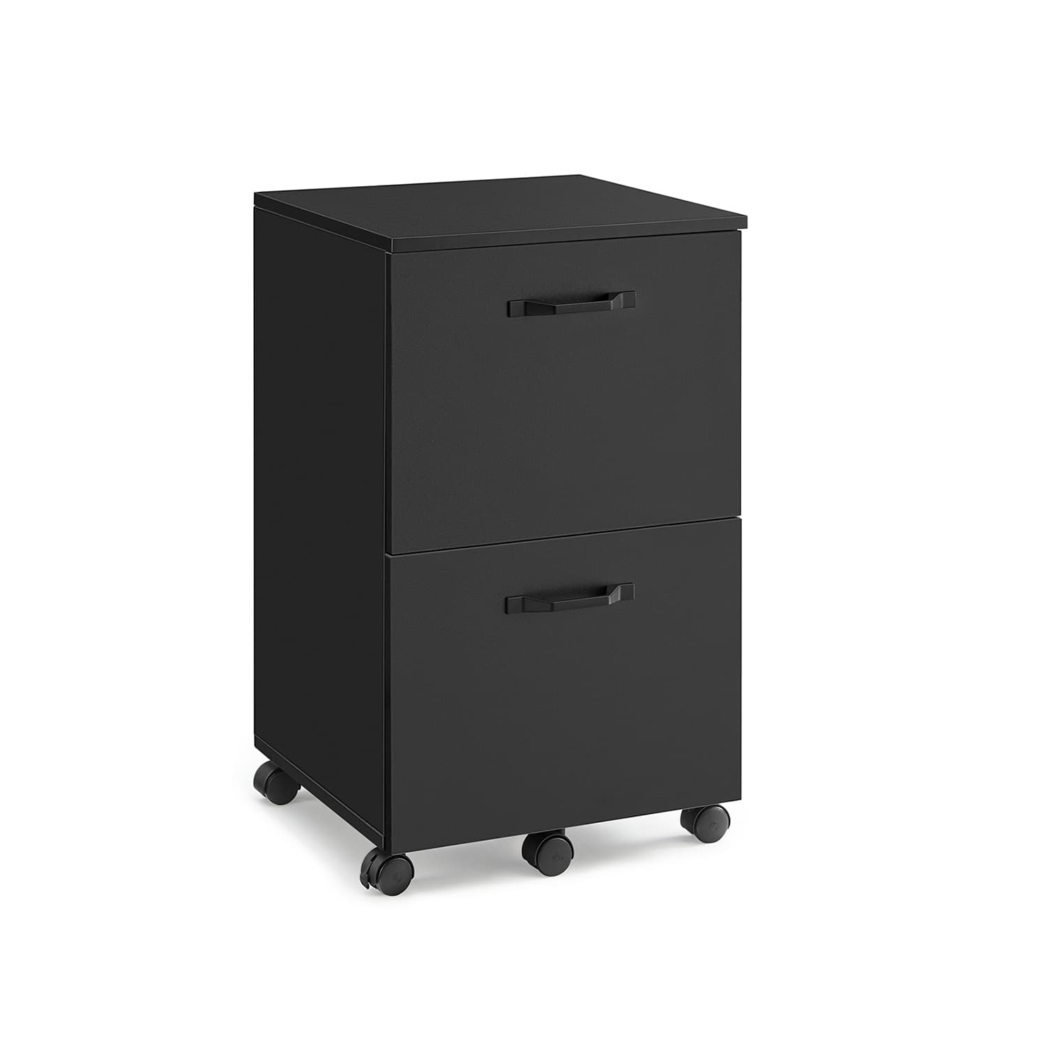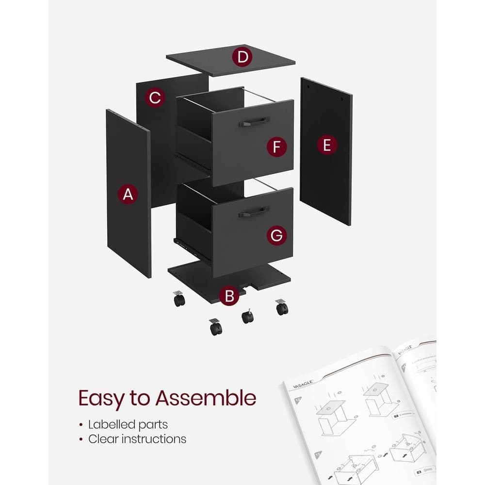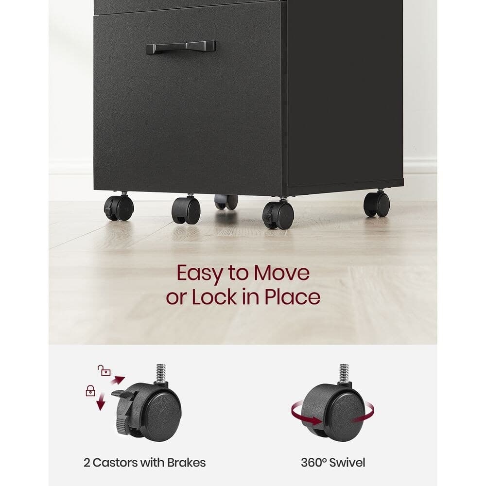 Color: Matte Black Material: Particleboard, Metal Handle Product Size: 16.5" x 15.7" x 27.6" Product Weight: 37.9 lbs. Max. Load Capacity: 66 lbs. Includes: 1 File Cabinet, Assembly Kit, Instructions Key Features: This file cabinet adds sophistication to your home office with its sleek lines and modern, all-black design. It has two spacious drawers with adjustable hanging rails for A4 or letter-sized folders. Its compact size fits neatly under a desk, also serving as a printer stand. Move it easily with five swivel wheels, and lock the front ones to keep it in place. Assembly is simple with labeled parts and illustrated instructions, allowing quick setup to organize your office.