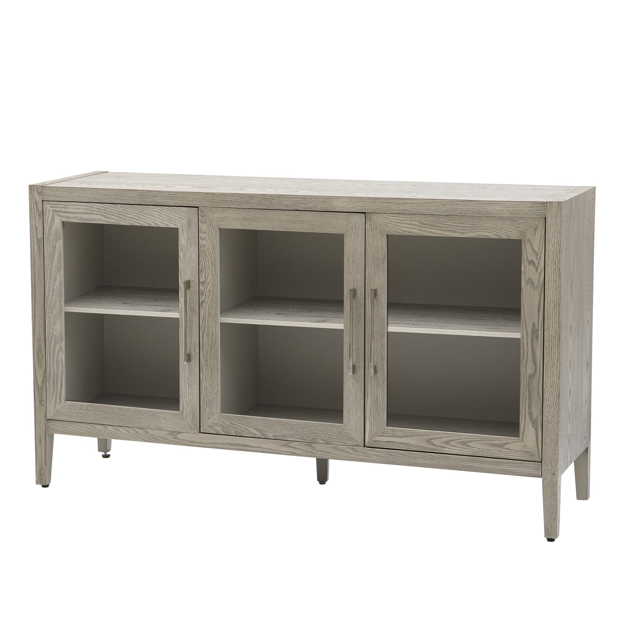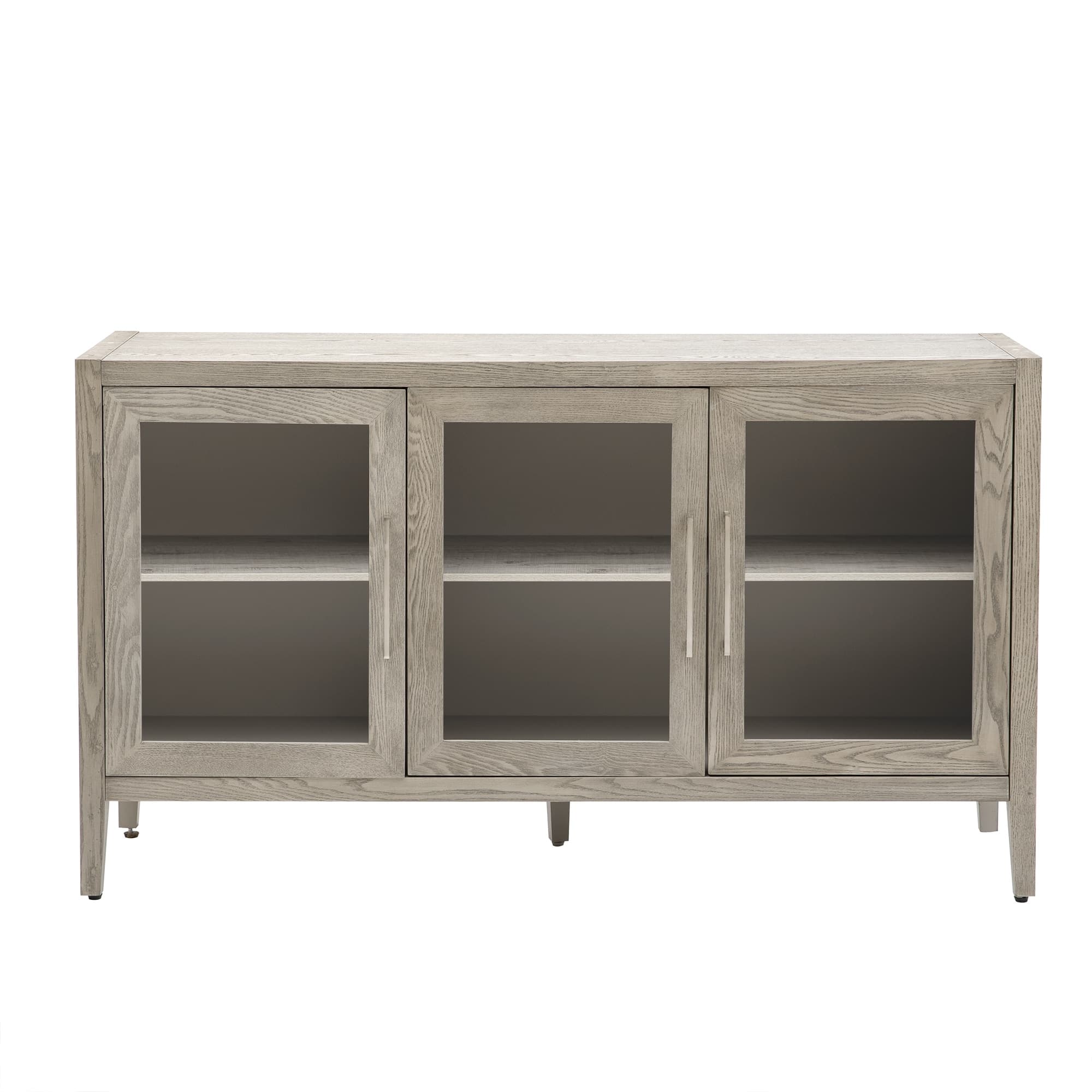 Elegant floor cabinet integrates a straightforward design with contemporary appeal, enhancing any home's aesthetic. It offers abundant storage for items such as bathroom supplies, crafts, books, or spices, ensuring organization. Constructed from quality MDF and pine, this cabinet promises sturdy, long-term use. The desktop supports up to 220 lbs, while the internal shelf holds 50 lbs. Slender metal handles provide easy door operation. Assembly is simple with included parts and instructions. Three framed glass doors and adjustable shelves let you customize the interior, showcasing china or books for a clean look. Minimalist style suits any home placement.