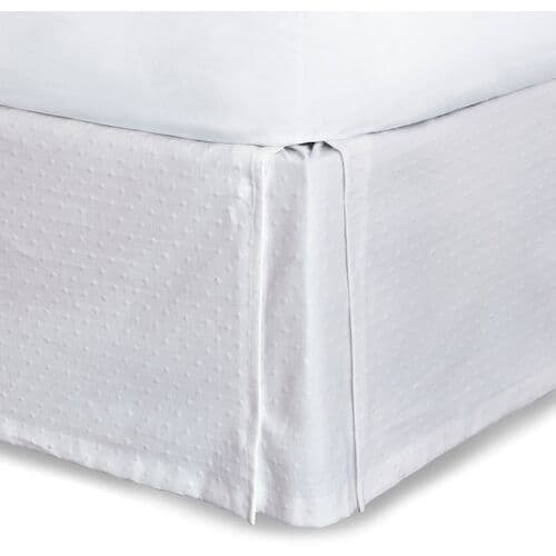 The cotton matelassé bed skirt completes the bed with a tonal dot pattern. It features a standard 16-inch drop, a 3-inch decking border, and split corners with kick pleats.