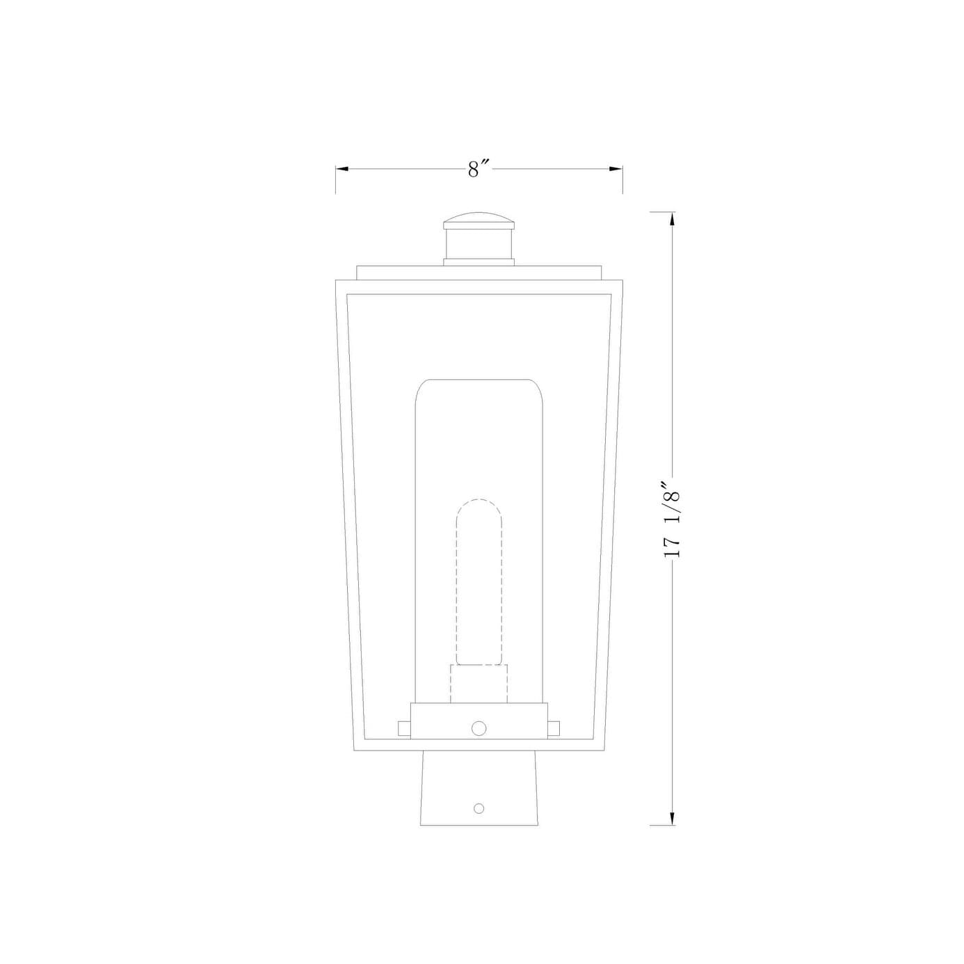 This outdoor post light requires one 100-watt maximum medium (E26) bulb and is dimmable with compatible bulbs. It's designed for wet locations and built for outdoor use. Dimensions include a height of 17-1/4", width of 8", and product weight of 3 lbs. Note: Bulb is not included.