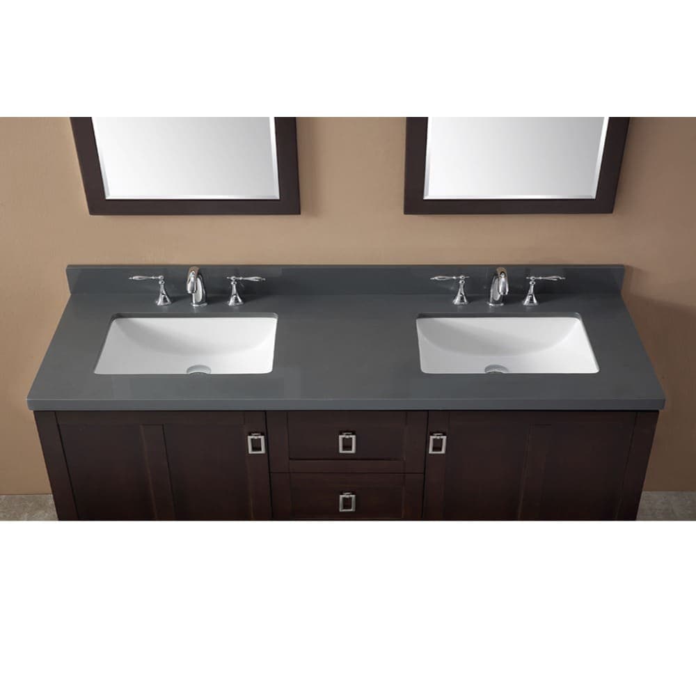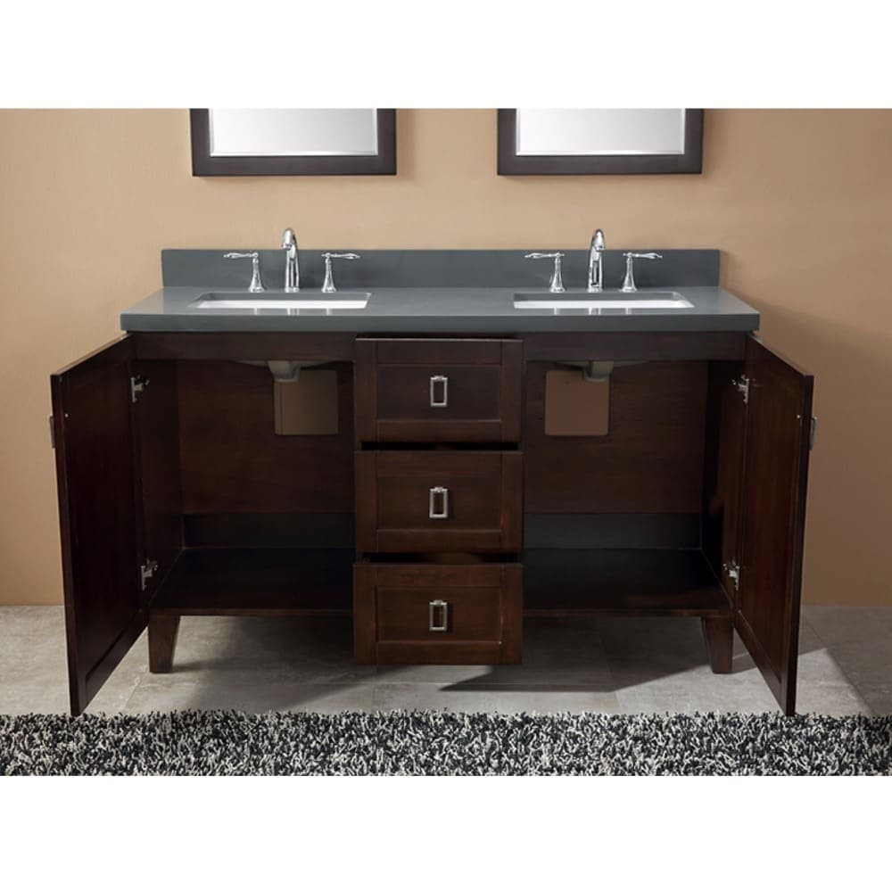 Constructed from solid wood, this double sink bathroom vanity features a dark brown finish that complements contemporary designs. The grey quartz countertop includes under-mounted rectangular sinks and is pre-drilled for widespread faucets. With soft-closing doors and three drawers, it provides ample storage space for your toiletries.