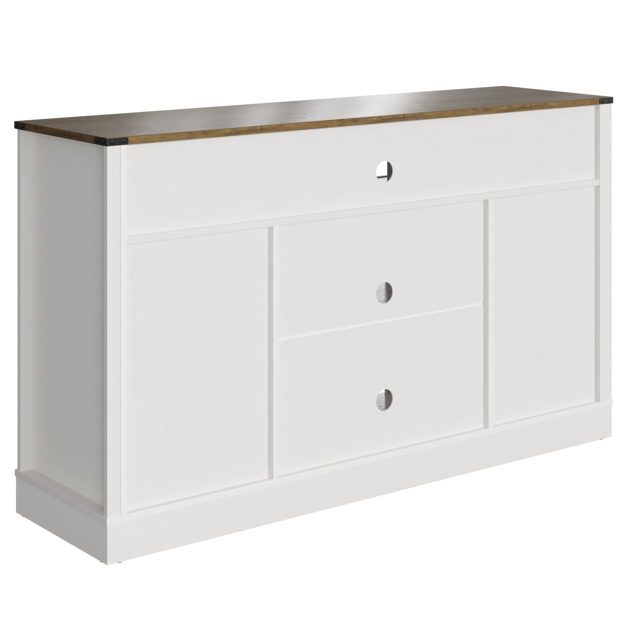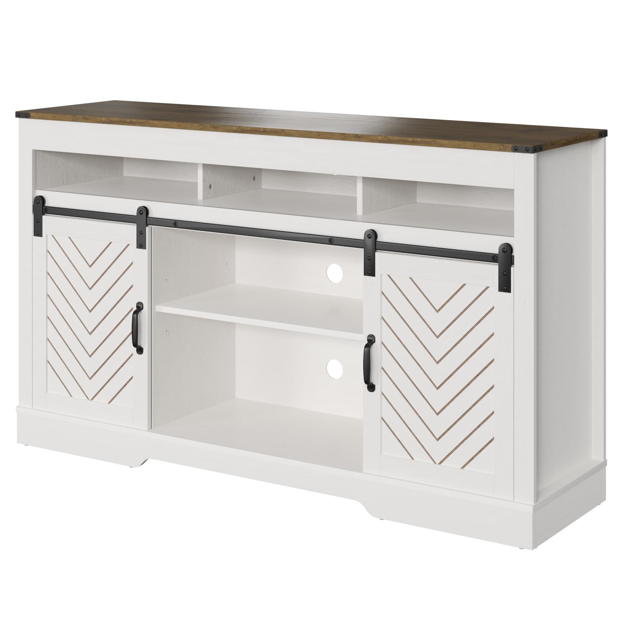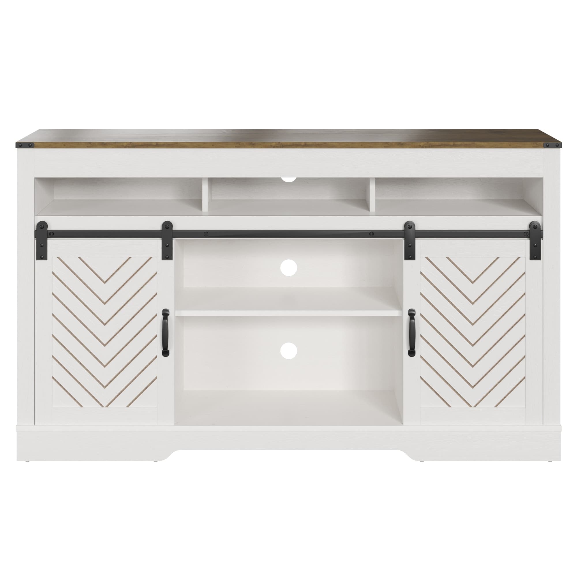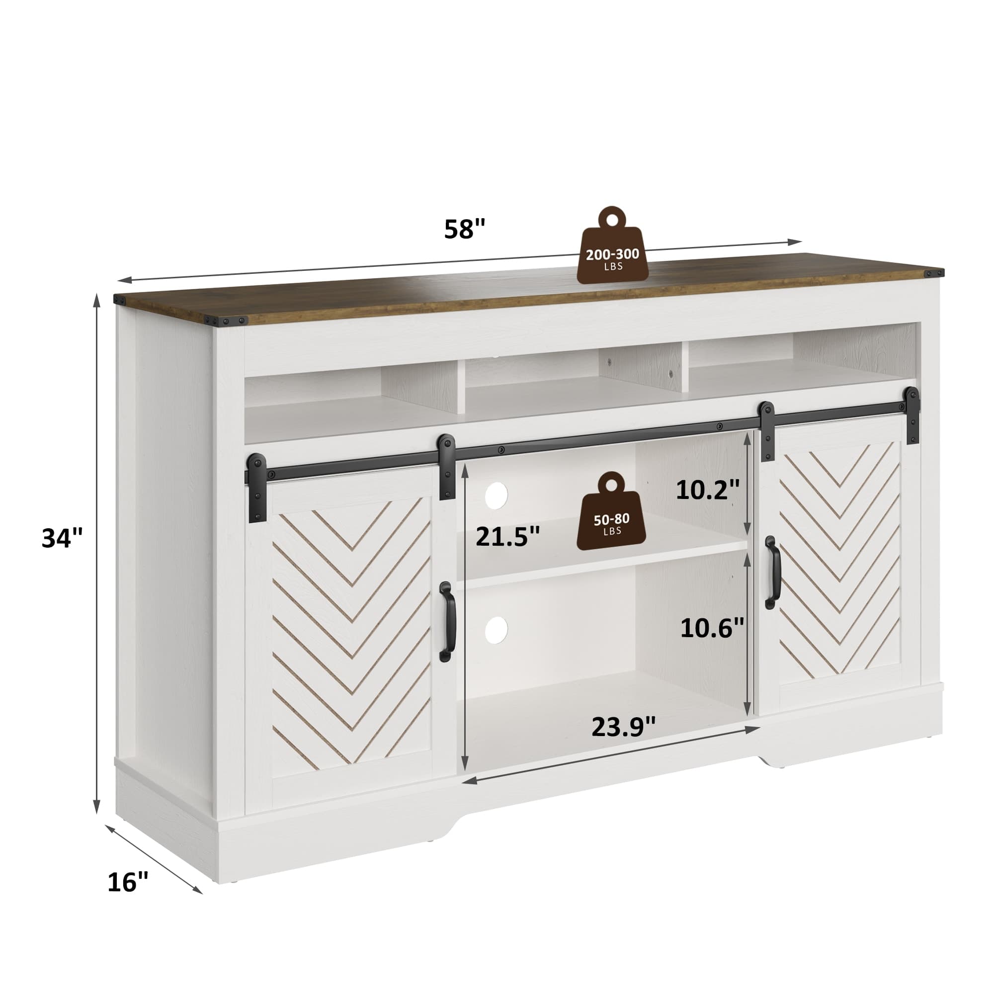 Featuring a blend of open and closed compartments, this TV stand offers flexible storage needs. Display your decor on the central shelves and use the three adjustable shelves for tailored organization. Barn-style doors glide seamlessly on steel rails with exposed wheels, offering easy access to electronic devices. Keeping clutter out of sight, this entertainment center merges rustic style with modern convenience. Its rustic console table charm is highlighted by X-shaped cabinet accents and a meticulously weathered finish. Made from engineered wood with a durable imitation wood grain laminate, this 65-inch TV stand supports up to 300 pounds, offering lasting durability. All tools and clear instructions are included for easy assembly. High-quality hardware ensures your furniture's strength and stability. Product Dimensions: Length: 58.00 in., Width: 34.00 in., Height: 16.00 in., Weight: 106.01 lbs.