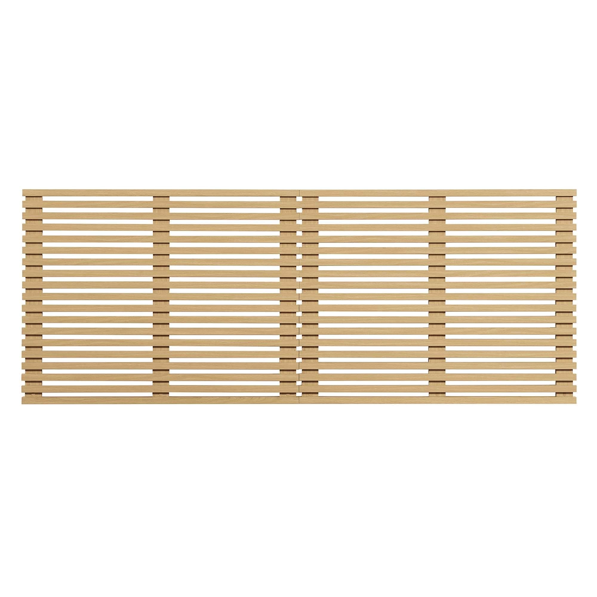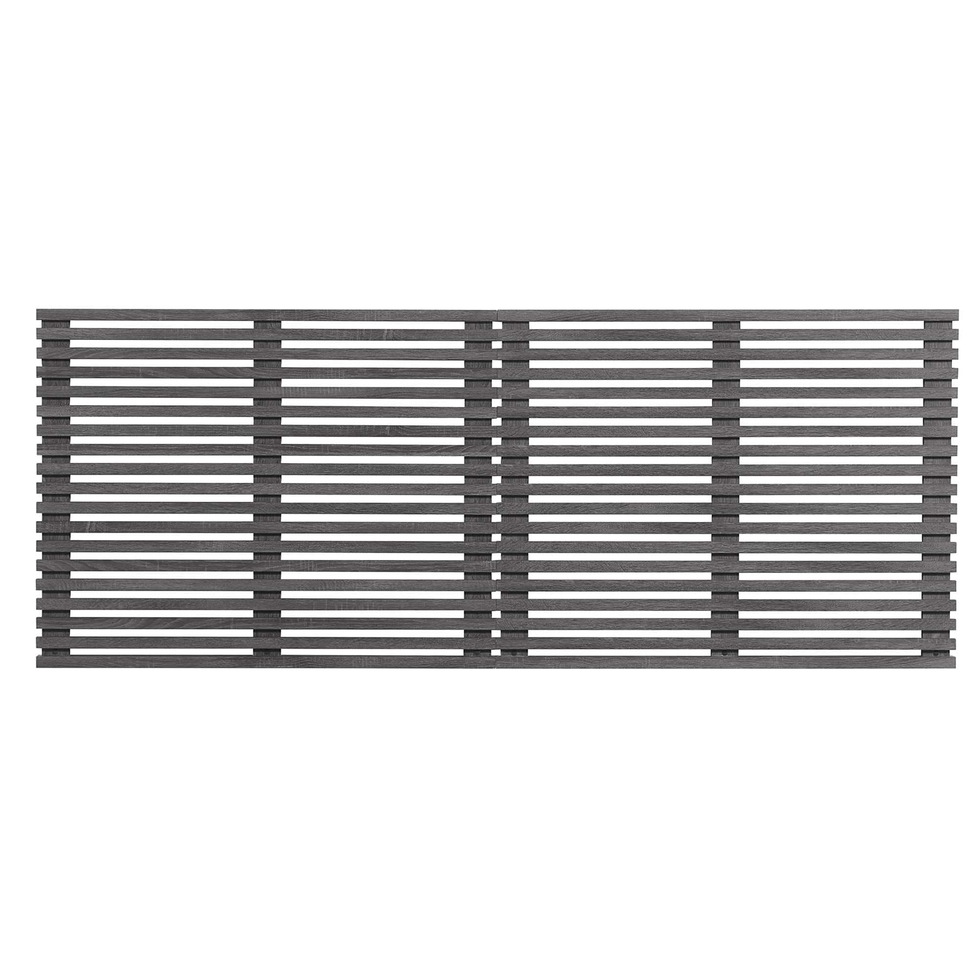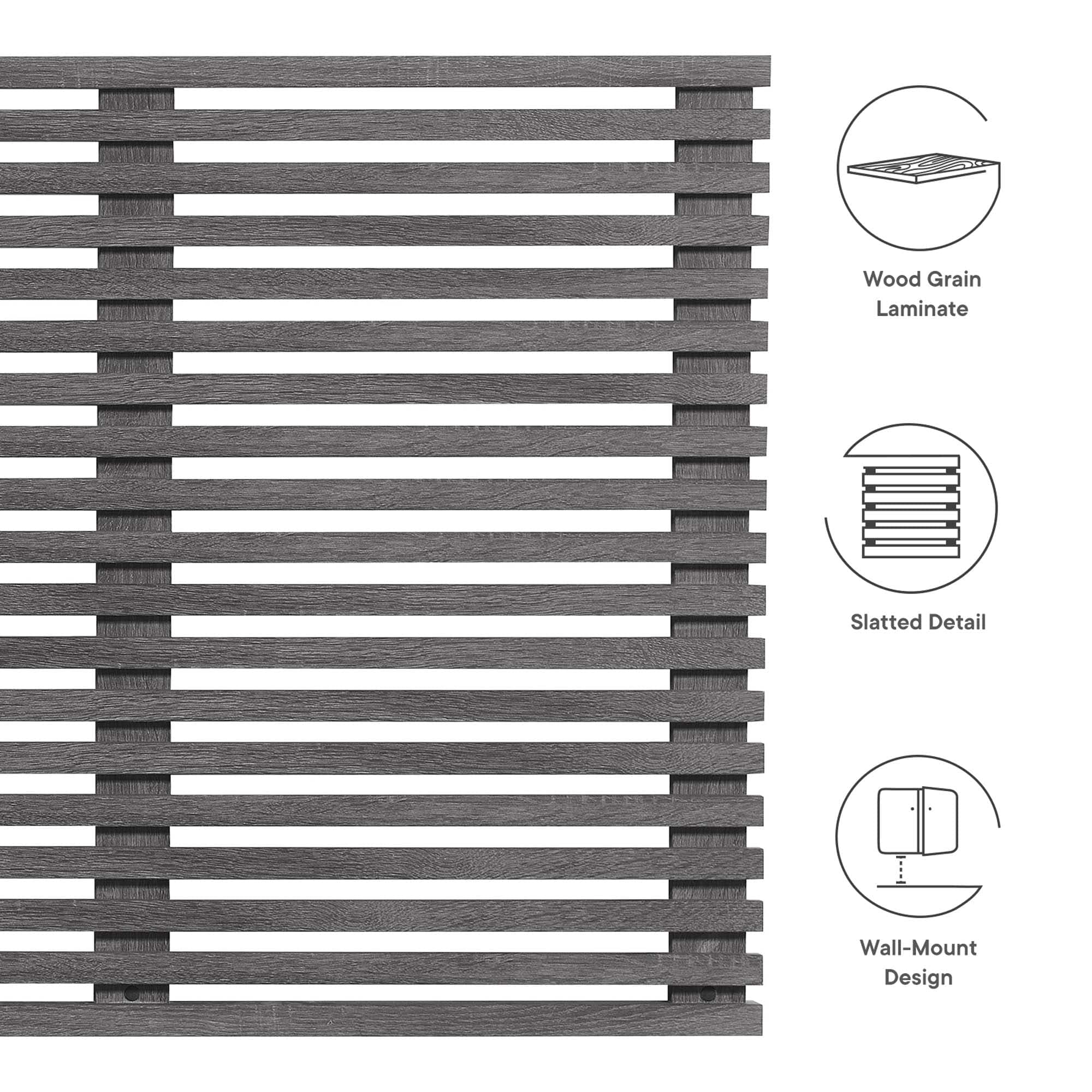 Embrace mid-century style with the Render Wall-Mount King Headboard. Slatted details make a statement in any bedroom. King size with durable particleboard panels and smooth wood grain laminate mounts for stability at your preferred height. Two wall-mounted headboard pieces. Overall Dimensions: 1.5" L x 79" W x 30.5" H. Some assembly required. Particleboard construction with wood grain laminate and slatted detail adds visual interest.