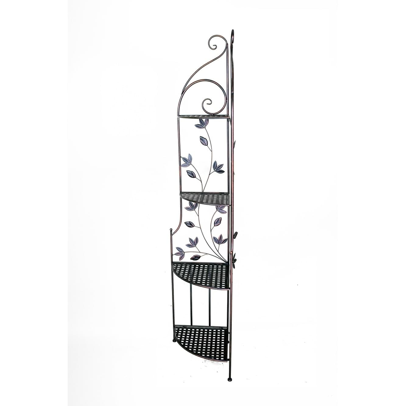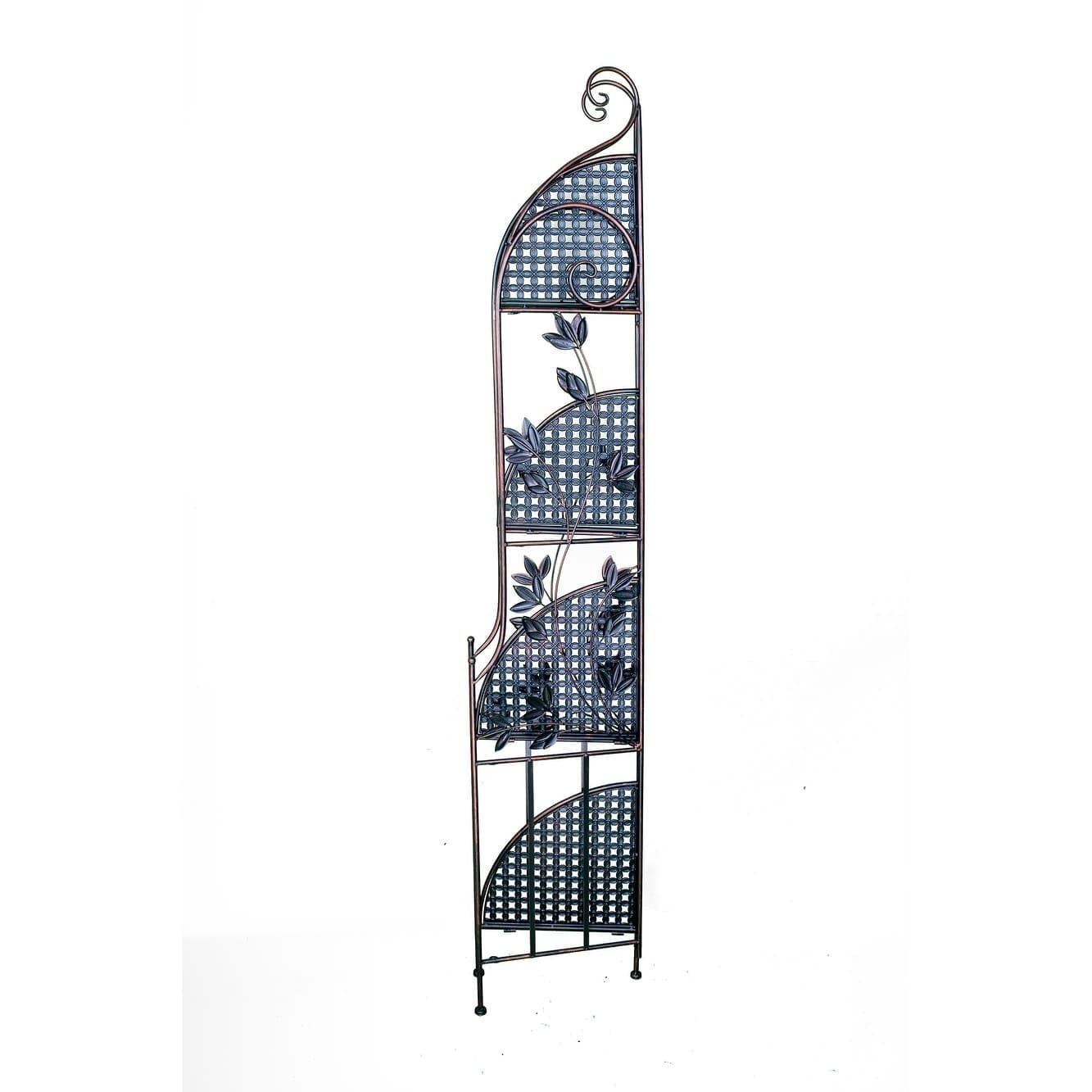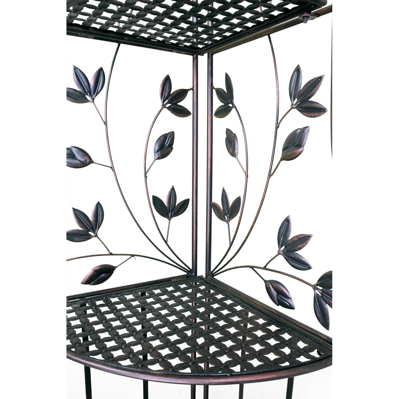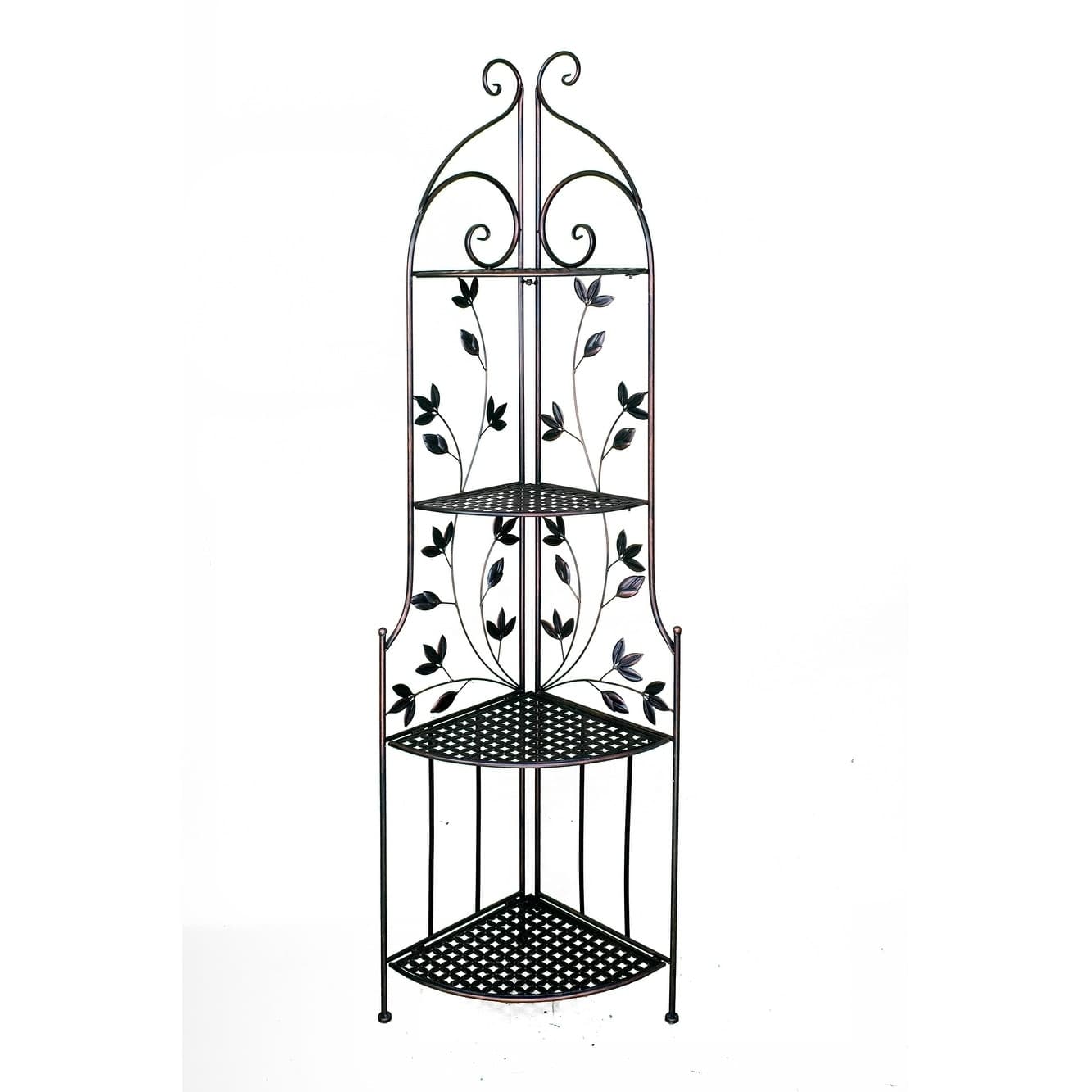 The Leaf Corner Bakers Rack offers open storage with four geometric shelves, each supporting up to 11 lbs. Vines with leafy designs climb the sides for an eye-catching style, finished in blackened copper.