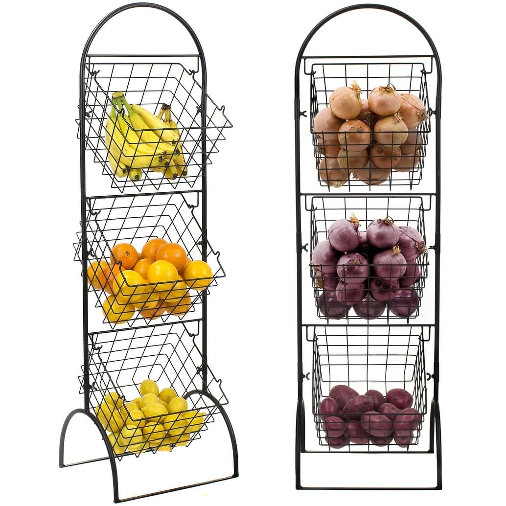 Enhance your kitchen organization and display your favorite produce with the Sorbus 3-Tier Wall Mounted Storage Rack. This functional and attractive solution includes three large baskets, ideal for keeping fruits, veggies, and other household items. The adjustable design lets you choose between a 1, 2, or 3-tier setup, and the detachable baskets allow for easy transfer of items to the counter. Made from sturdy steel with a sleek black finish, it is lightweight, simple to clean, and supports up to 44 pounds in total.