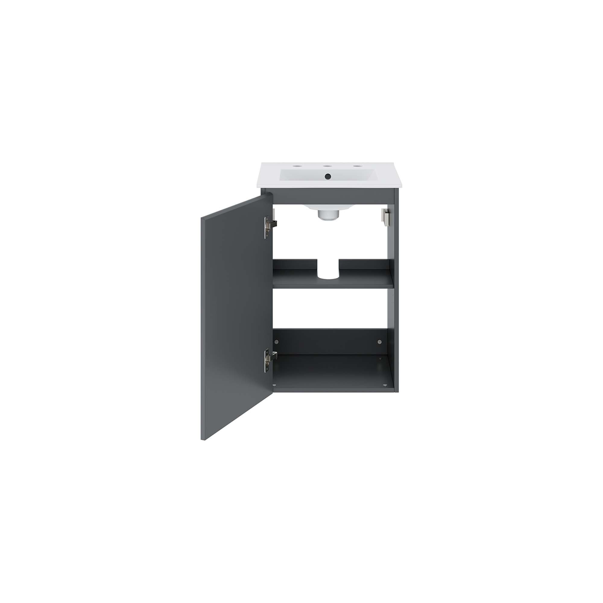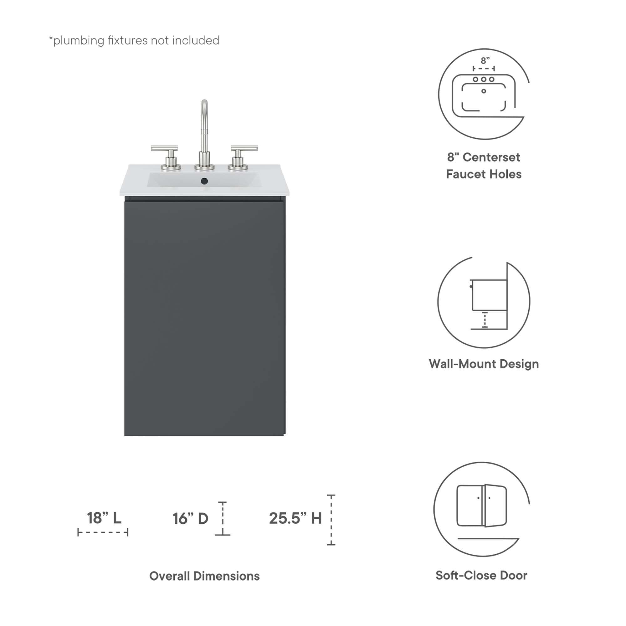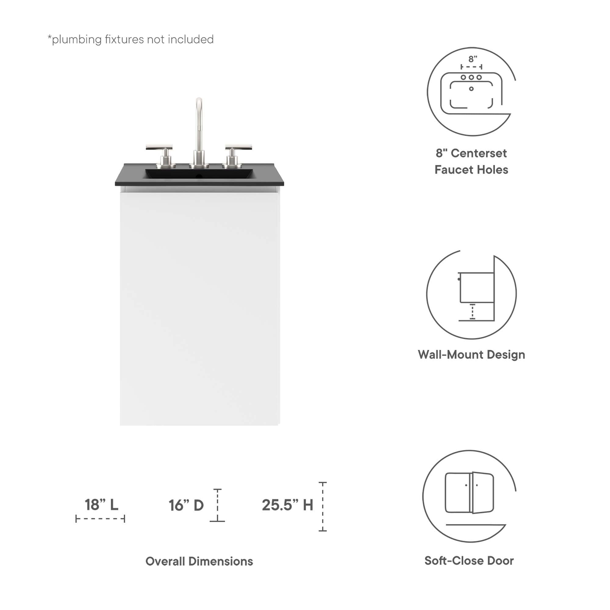 Bryn 18" Wall-Mount Bathroom Vanity offers a modern style with a sleek design and clean lines. Built with durable particleboard and melamine, it mounts to the wall, providing ample storage behind two soft-close doors beneath the sink. It includes a cut-out for plumbing and features a ceramic sink basin with integrated countertop and 8-inch centerset holes. Fixtures are not included, and assembly is required.