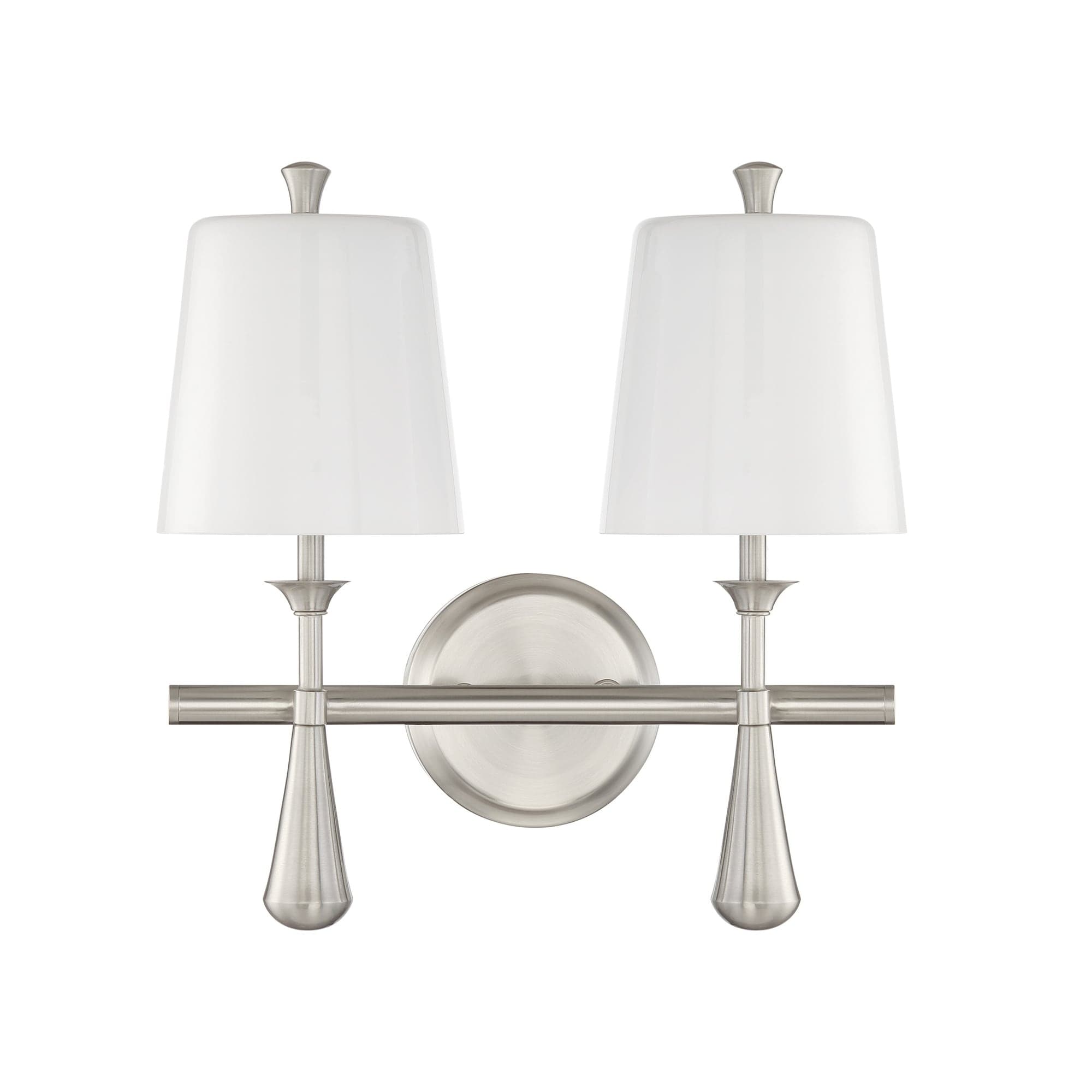 Crafted from steel, this light fixture comes with frosted glass shades and is suitable for damp locations. This product is backed by a Craftmade 1-year limited warranty. It measures 14-1/8 inches in height, 14-1/4 inches in width, and extends 7-5/8 inches. Weighs 4.78 lbs with shade dimensions of 5-11/16 inches in height and 5-1/2 inches in width. Backplate dimensions are 5 inches by 5 inches with a 1-inch depth. Supports max wattage of 120 watts, requires 2 bulbs rated at 60 watts each, using a candelabra (E12) base voltage of 120 volts. Bulbs not included.