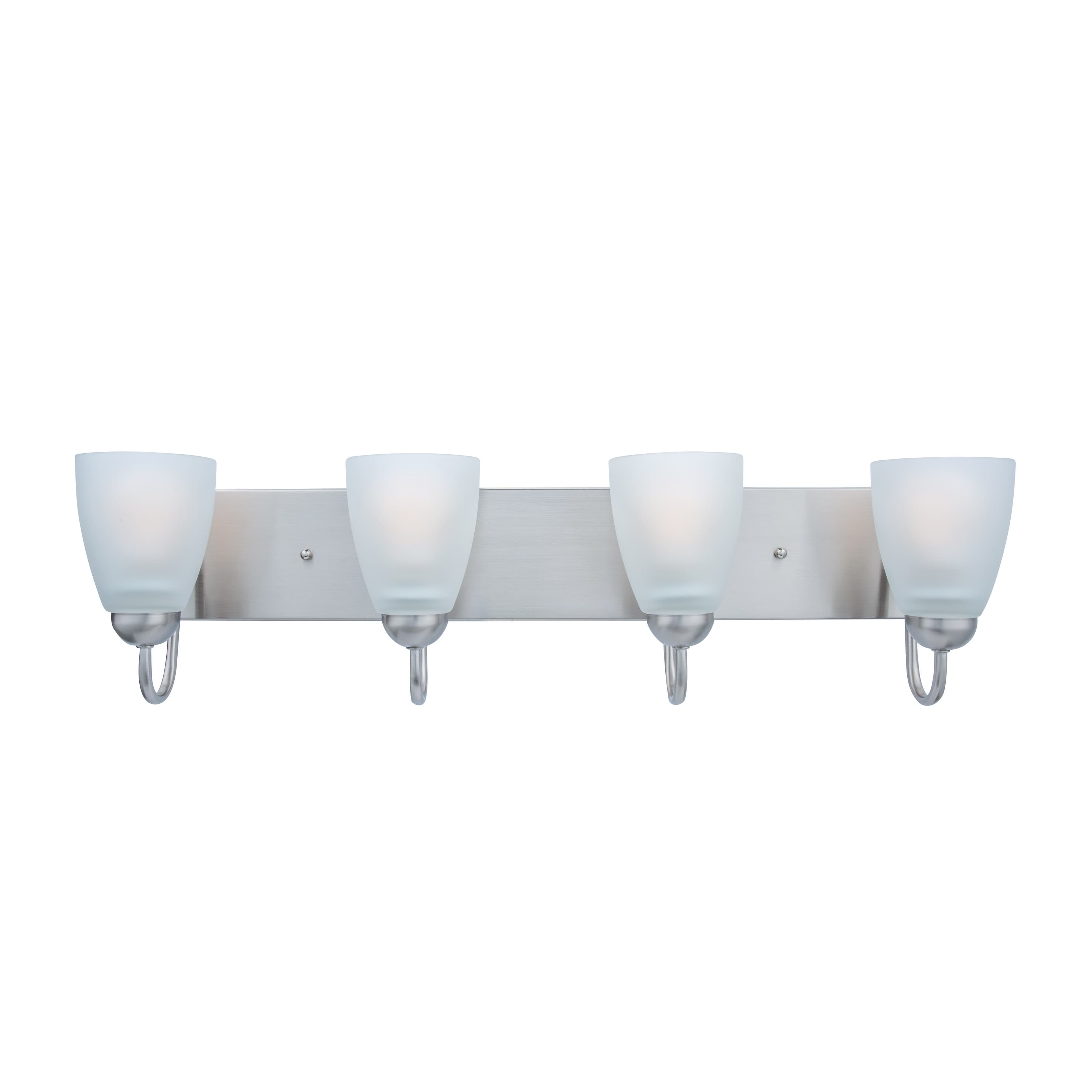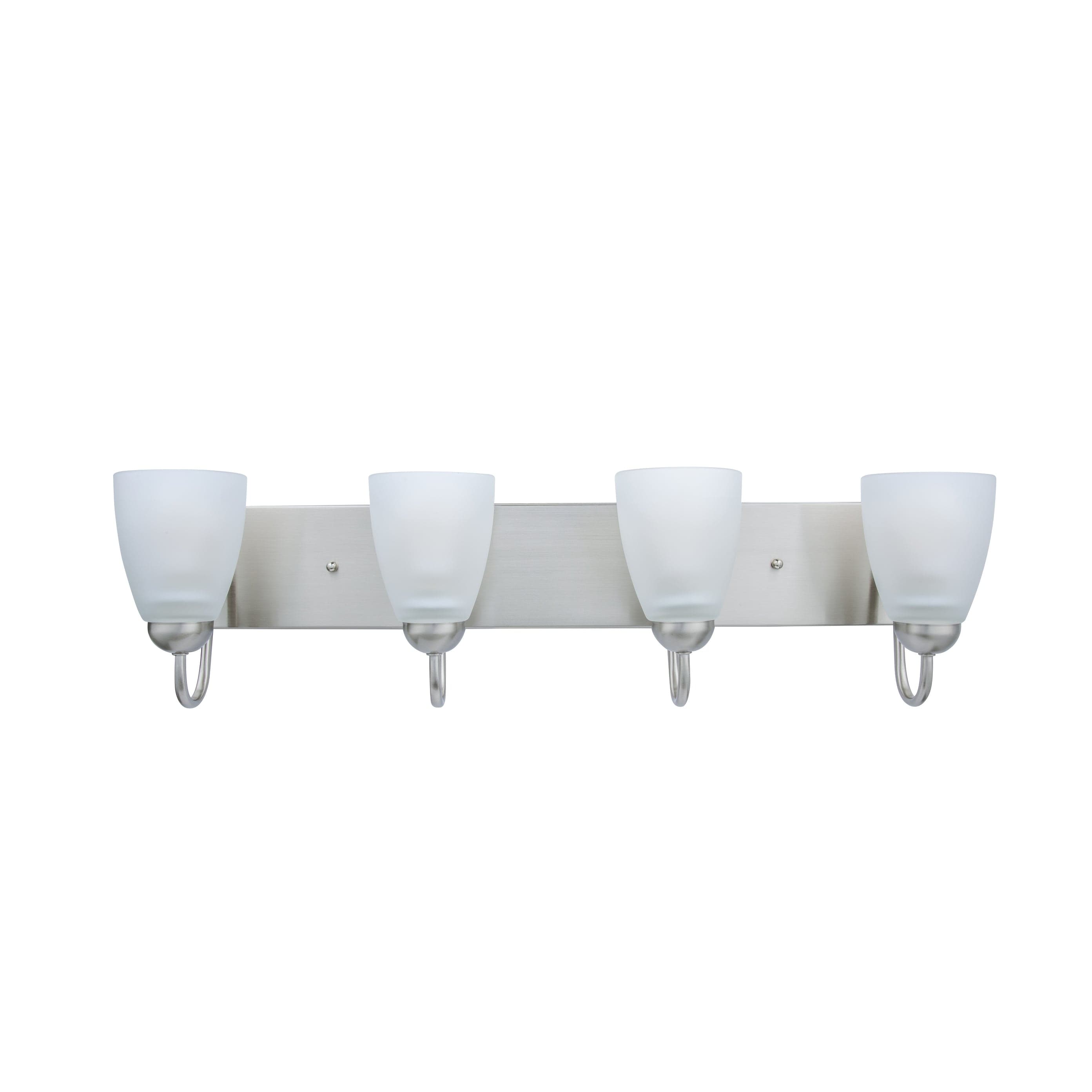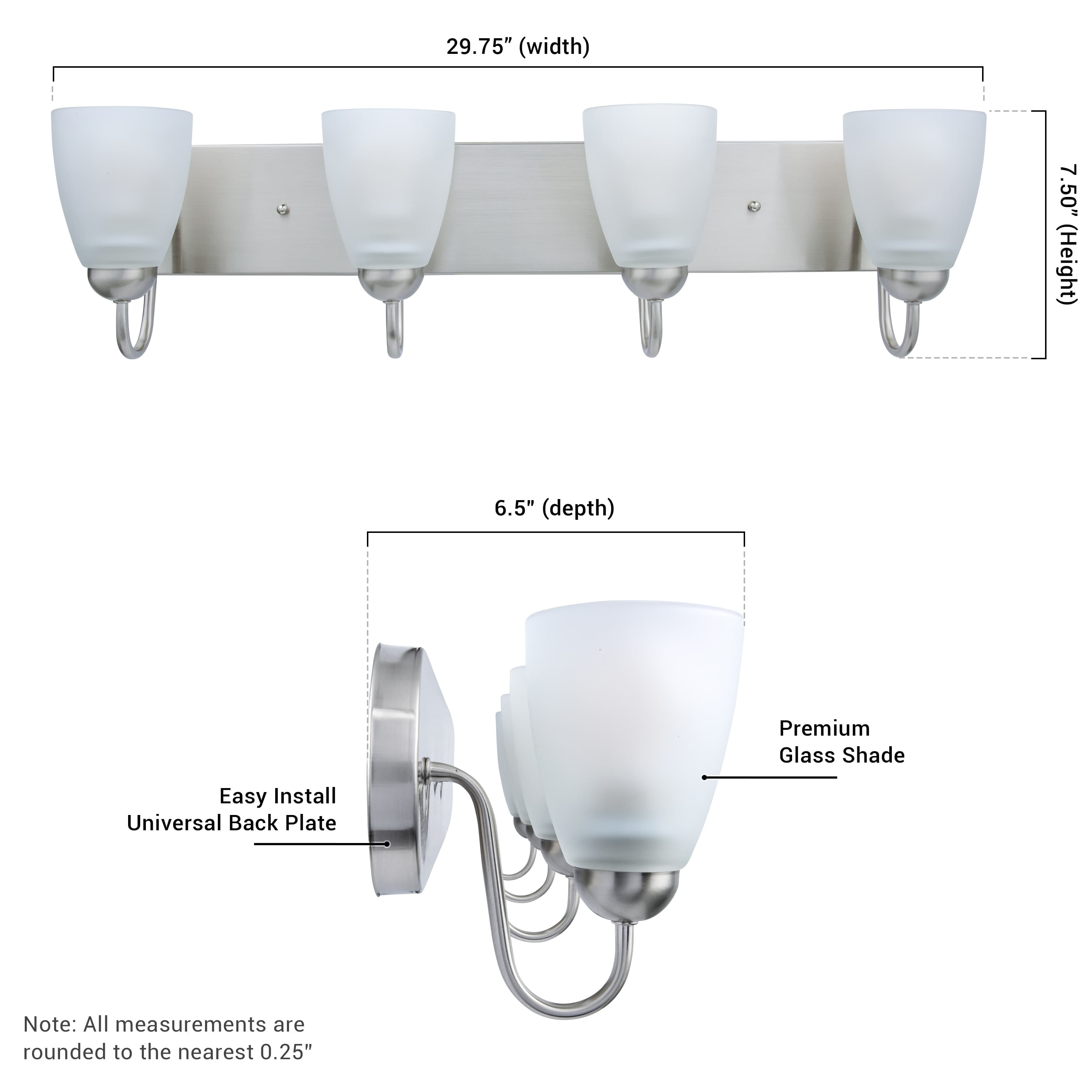 This stylish stainless silver vanity light features four dimmable bulb spots. It fits both traditional and modern aesthetics with an elegant stainless and silver finish. The white glass shade accommodates medium-base bulbs up to 60W, which are not included. Compatible with a separately sold dimmer switch for customizable lighting.