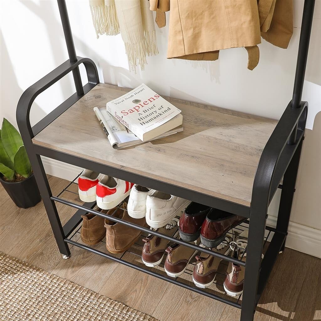 Introducing an industrial element to your entryway, the VASAGLE DAINTREE combines a coat rack, shoe bench, and hall tree in one. Its robust steel frame and quality particleboard provide durable storage with style. The greige and black scheme complements various decor styles. The bench supports a maximum static load of 198 lb, while the hanging rod and each mesh shelf support up to 22 lb each. Additionally, each hook can hold up to 6.6 lb.