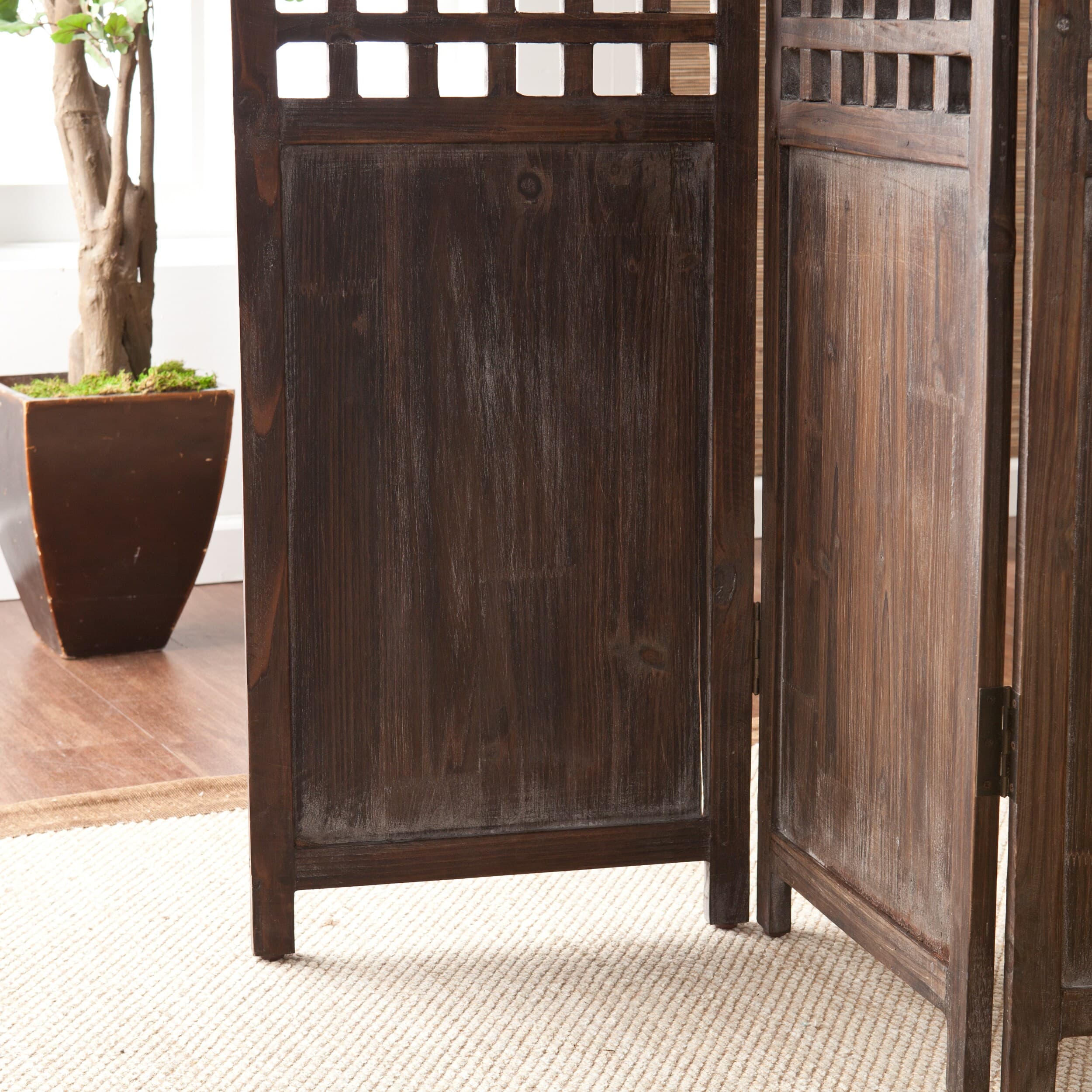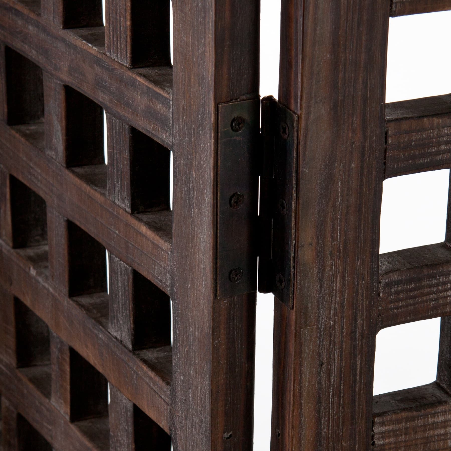 Redefine any room with a charming room divider. Ideal for adding a new space, it features a weathered walnut finish and contemporary design. Its panels feature solid bottoms and top sections with square cutouts in a modern grid pattern. This divider complements transitional to contemporary décor and offers distinction where needed.