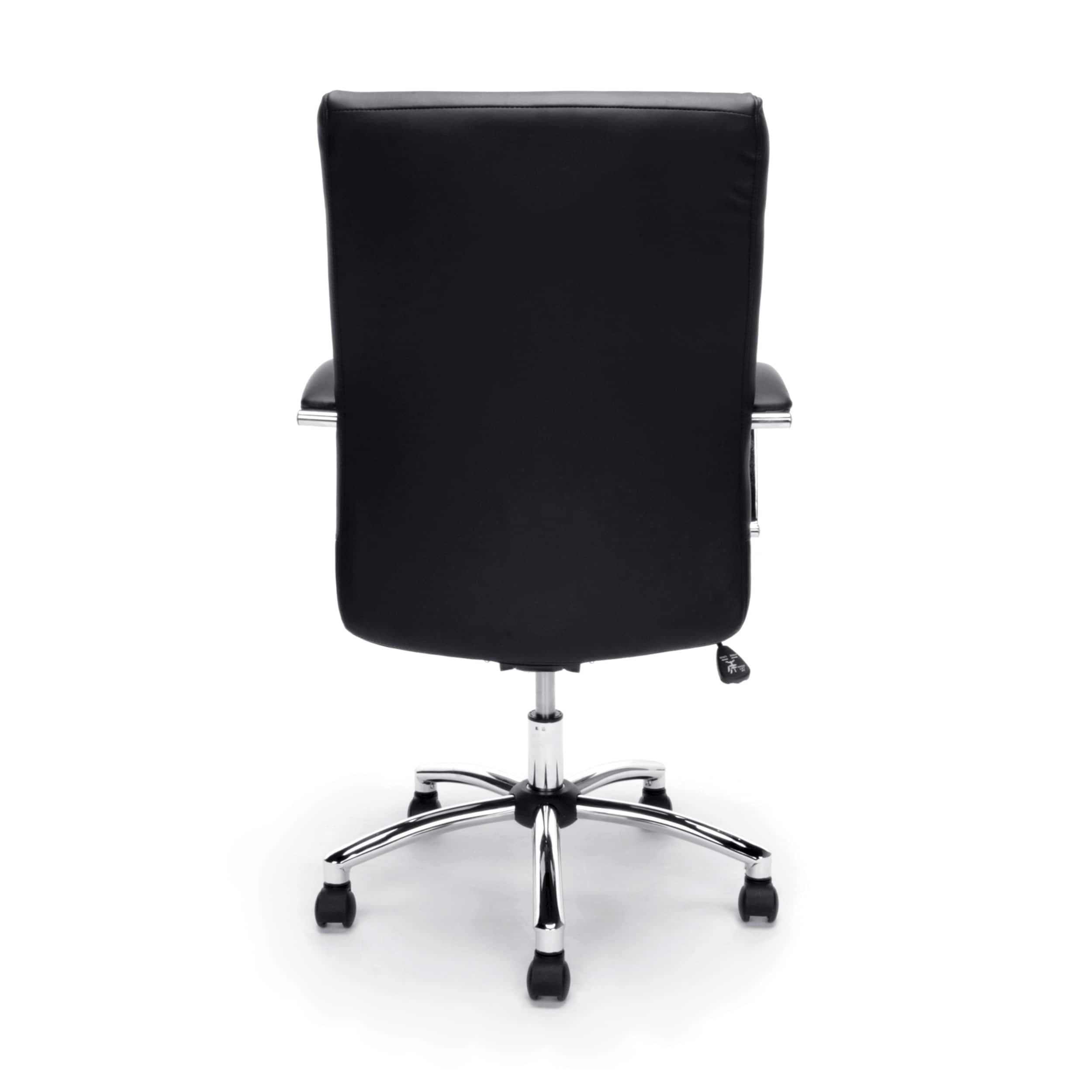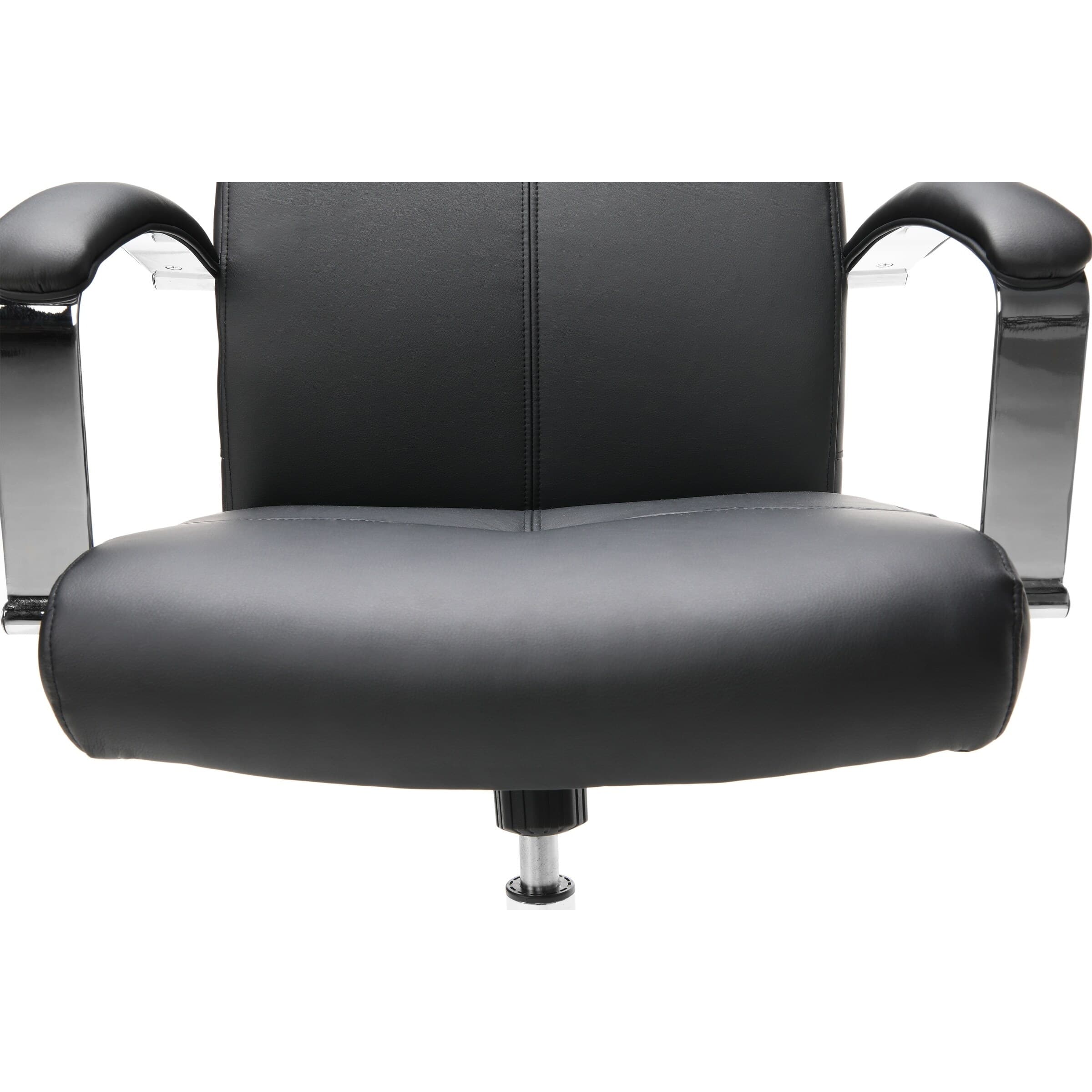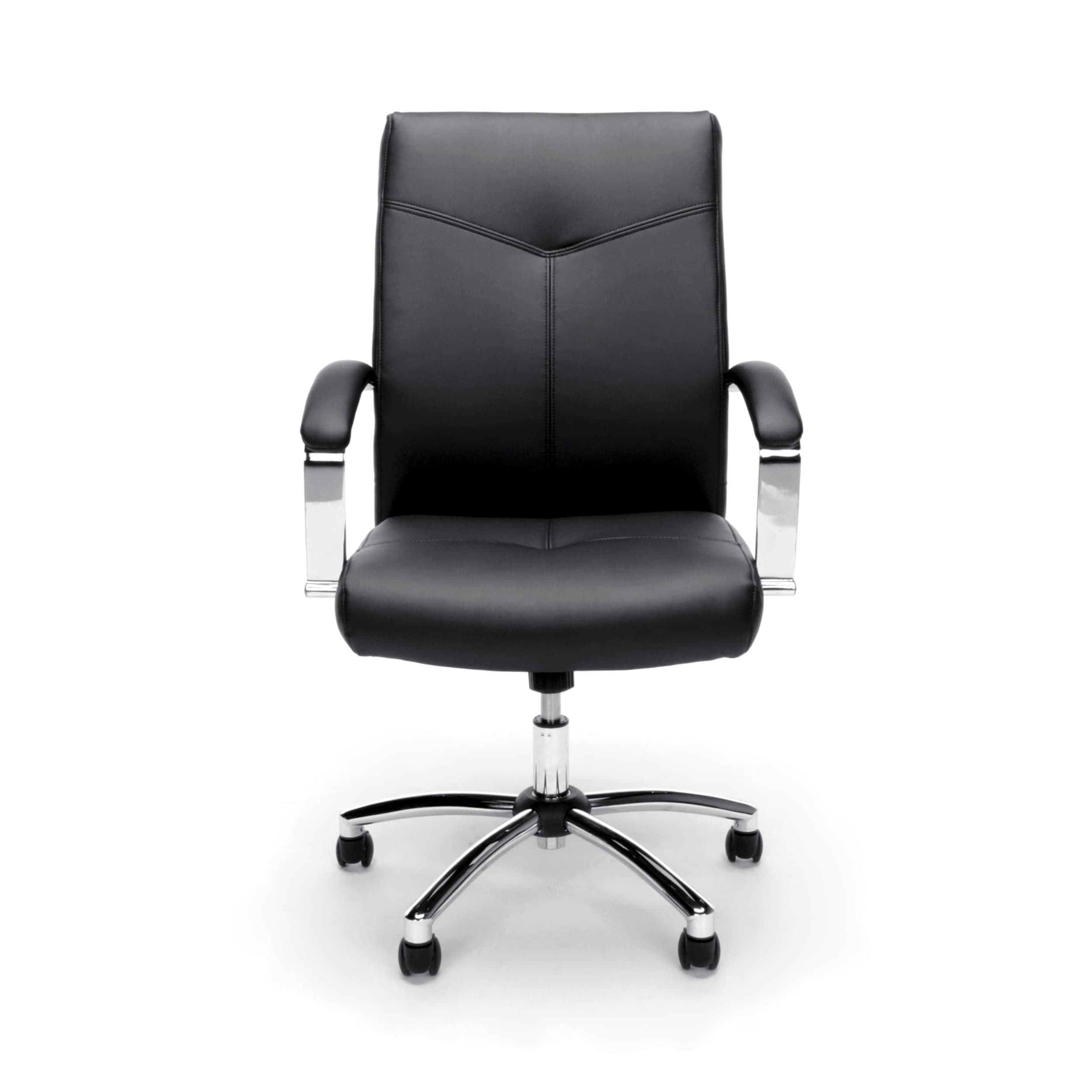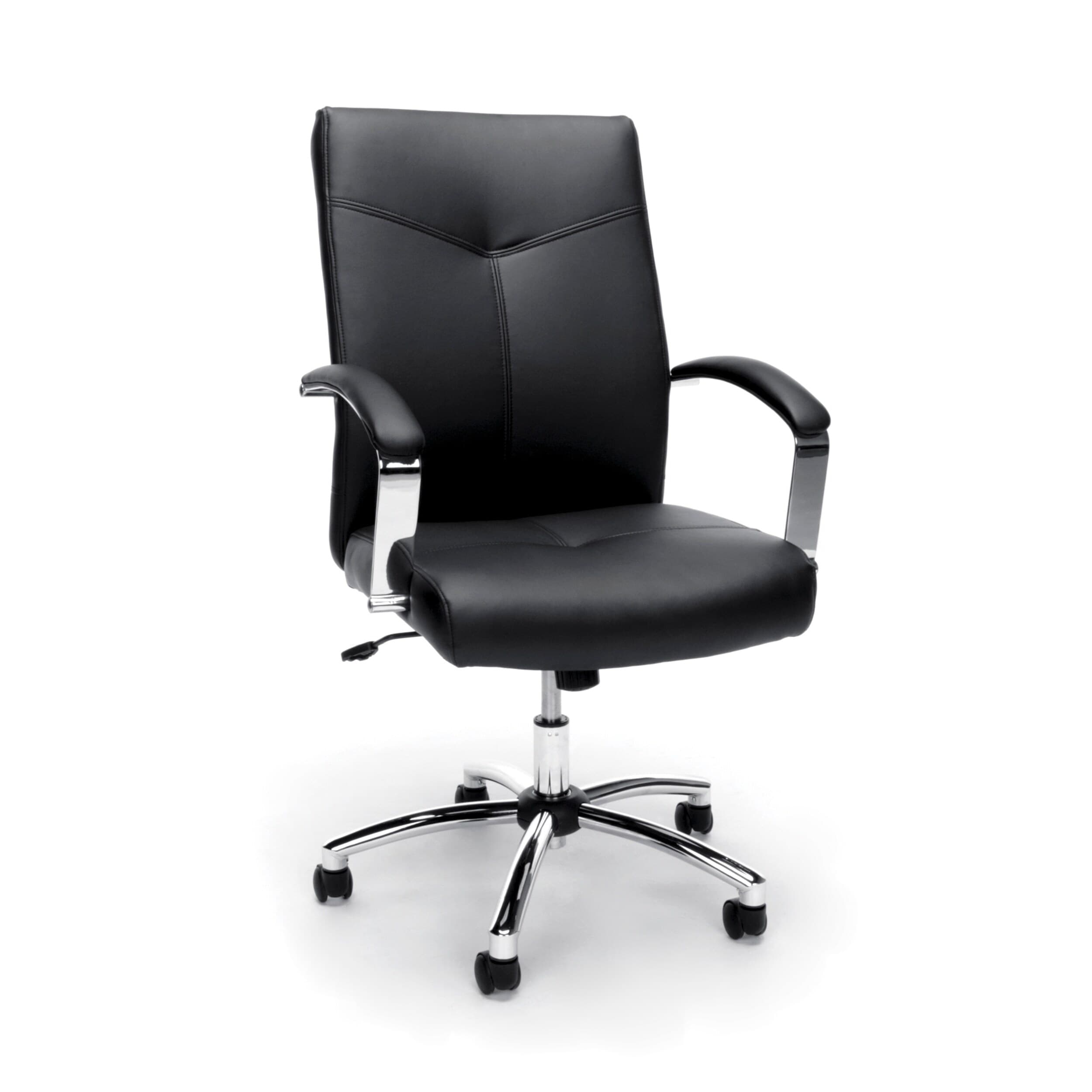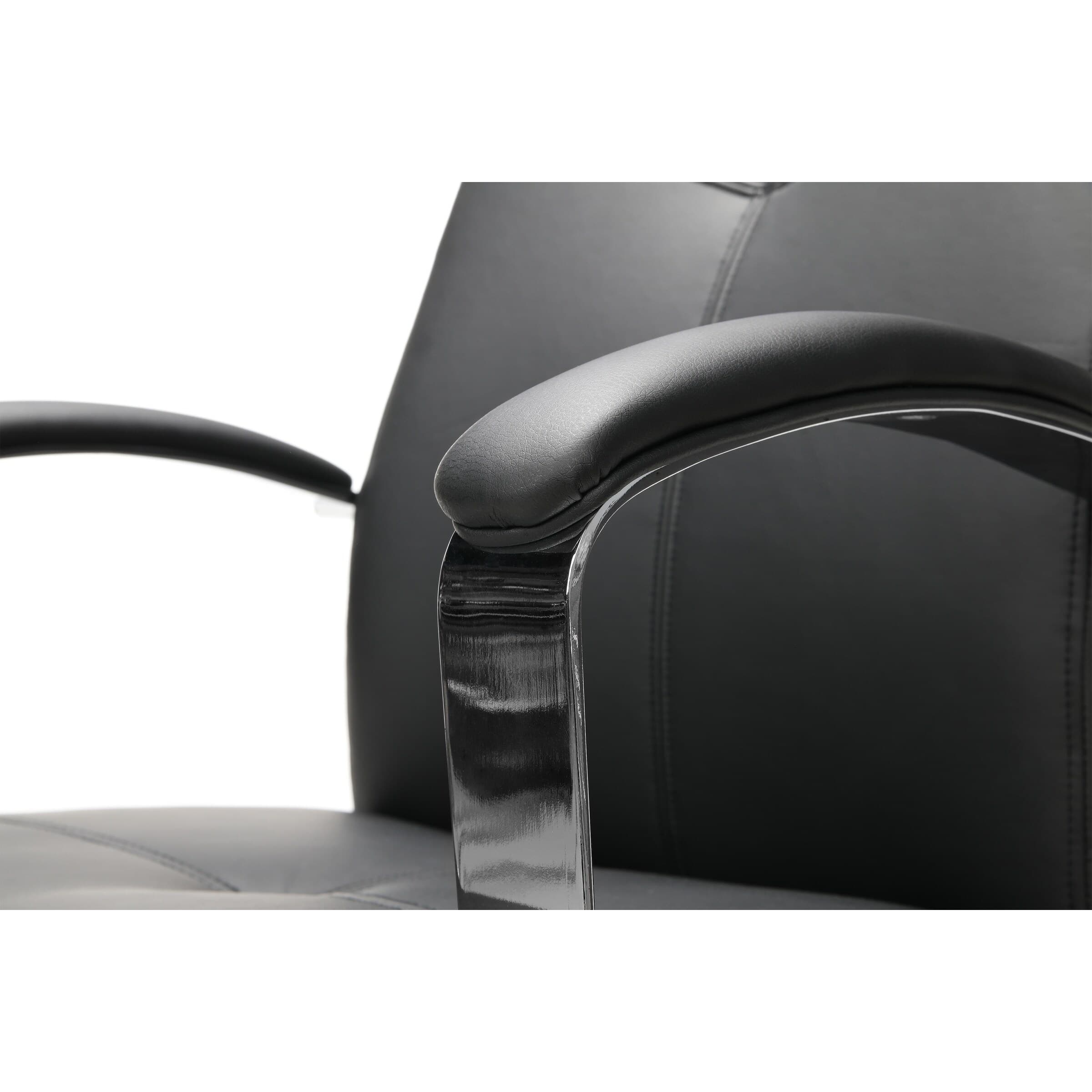 Where quality meets affordability, the Essentials seating collection by OFM offers this E1003 executive office chair with luxurious SofThread leather and chrome detailing to uplift any office or workspace decor. Engineered for comfort with high-back padding and built-in lumbar support, it provides complete body support. Equipped with a sturdy wheeled base for mobility, it offers pneumatic seat height adjustment, tilt tension, and lock for personalized settings. Padded chrome arms enhance its sophisticated design. Backed by a 5-Year Limited Warranty from OFM Essentials.