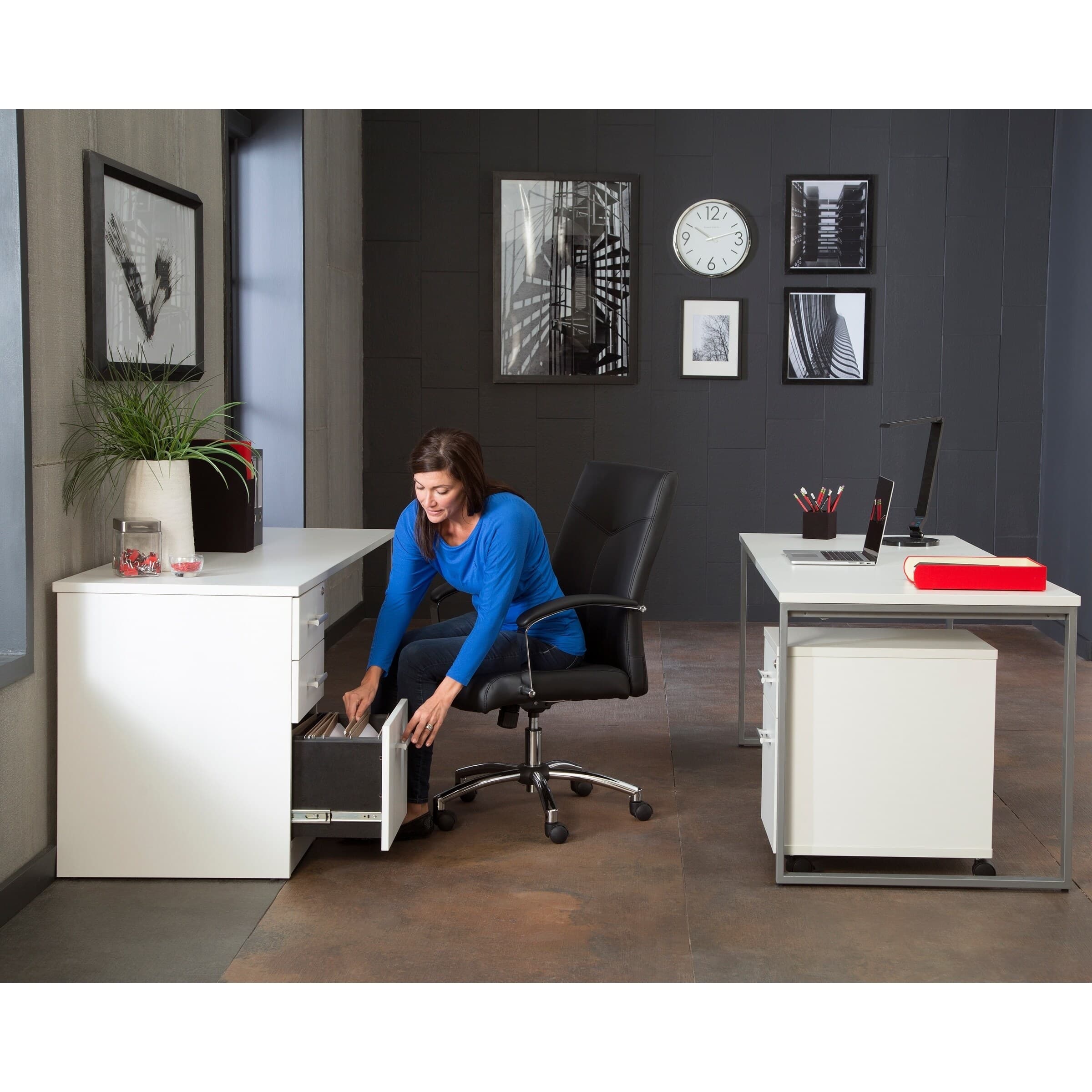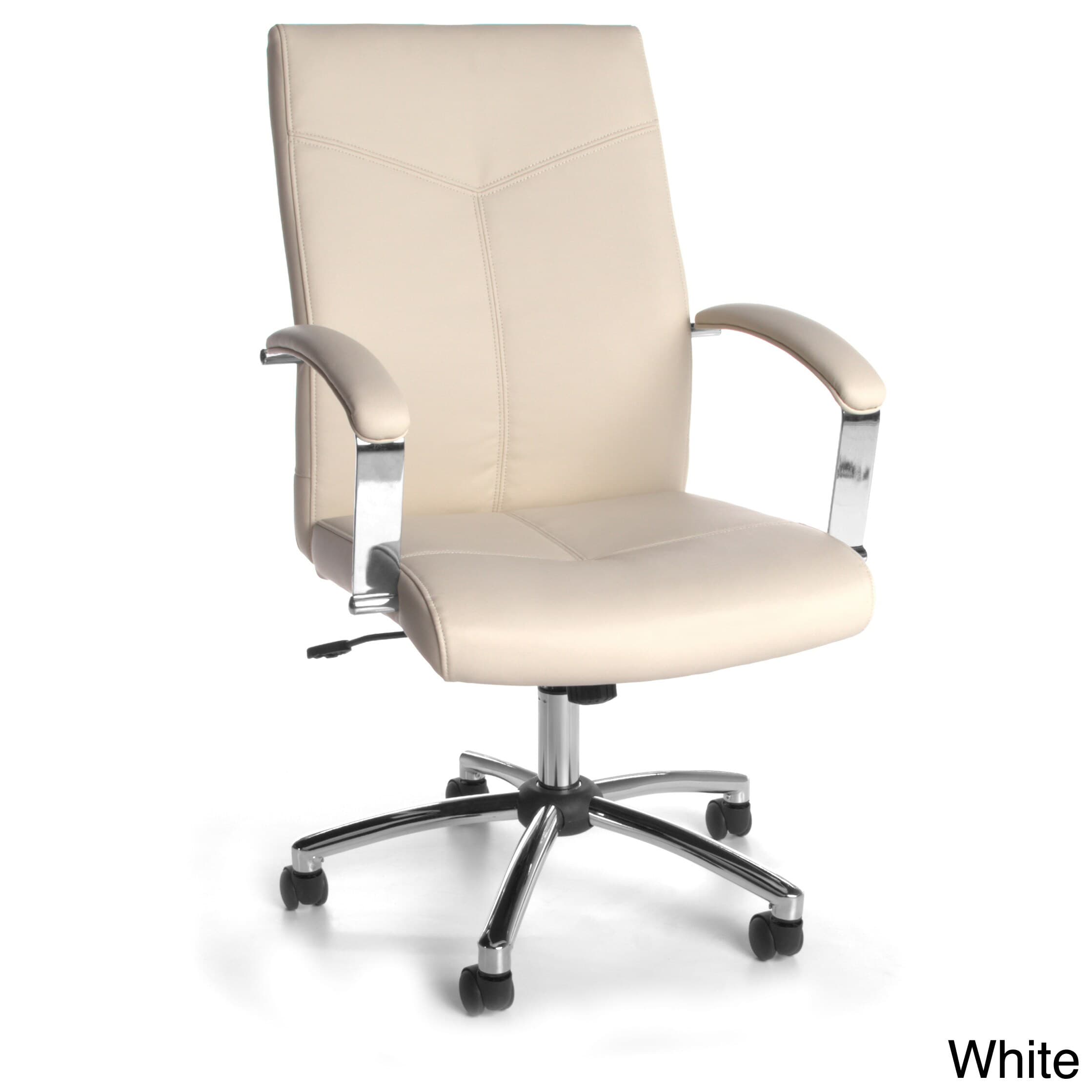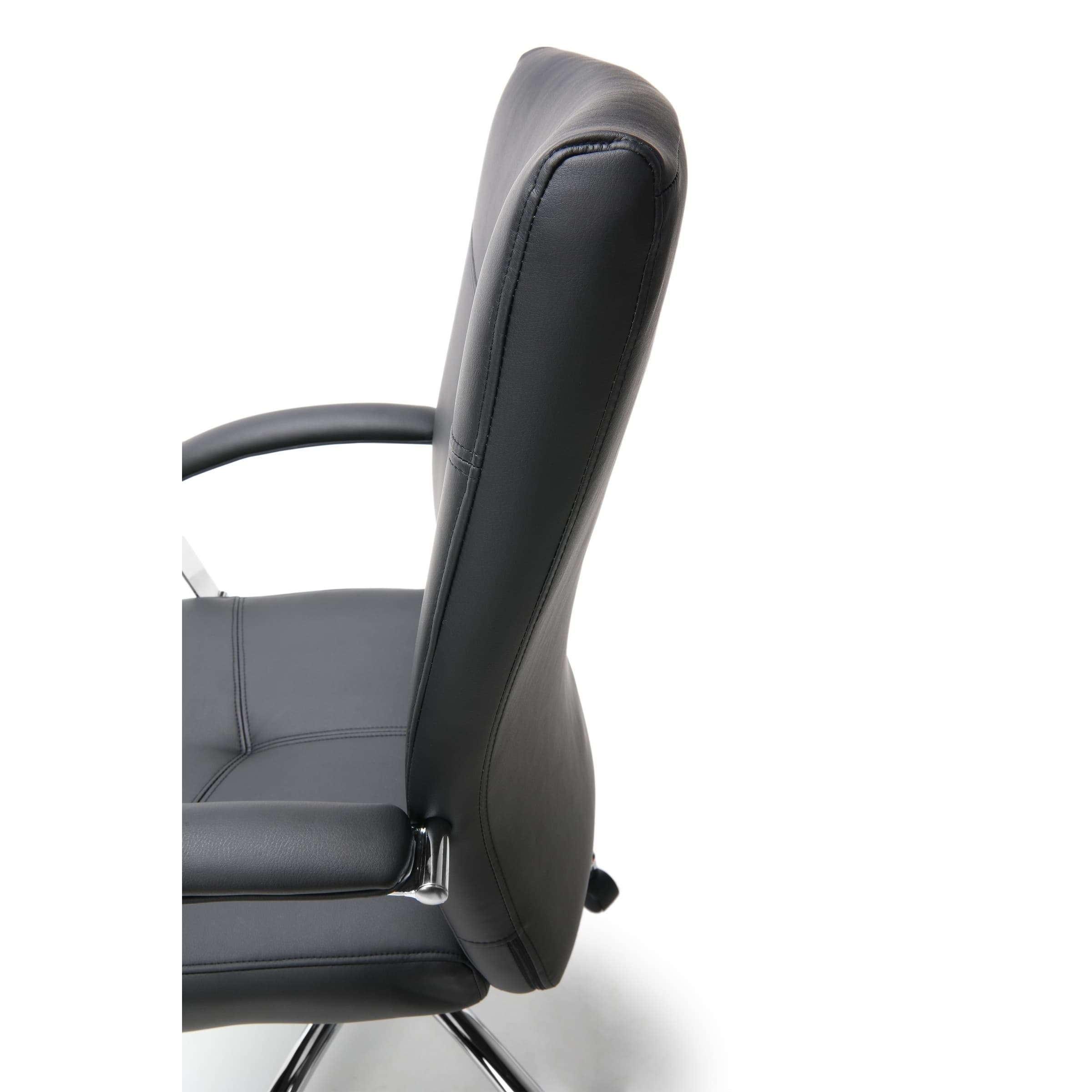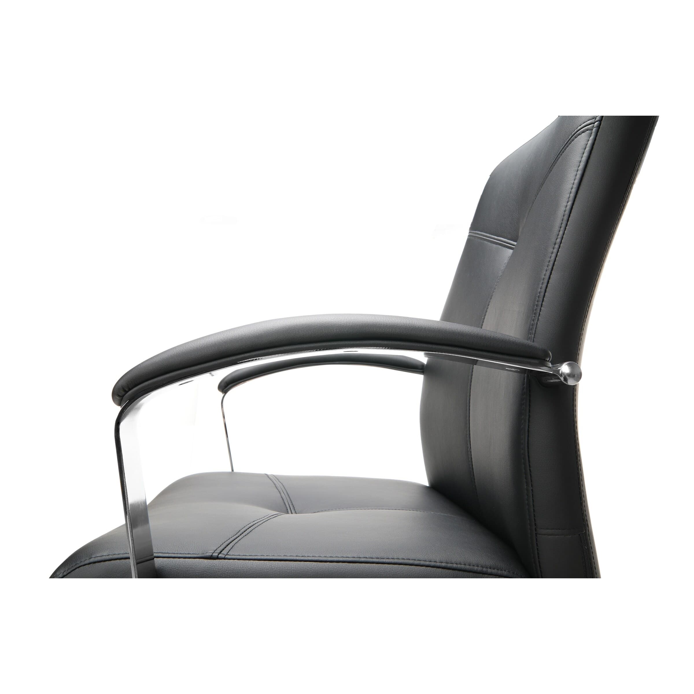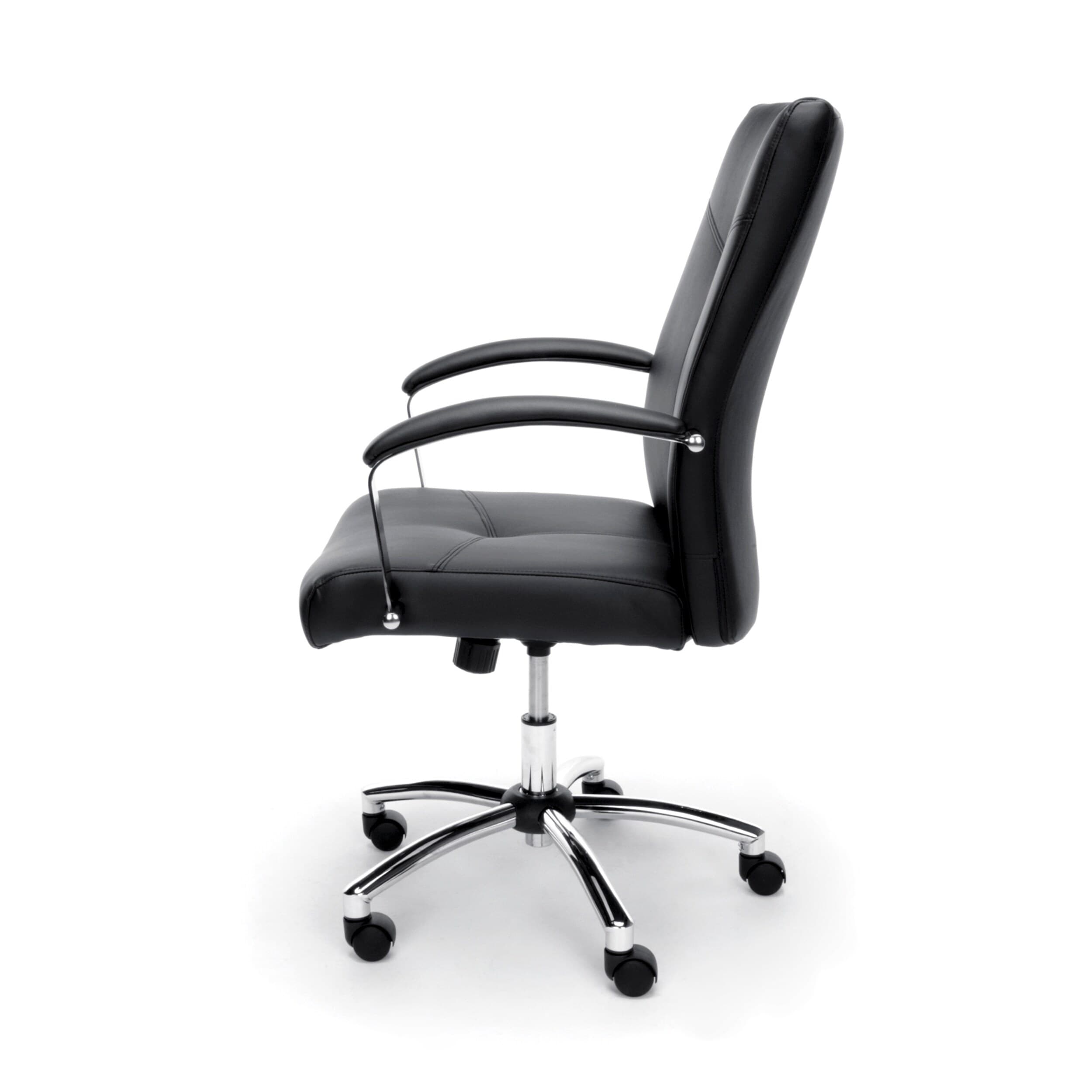 Where quality meets affordability, the Essentials seating collection by OFM offers this E1003 executive office chair with luxurious SofThread leather and chrome detailing to uplift any office or workspace decor. Engineered for comfort with high-back padding and built-in lumbar support, it provides complete body support. Equipped with a sturdy wheeled base for mobility, it offers pneumatic seat height adjustment, tilt tension, and lock for personalized settings. Padded chrome arms enhance its sophisticated design. Backed by a 5-Year Limited Warranty from OFM Essentials.