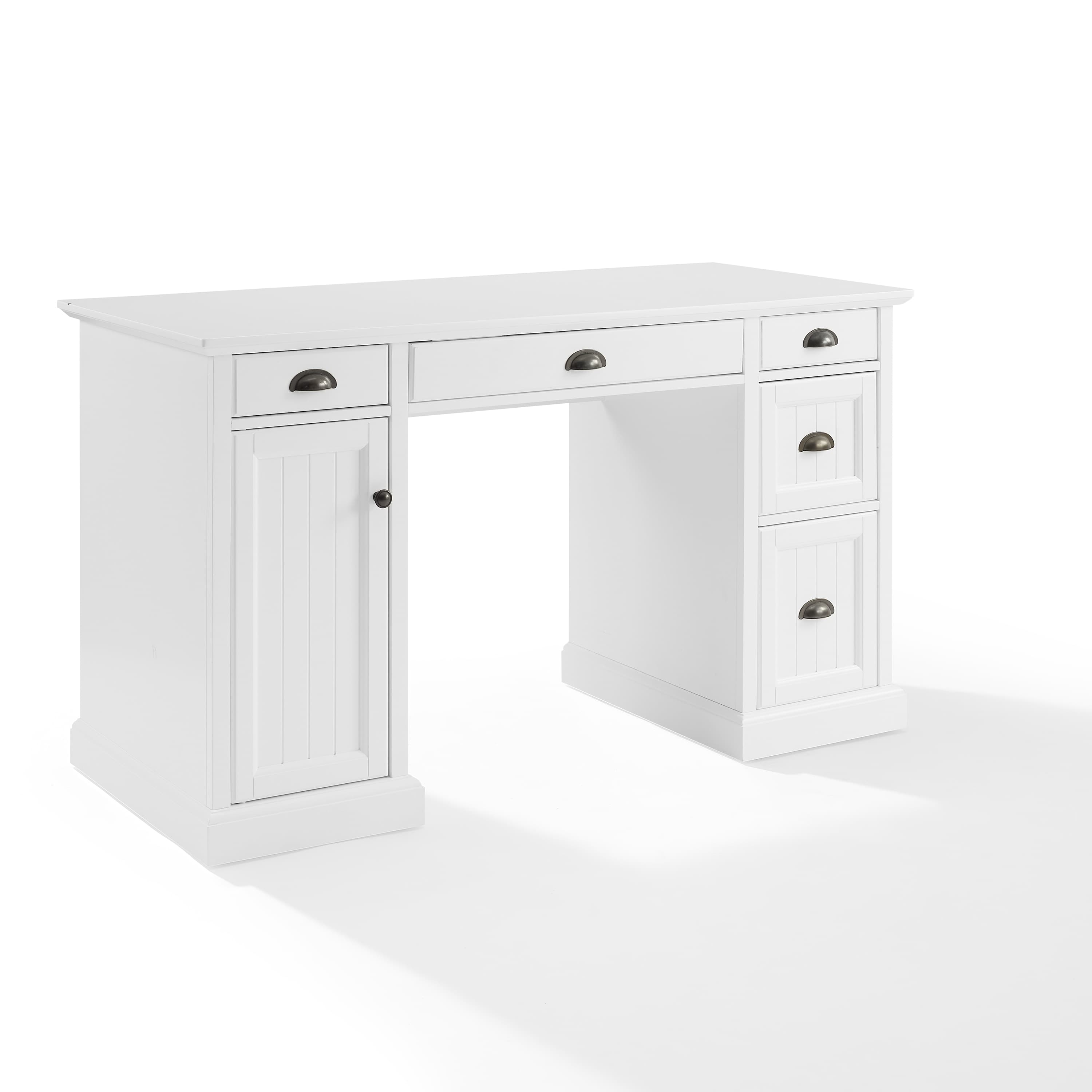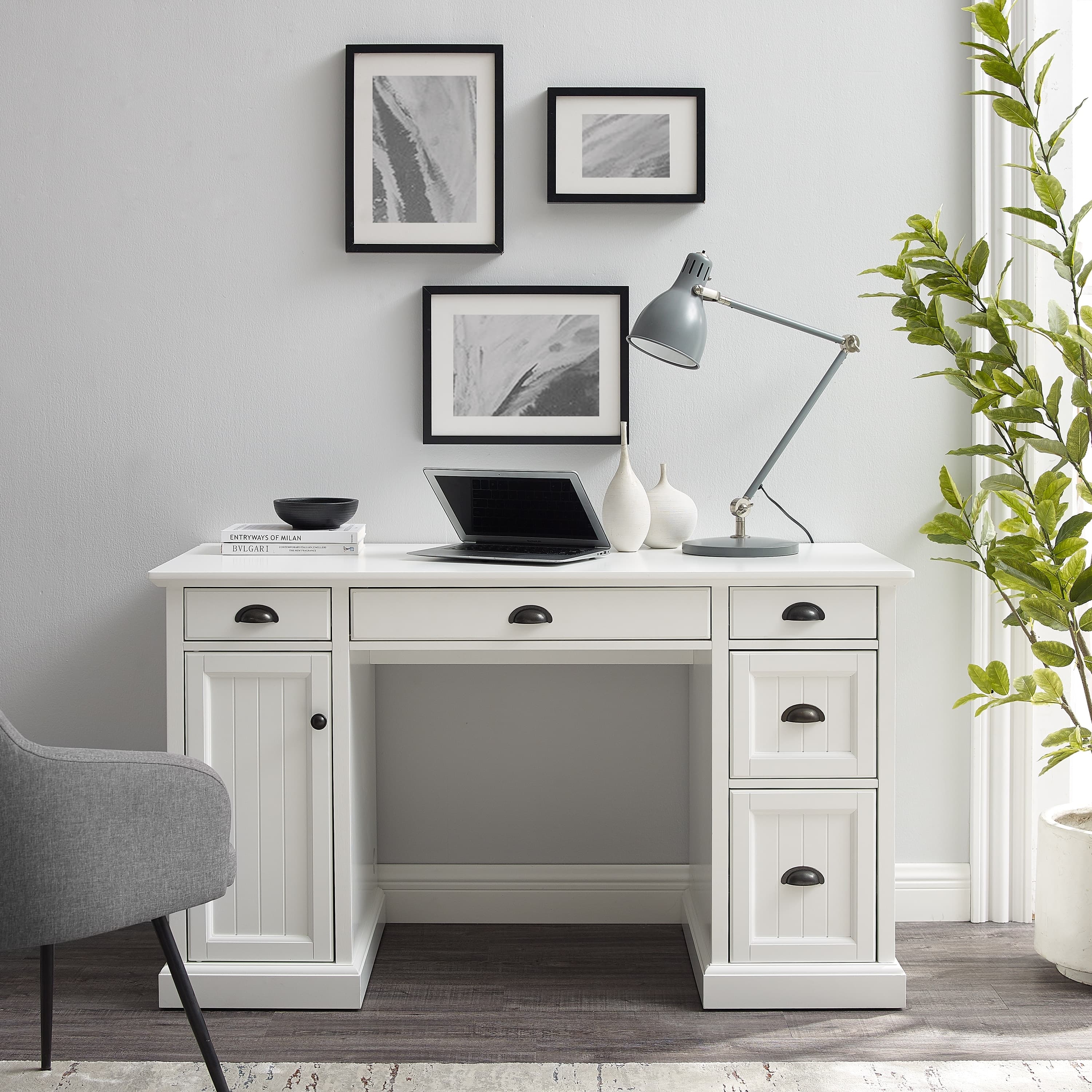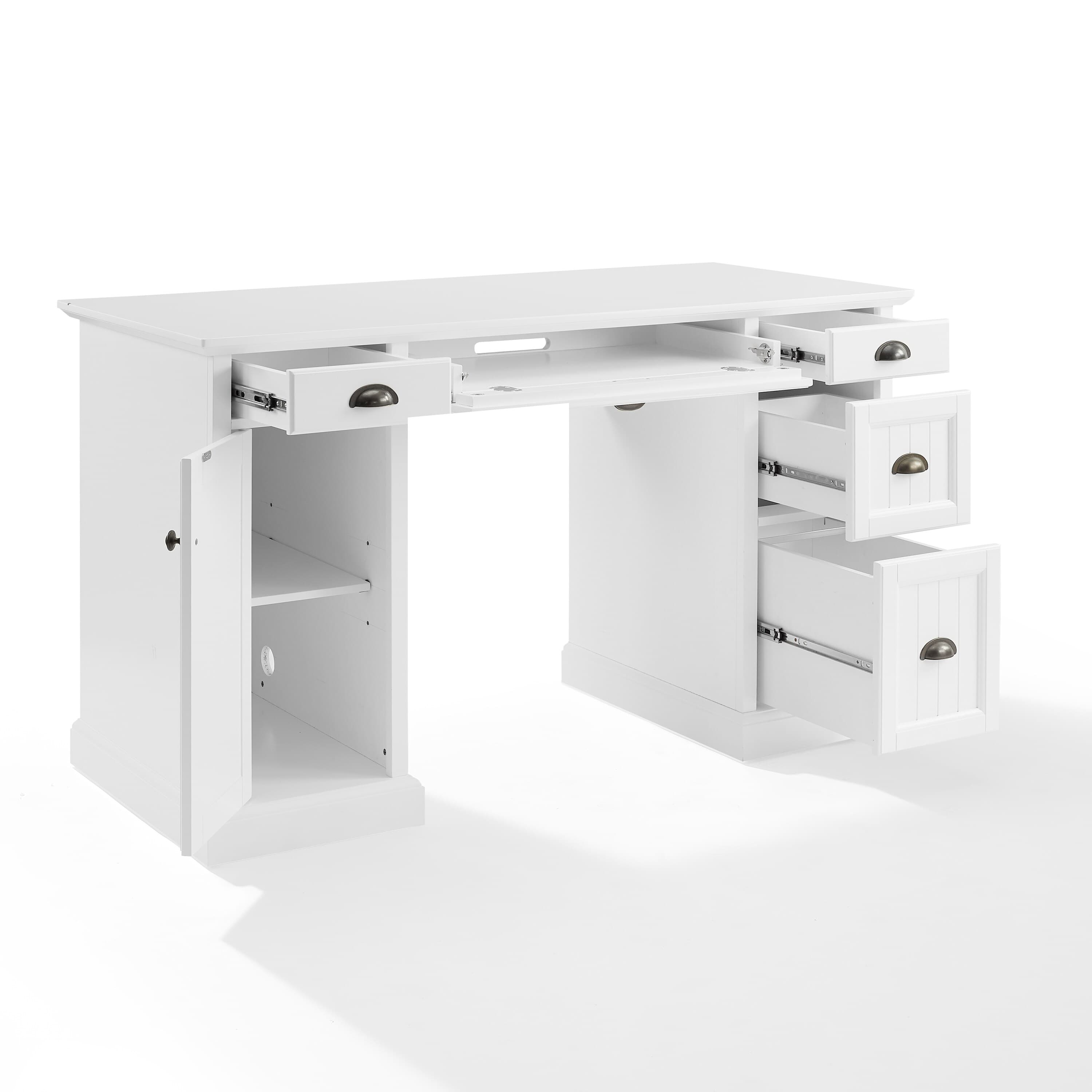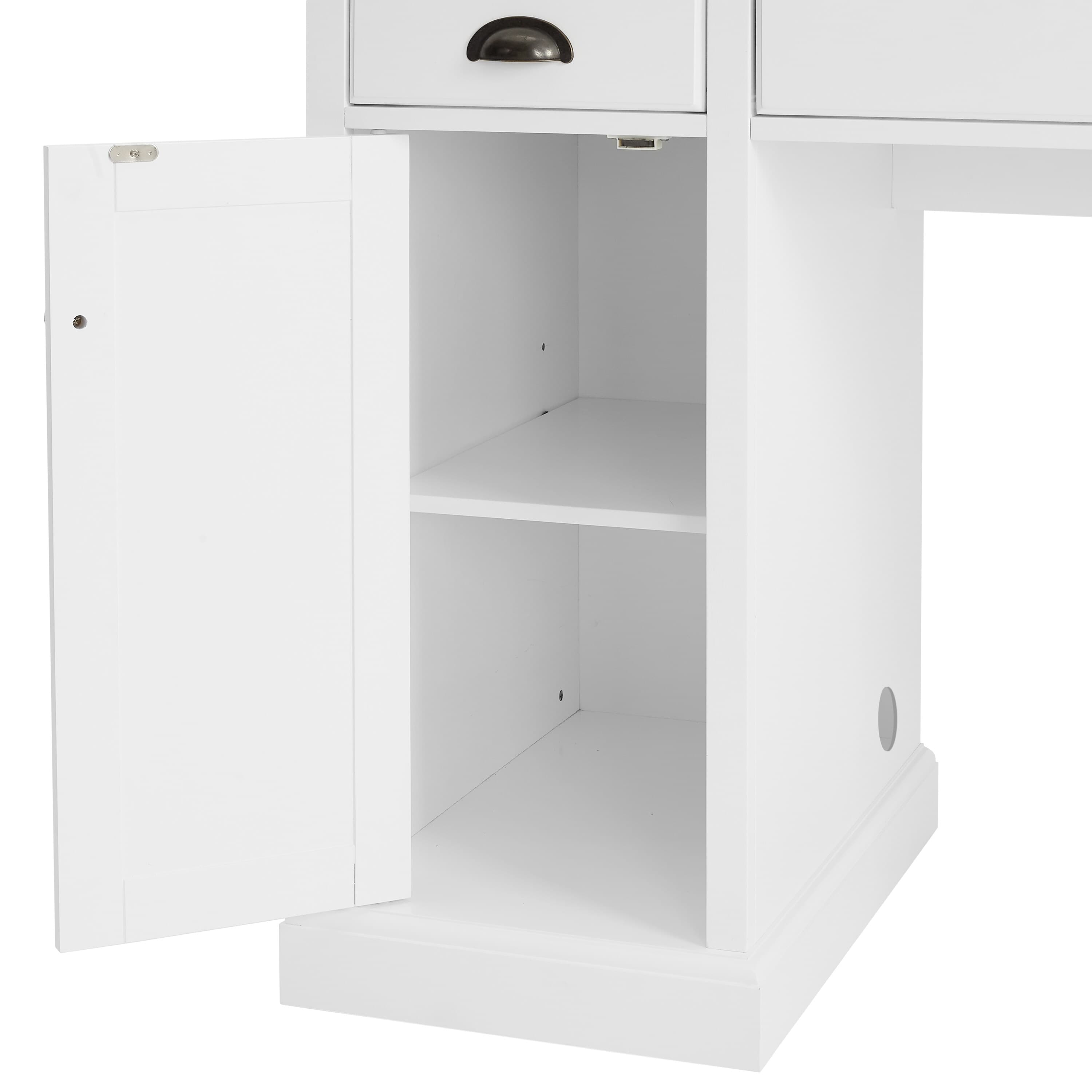 The Shoreline Computer Desk embodies coastal style and provides ample storage space. Key features include a drop-down keyboard tray and a cabinet for a computer tower, making it ideal for telecommuters. It features three storage drawers with full-extension glides and a large file cabinet drawer to organize documents. Decorative details like half-cup hardware and beadboard paneling enhance its aesthetic. The desk includes a white finish, classic half-cup pull hardware in antique bronze, and five full-extension drawers with ball-bearing glides. A large file drawer includes rails for both standard letter and A4 papers. The center drawer doubles as a keyboard tray. The side cabinet can house a standard computer tower with removable shelving and has a cable management opening. Offers ample workspace and adjustable leg levelers, suiting modern farmhouse and traditional decor.