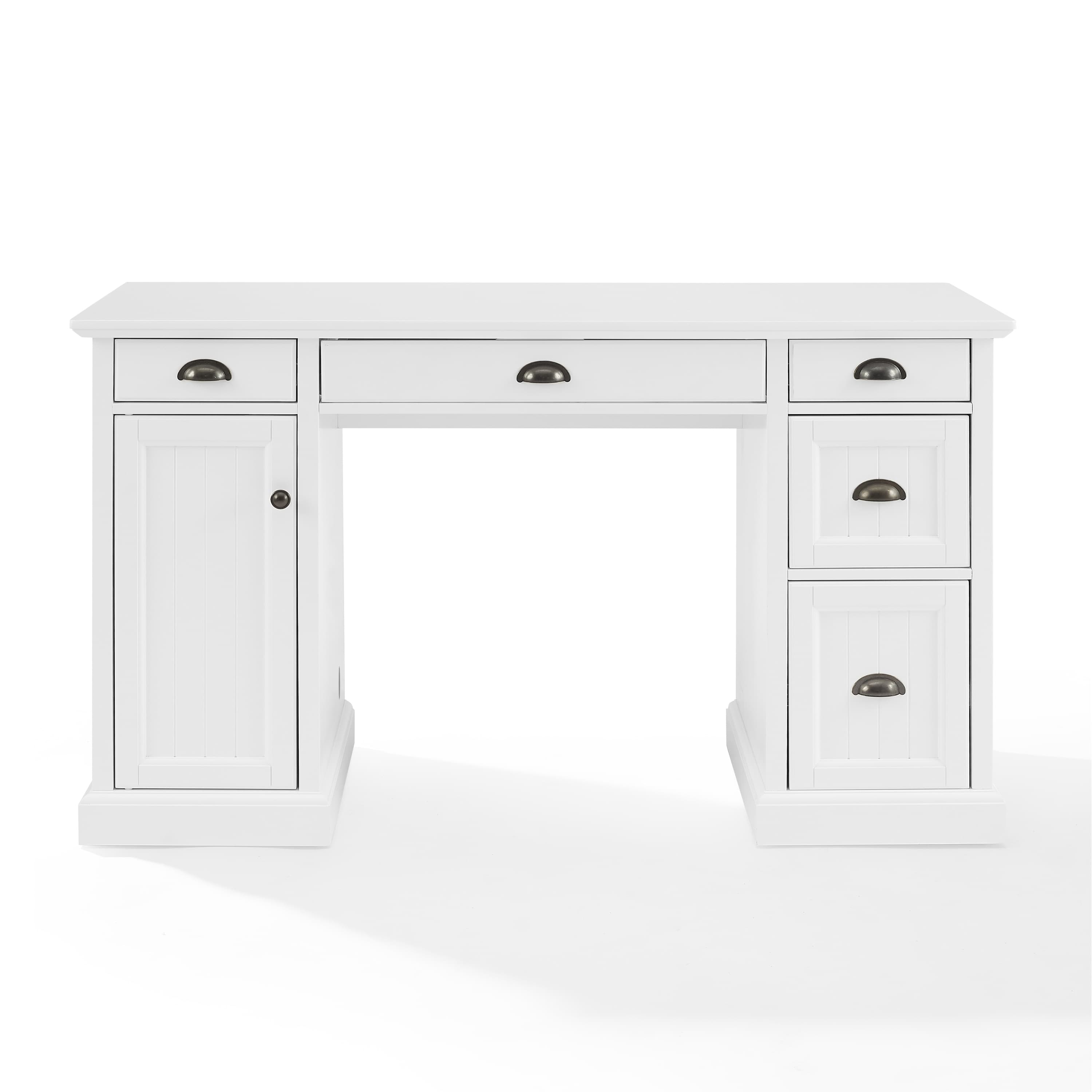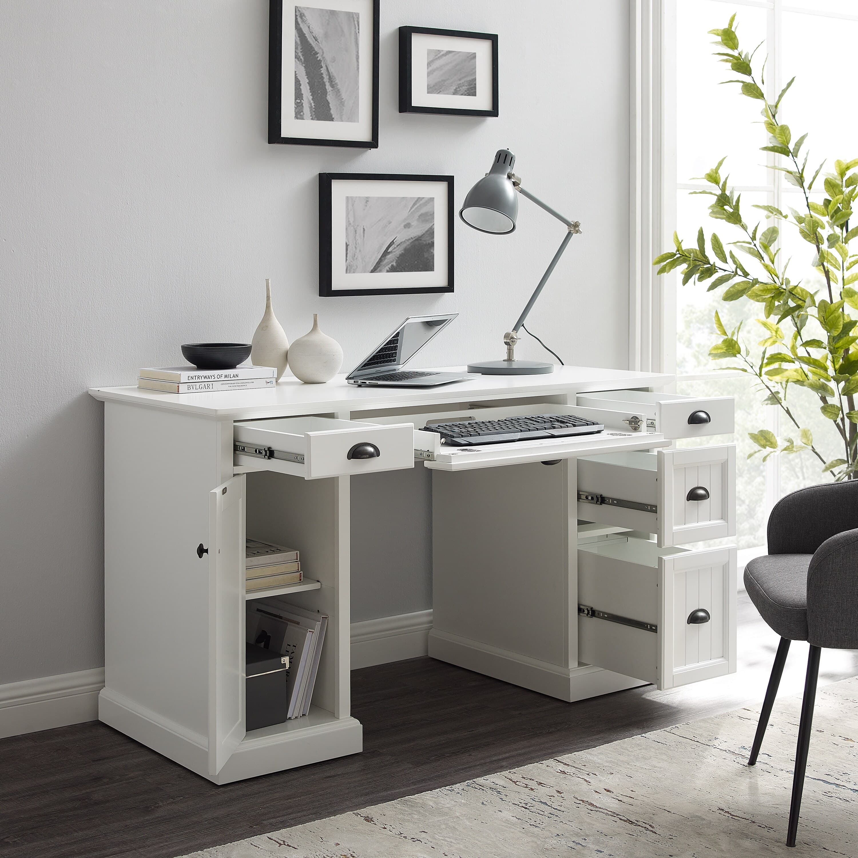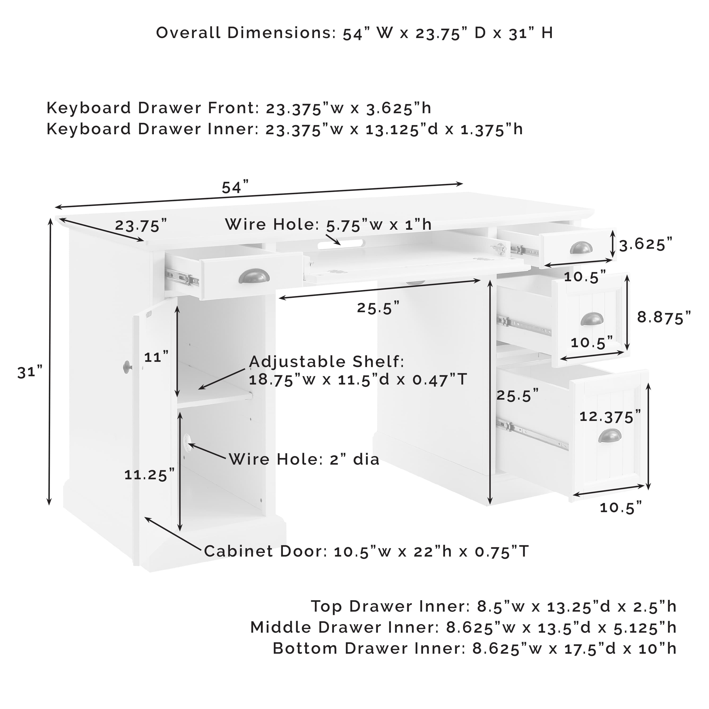The Shoreline Computer Desk embodies coastal style and provides ample storage space. Key features include a drop-down keyboard tray and a cabinet for a computer tower, making it ideal for telecommuters. It features three storage drawers with full-extension glides and a large file cabinet drawer to organize documents. Decorative details like half-cup hardware and beadboard paneling enhance its aesthetic. The desk includes a white finish, classic half-cup pull hardware in antique bronze, and five full-extension drawers with ball-bearing glides. A large file drawer includes rails for both standard letter and A4 papers. The center drawer doubles as a keyboard tray. The side cabinet can house a standard computer tower with removable shelving and has a cable management opening. Offers ample workspace and adjustable leg levelers, suiting modern farmhouse and traditional decor.