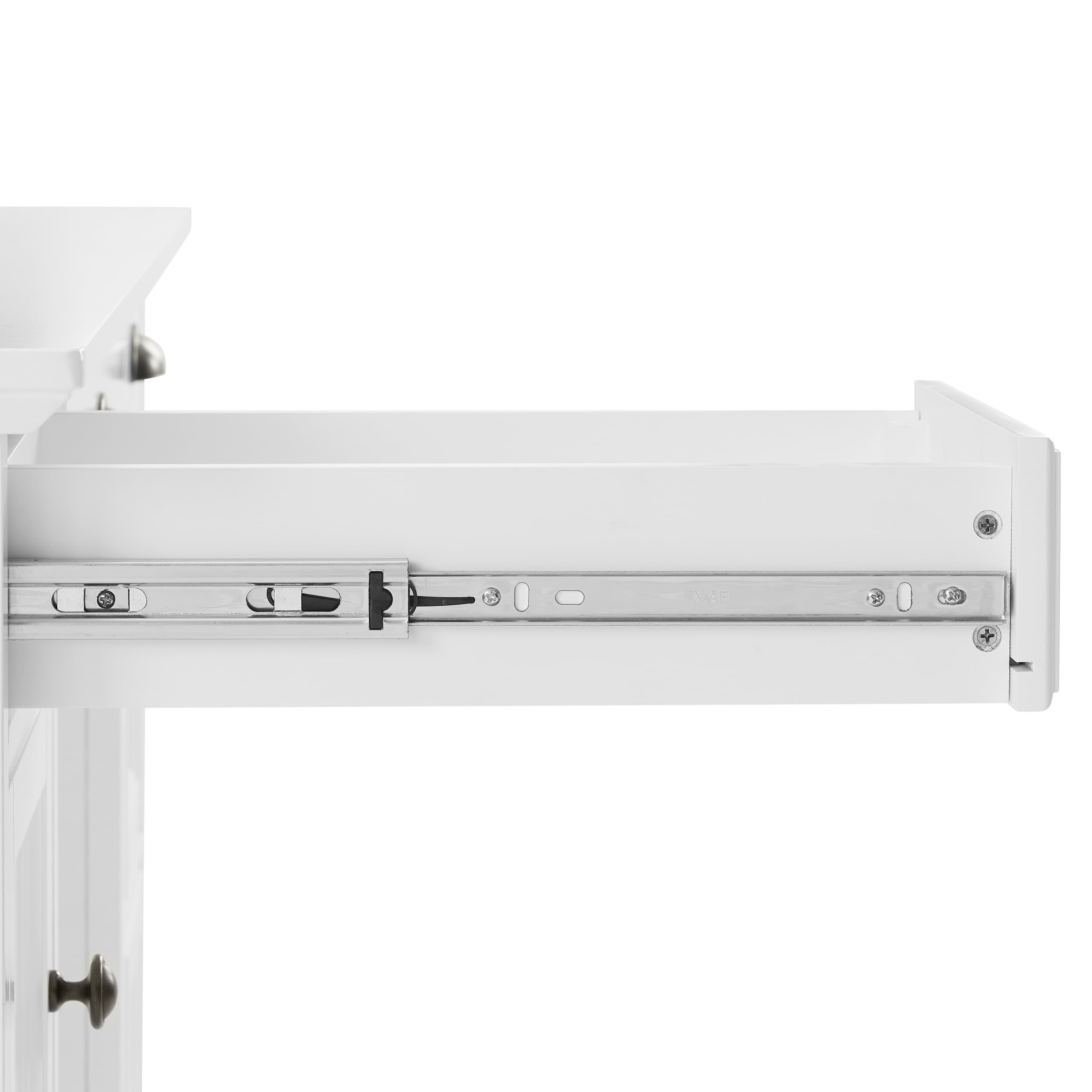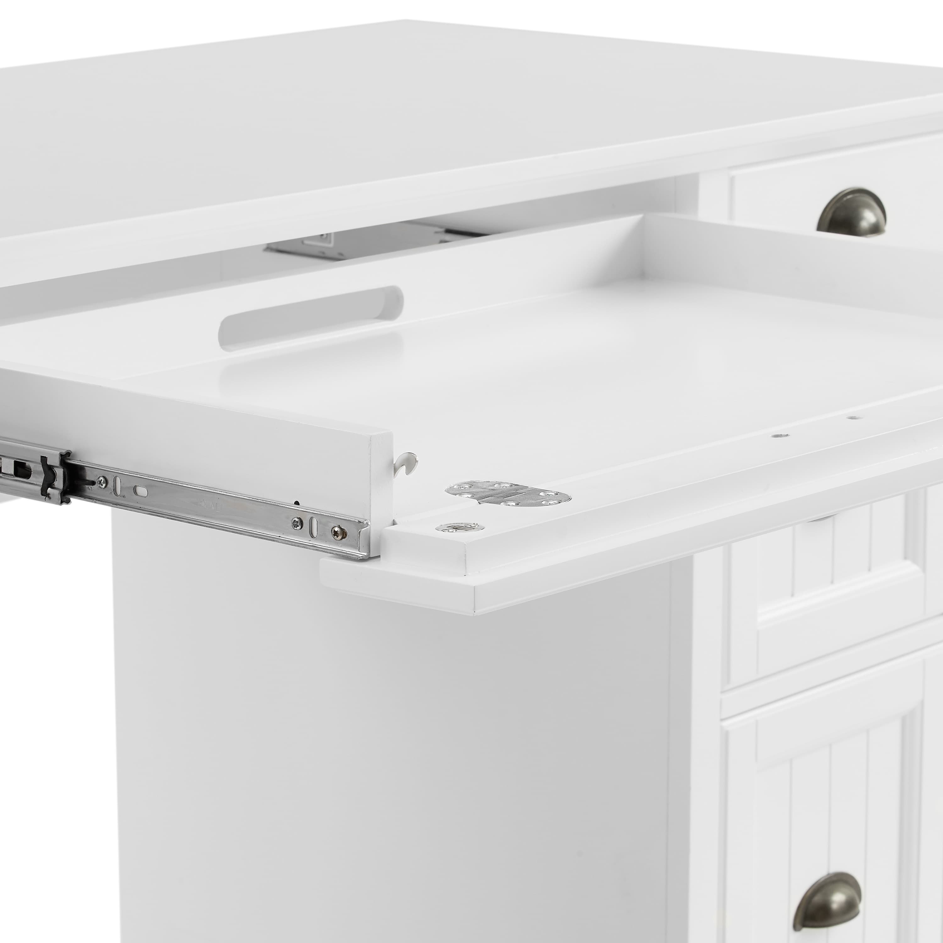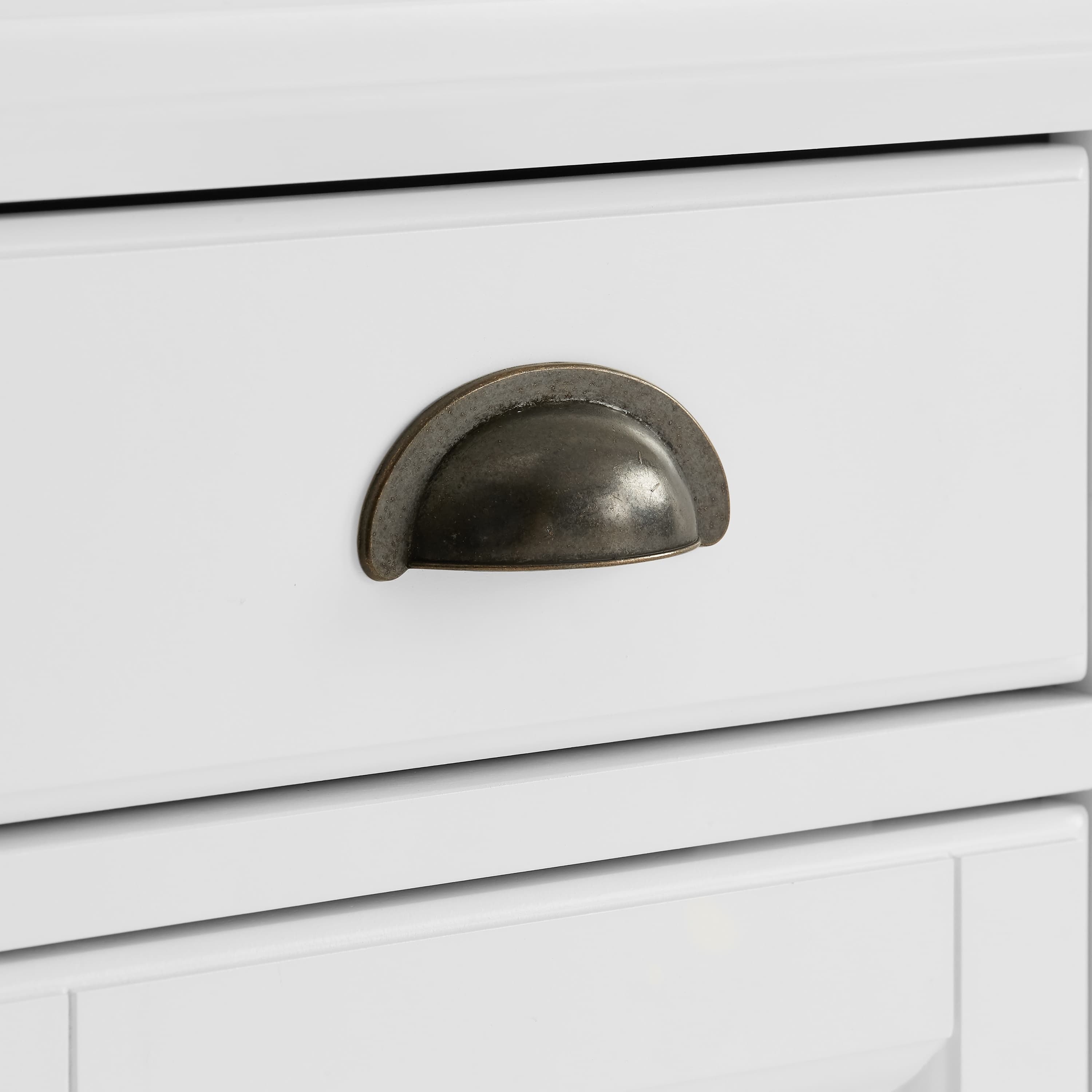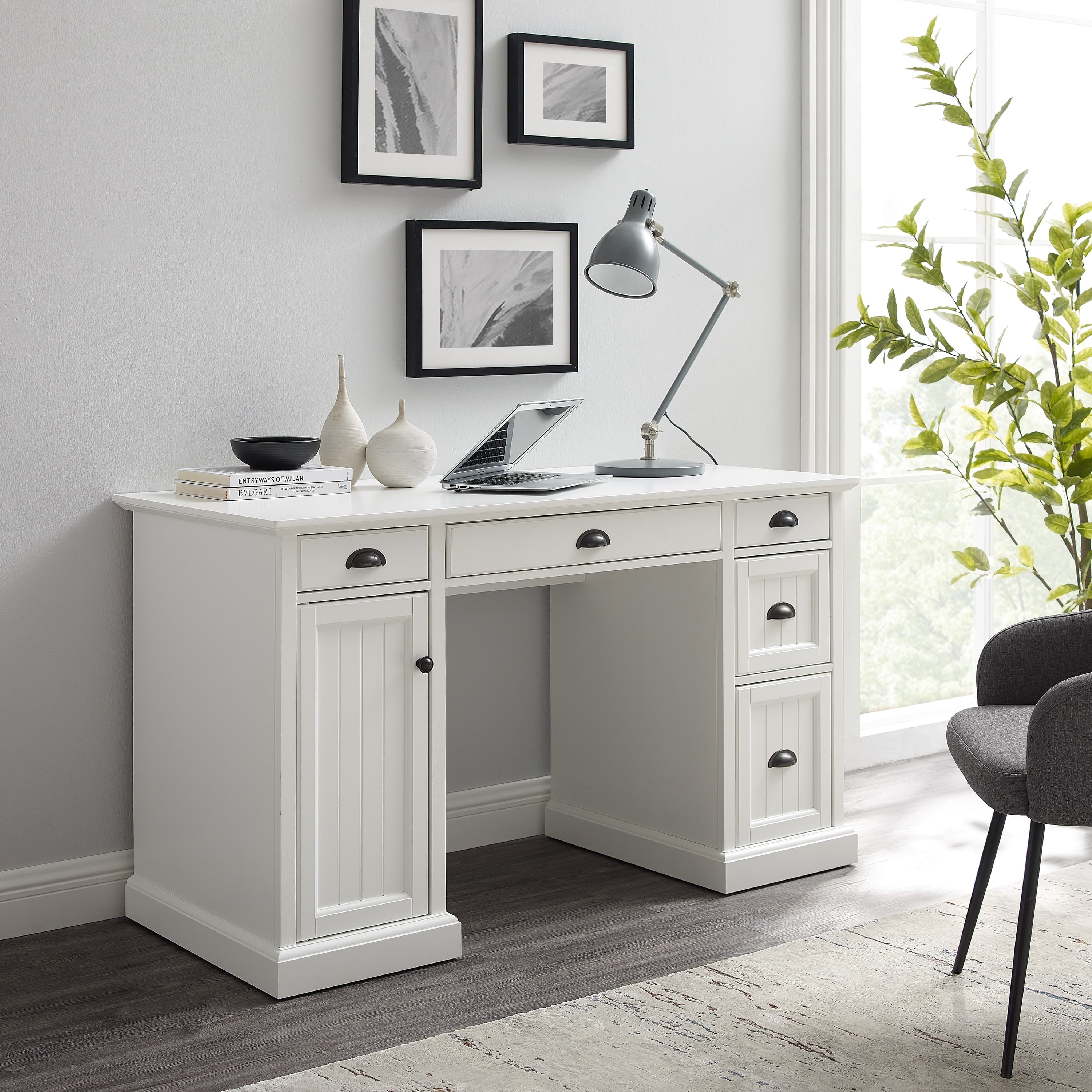 The Shoreline Computer Desk embodies coastal style and provides ample storage space. Key features include a drop-down keyboard tray and a cabinet for a computer tower, making it ideal for telecommuters. It features three storage drawers with full-extension glides and a large file cabinet drawer to organize documents. Decorative details like half-cup hardware and beadboard paneling enhance its aesthetic. The desk includes a white finish, classic half-cup pull hardware in antique bronze, and five full-extension drawers with ball-bearing glides. A large file drawer includes rails for both standard letter and A4 papers. The center drawer doubles as a keyboard tray. The side cabinet can house a standard computer tower with removable shelving and has a cable management opening. Offers ample workspace and adjustable leg levelers, suiting modern farmhouse and traditional decor.