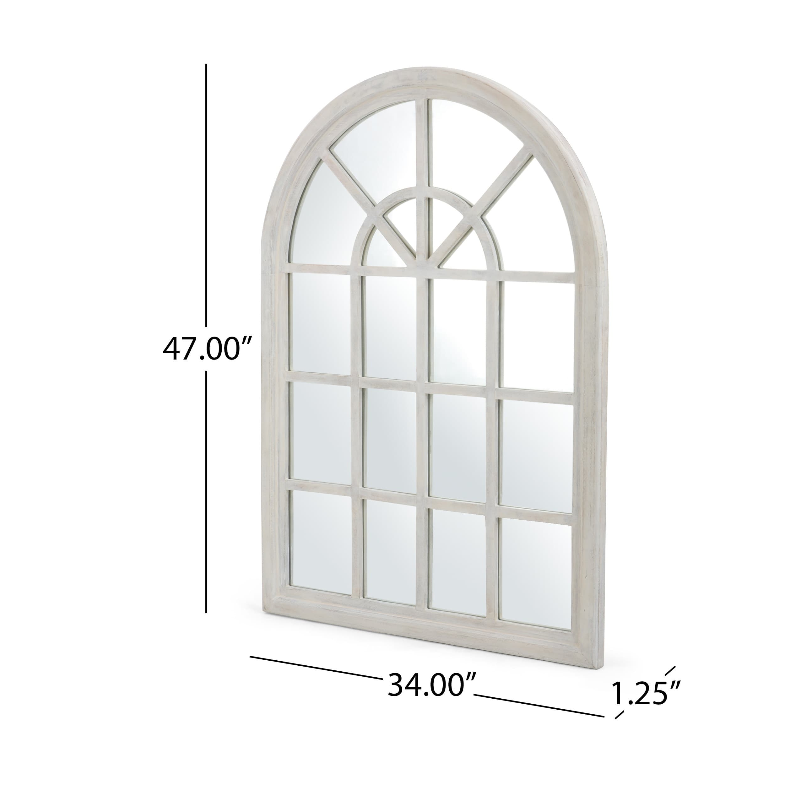 Elevate your home décor with the ARCH WINDOW MIRROR, combining vintage charm with modern functionality. Featuring an arched windowpane design with a circle-top accent and grid pattern, it adds a regal touch to any room or hallway. The reflective surface brightens up your space and highlights your existing furniture. Crafted from tempered glass and mango wood with a white wash finish, this handcrafted mirror is durable and elegant. It requires no assembly and is ready to enhance your home right out of the box.
