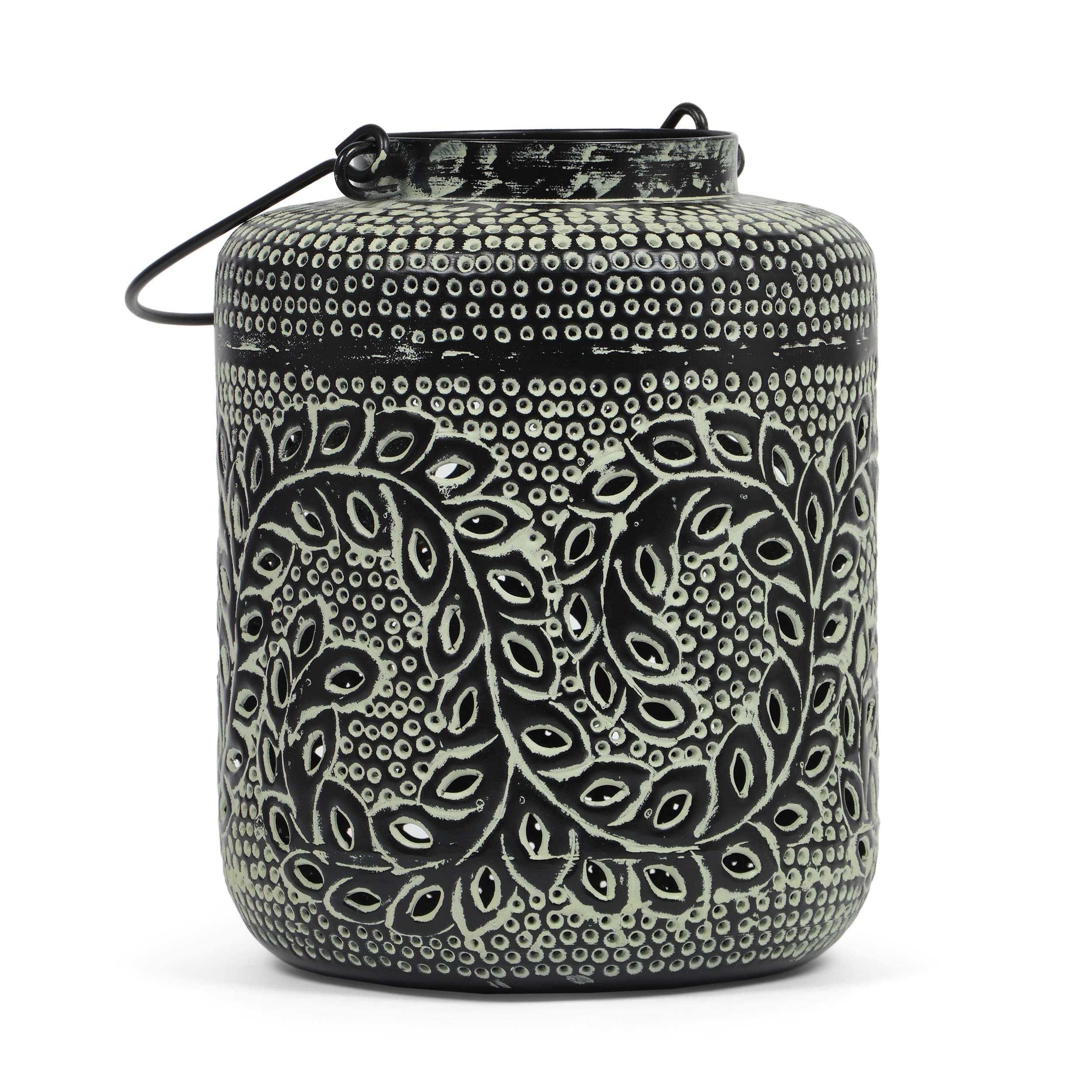 Enhance your garden or outdoor decor with this large Indian-style lantern. Made from iron with an ornate leaf design, it boasts a green patina and black finish, adding elegance and a vintage feel. Measuring 12" L x 12" W x 15" H, it's ready to use without assembly, perfect for decorative fillers or flameless candles. Handcrafted with attention to detail, this lantern is a chic addition to any area.