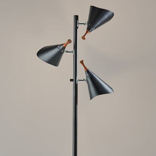 This timeless floor lamp includes a sleek black steel base and three downlight shades offering a clean aesthetic.