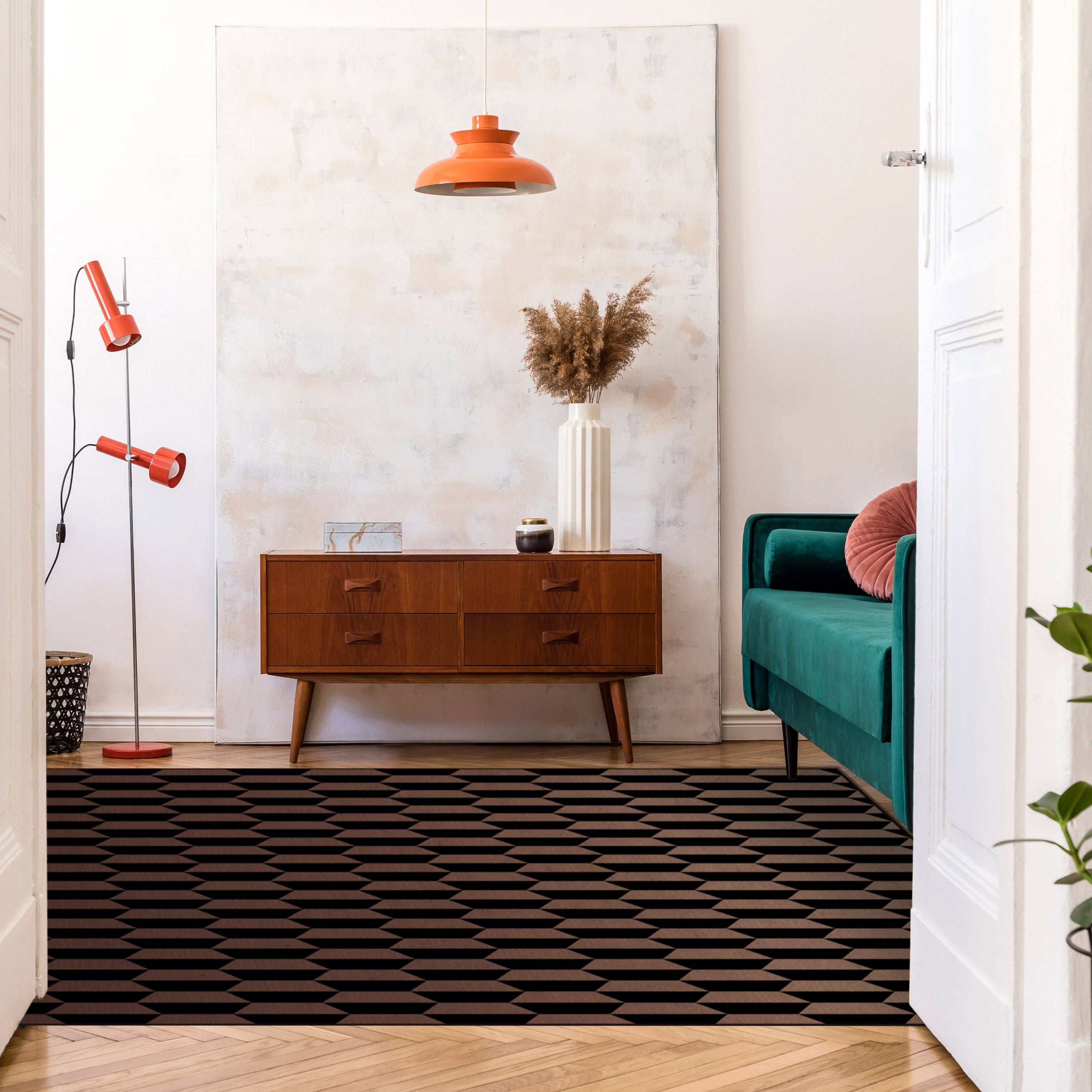 The rug offers a vintage look with its hexagon pattern, combining a waterproof design for added durability. Its bronze ebony hues bring a stylish touch.