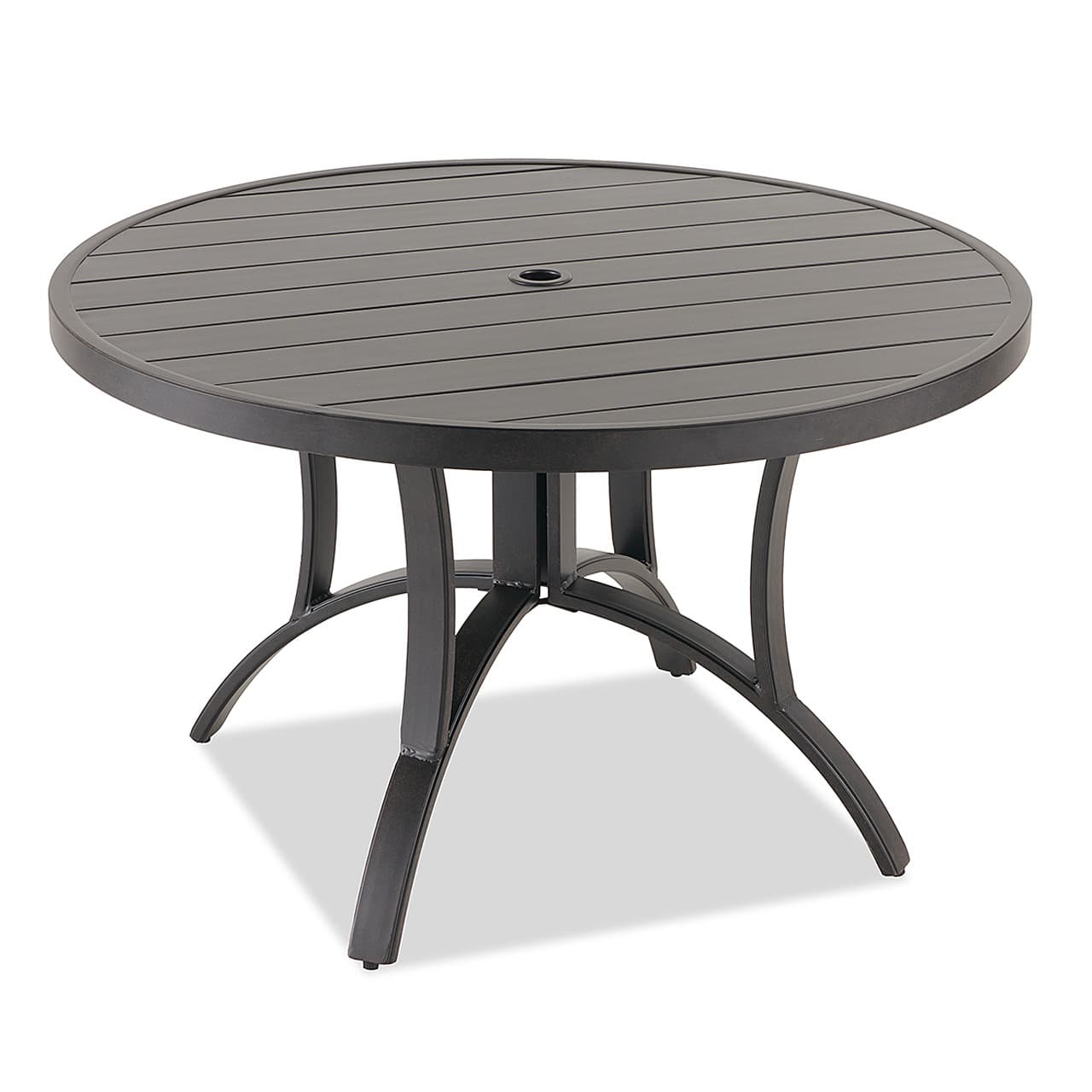 Hill Country Dining collection offers a modern look with smooth surfaces and outdoor functionality. This 48-inch table features an extruded aluminum frame coated with a weather-resistant finish and UV inhibitors. The slat-top design includes a captured edge for a clean finish and a trestle base for extra support. You can mix and match arm chairs and swivel rockers from the collection. Features include fully welded aluminum frames with cast accents, a powder-coated finish, full circumference extrusions, and an umbrella hole with plug for various umbrellas.