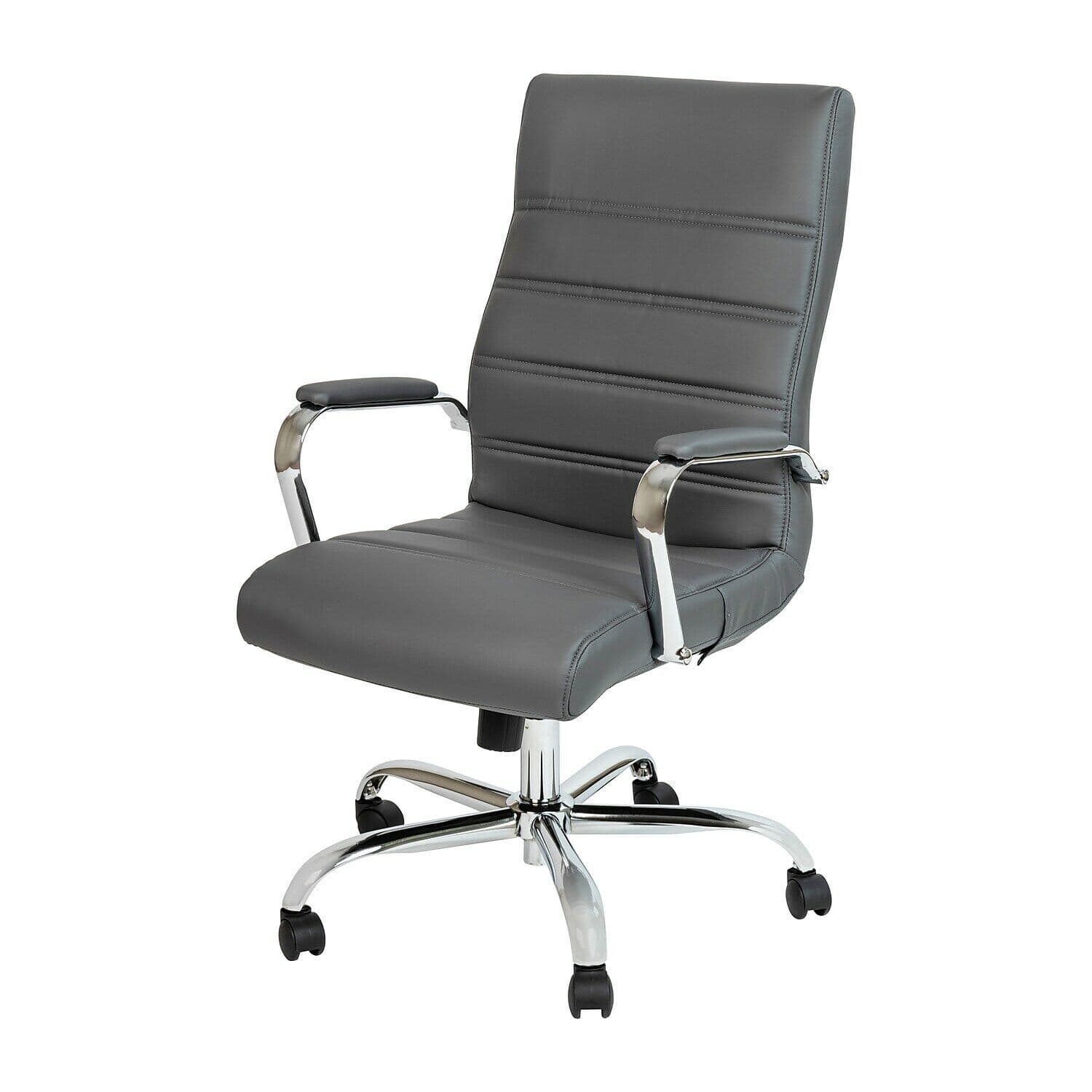 Experience a harmonious mix of comfort and style with this high-back LeatherSoft office chair, an ideal seating option for your workspace. Made with gray LeatherSoft material and featuring chrome arms and base, its ergonomic design provides a sleek appearance while ensuring durability and support for prolonged use. Enjoy exceptional comfort with its cushioned seat and back, upholstered in gray LeatherSoft for a soft yet durable feel. The padded arms offer added comfort, and the horizontal stitching on the seat and back provides a refined touch. The high-back office chair supports your upper back and alleviates back strain. Its waterfall seat edge reduces pressure on your lower legs, promoting better circulation during long desk hours. Customize your seating with the pneumatic height adjustment lever and tilt-lock mechanism for a smooth reclining motion. Effortlessly switch between tasks with its full 360-degree swivel, perfect for quickly accessing your computer, phone, and more. When reaching for objects farther away, the wheeled base allows smooth mobility. The bright chrome finish on the frame and arms offers a timeless look that complements any office décor. The classic gray LeatherSoft easily matches both residential and corporate workspace styles, providing a comfortable and sophisticated impression.