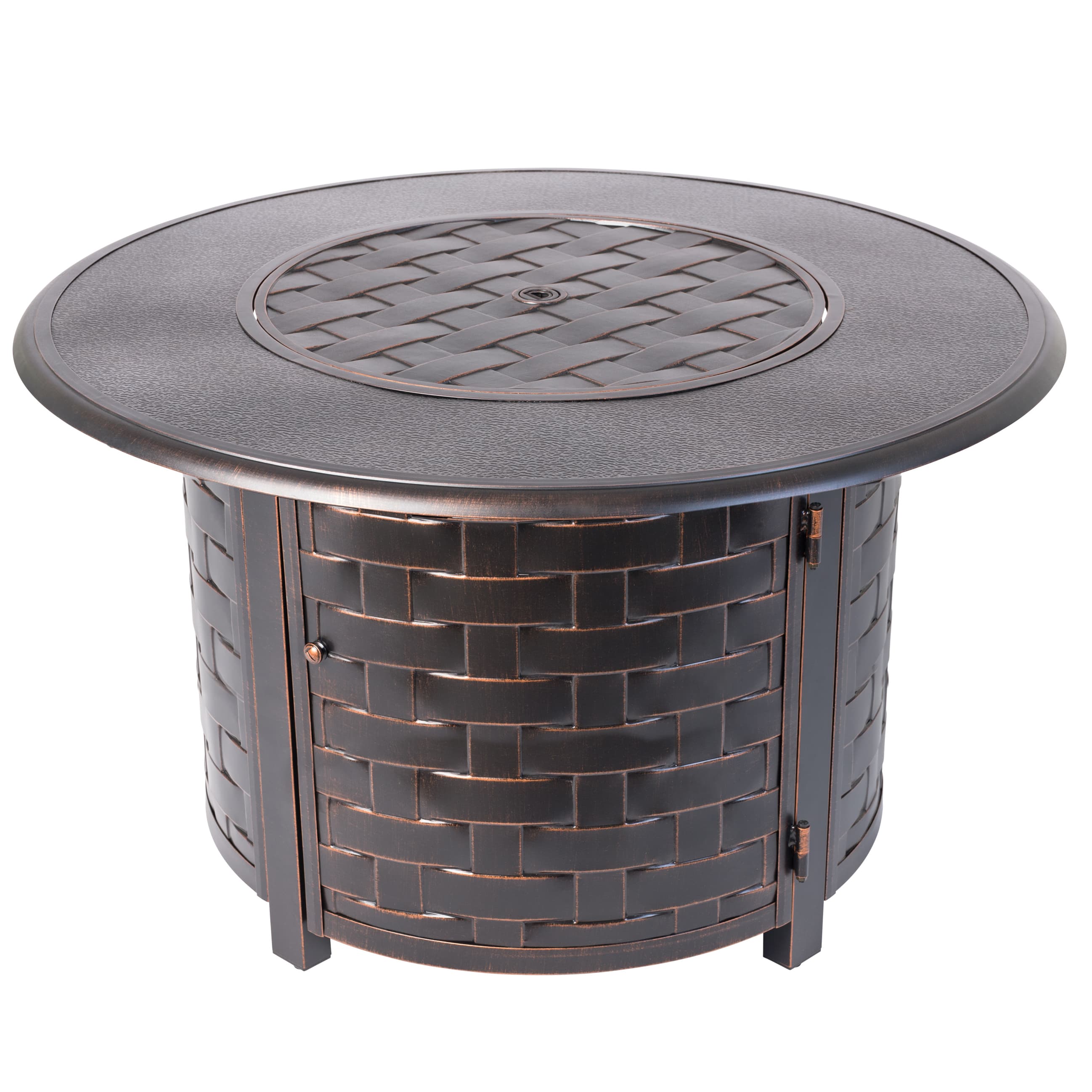 Compatible with any contemporary or traditional outdoor decor, the Armstrong Round Aluminum LPG Fire Pit features an oversized splitwood-style basketweave motif complemented by a subtly-pebbled table surface. With an Antique Bronze brushed finish, practical aluminum build, and an output of 50,000 BTU, this versatile fire pit pulls double duty as a patio table when you add the included fire bowl lid with flush-mounted handle. Arriving with clear fire glass for a stylish touch, just add a standard 20lb propane tank behind the convenient hinged door. A vinyl weather cover for the fire pit is included for your convenience. Fire Pit Type: Fire Table Fire Pit Fuel Type: Propane BTUs: 50000 Ignition: Push Button Fire Pit Shape: Round