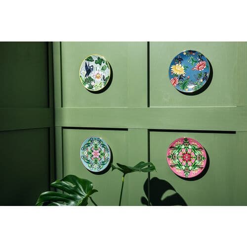 Gold trim along the rim frames the lush pinks, blues, and greens of this bone-china plate. Stunning enough to display, the plate is dishwasher safe, so you can use it every day.