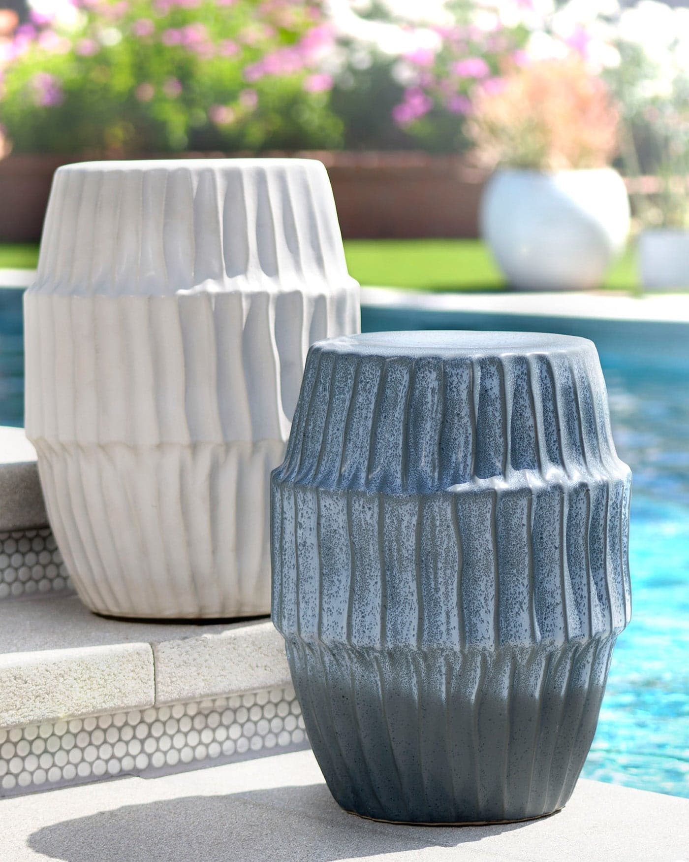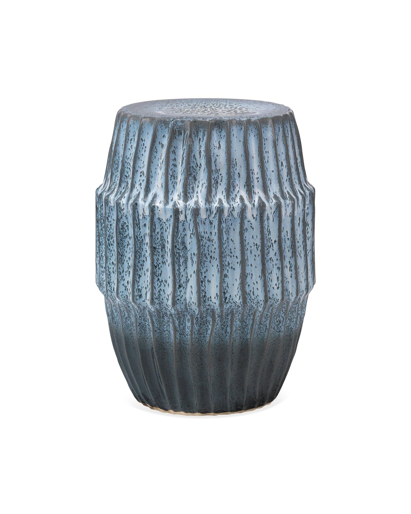 Reminiscent of textural sea algae, the rippled silhouette of this ceramic side table is perfect for any coastal inspired interior. The aquatic shape is glazed with ocean inspired hues that ombre from lighter colors, similar to the color of the ocean water dappled in sunlight, changing to the dark blue tones deep from the ocean depths.
