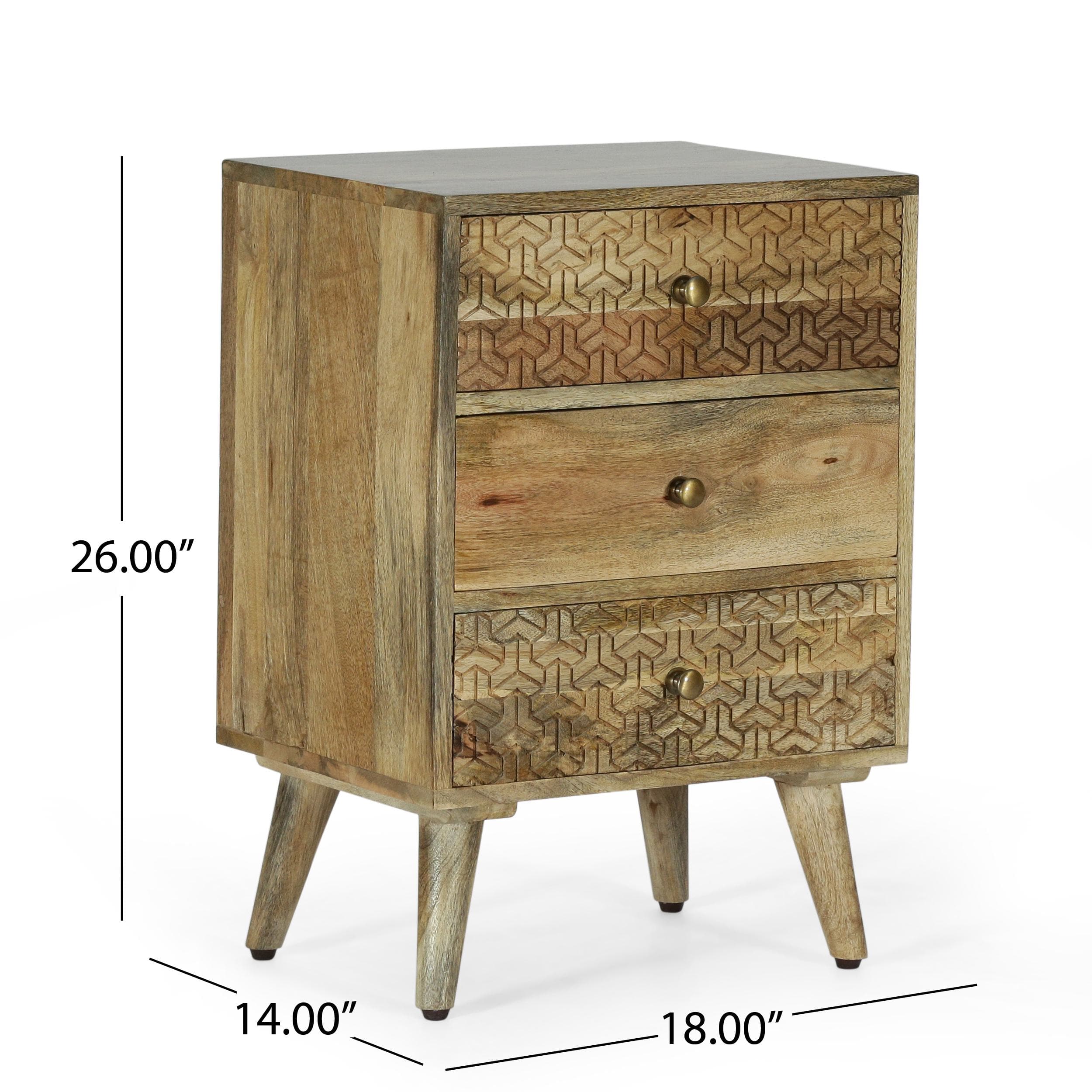 Elevate your bedroom decor with this stunning 3-drawer bedside nightstand. Crafted from rich mango wood, it features a beautifully carved geometric texture and tapered legs, bringing a bohemian touch to your space. This handcrafted piece offers three spacious drawers for all your storage needs, blending seamlessly with any decor. Measuring 18.00" W x 14.00" D x 26.00" H, this nightstand combines stylish function with carefree aesthetics, making it a perfect addition to your home.