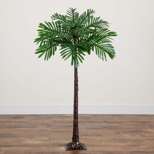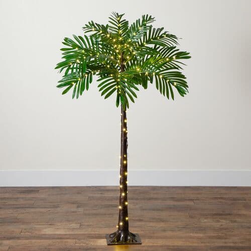 It's summertime faux-ever. Relive the season of fun with the artificial palm tree inspired by the dreamy Caribbean, you'll notice the details in every frond and dark brown trunk. Crafted from high-quality materials, bend the branches to fit in your space for a custom look. Pre-lit with 127 LED lights, this tree creates a soft, magical glow wherever it's displayed. Not only does it have warm lights, but you can extend the party outdoors and feel the magic of palm trees, no matter where you live, place this piece under a covered patio for an elevated glow. Standing 4' from a sturdy base, add in a planter of your choice. Transform your space into a paradise today, both indoor and outdoor.
