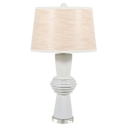 The seagrass shade offers a textured contrast to the lamp's sleek acrylic base and finial. Its glossy white stoneware body, featuring rings inspired by ocean waves, achieves a balance between organic and stylish.