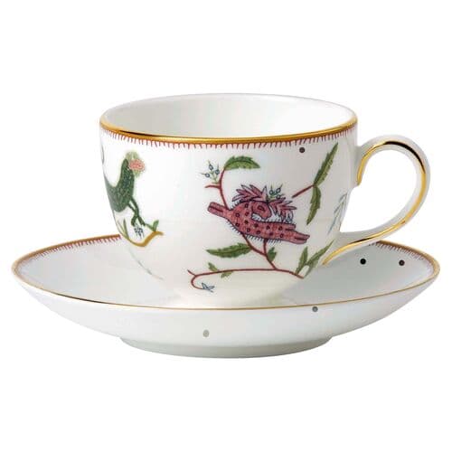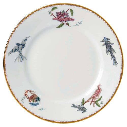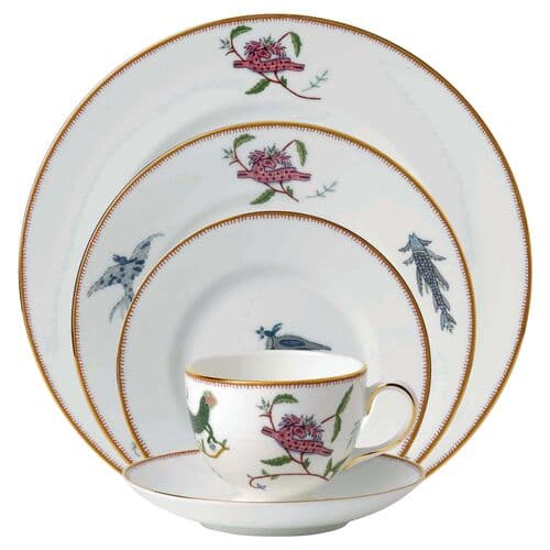 Designed by Kit Kemp for Wedgwood, this place setting from the Mythical Creatures collection is crafted of prized bone china and adorned with fanciful fish, fowl, and four-legged creatures based on the acclaimed designer’s line of embroidered fabrics. Gold embellishments complete the whimsical design.