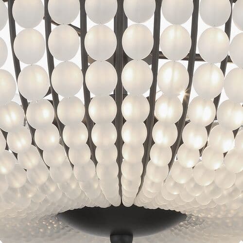 Add a touch of modern style to your décor with the frosted glass bead ceiling mount. The metal frame features glass beads sweeping downward and inward, connecting a larger hanging glass ball. This elegant contrast combined with frosted white glass adds a bold look to your indoor living areas.