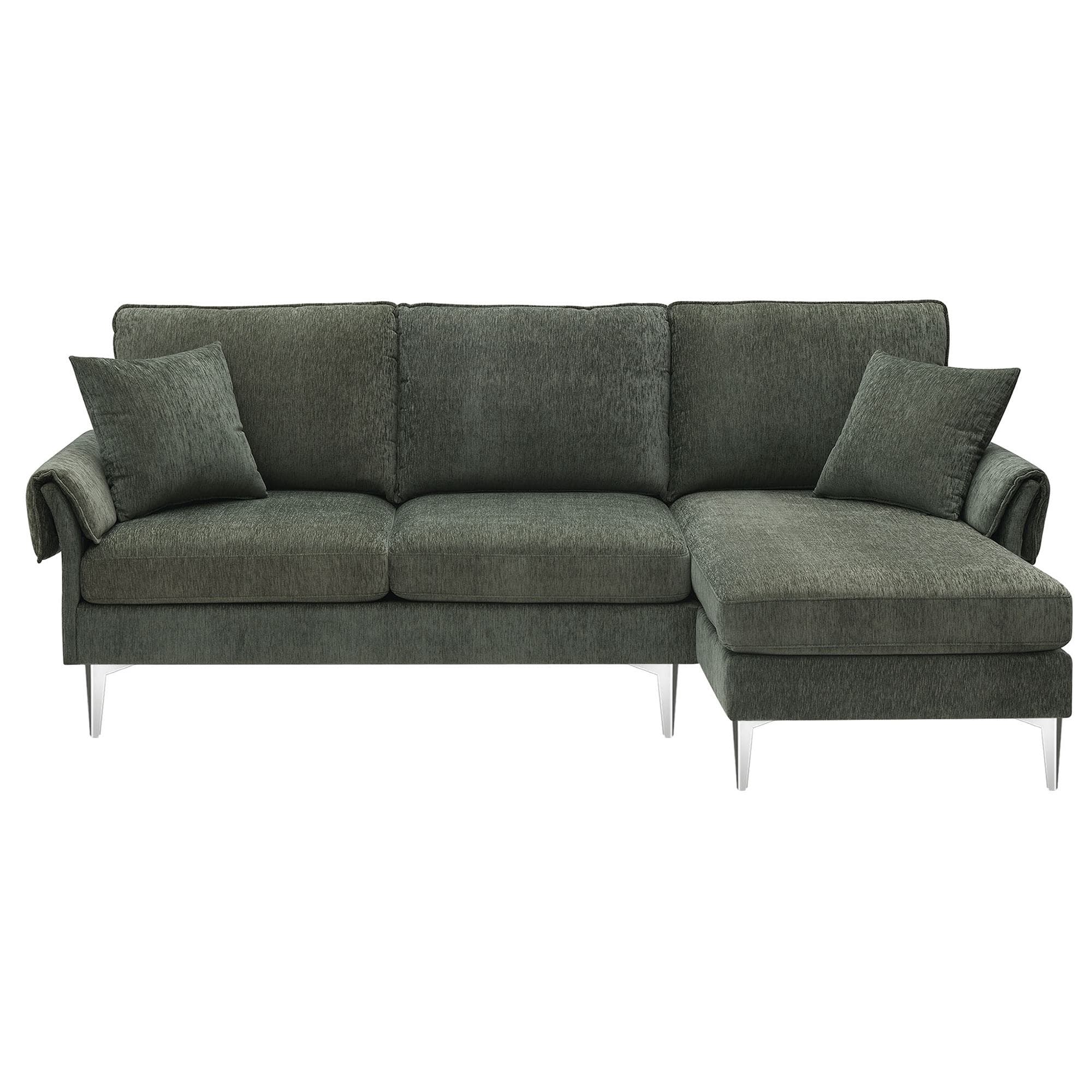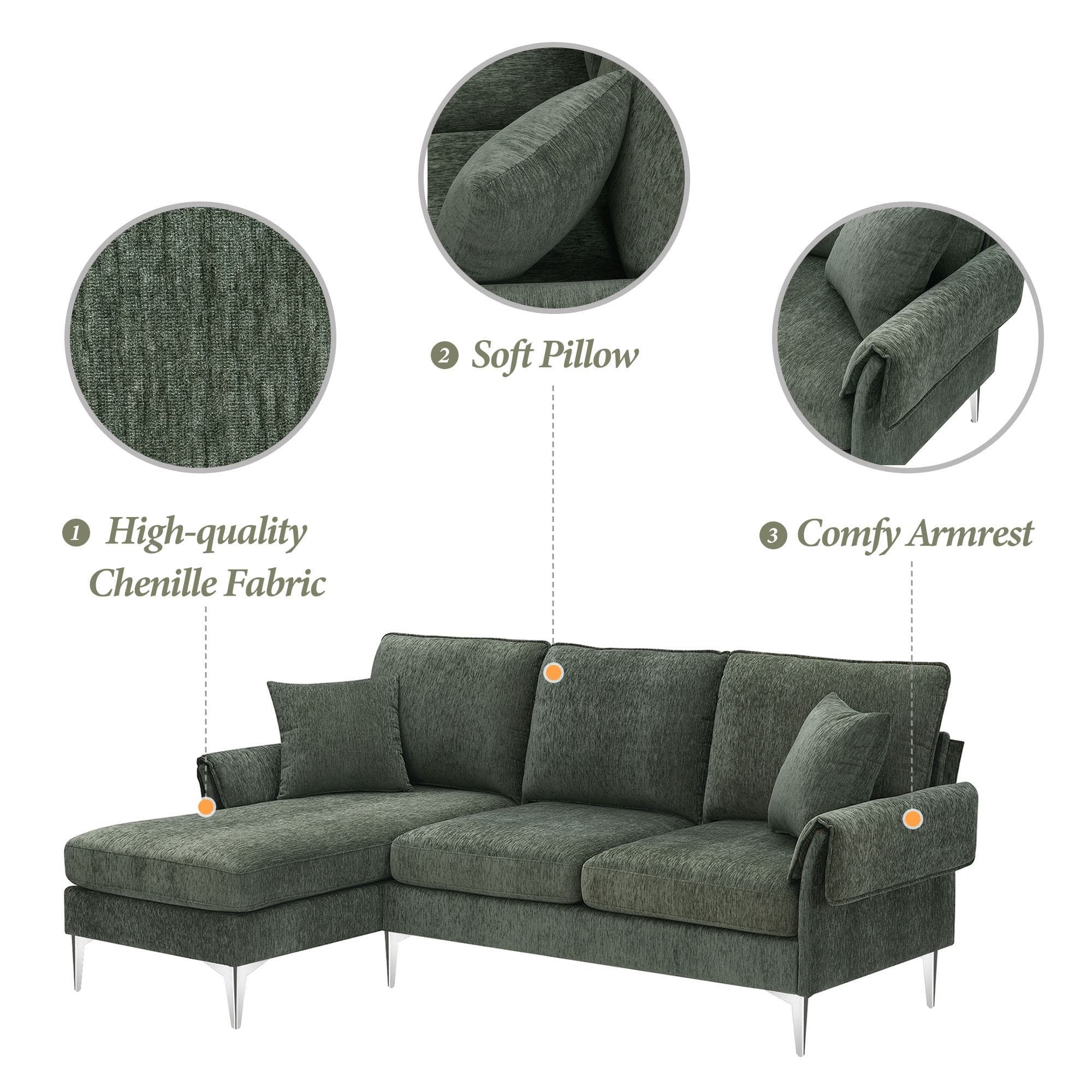 Upgrade your living space with the 84" Modern Chenille L-Shaped Sofa with Reversible Lounge. This convertible sectional couch set, featuring a sleek green chenille upholstery and sturdy chromed metal legs, comfortably seats four and includes two matching pillows. The reversible chaise allows for flexible arrangement to fit any room layout, making it perfect for living rooms, apartments, or offices. With its unique armrest design and durable construction, this sofa combines style, comfort, and versatility for any home.