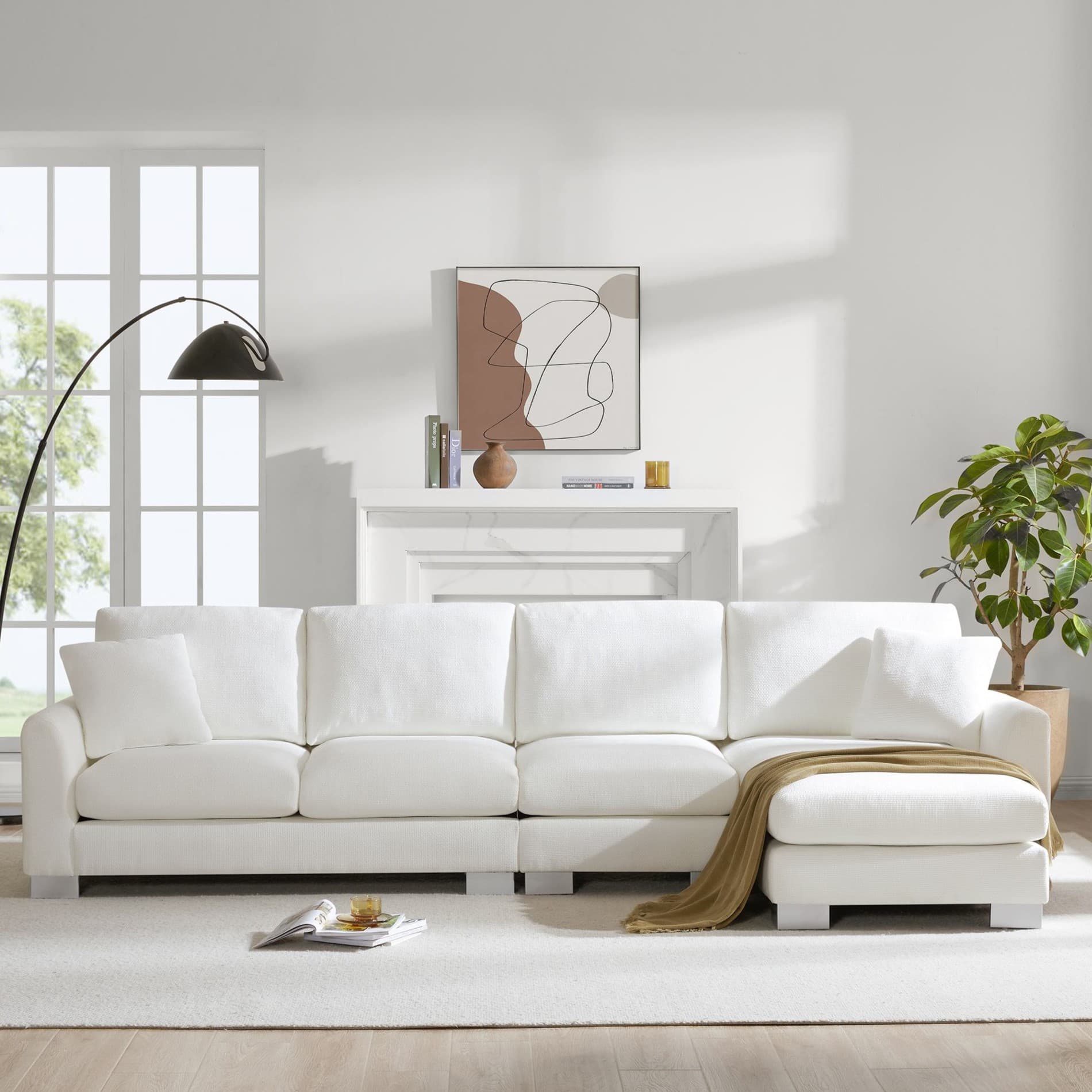 Upgrade your living space with this 119" x 55" modern oversized sectional sofa, perfect for any living room, apartment, or office. This L-shaped luxury couch set, upholstered in high-quality chenille, comfortably seats 4-5 people and includes two free pillows for added comfort. The silver aluminum feet add a touch of elegance, while the chaise lounge offers a relaxing spot to unwind after a long day. With its sturdy solid wood and iron frame, this stylish and functional sofa is built to last and elevate the taste of your living environment.