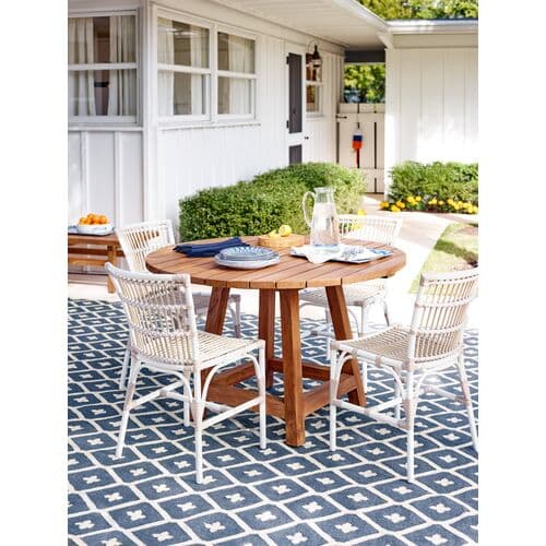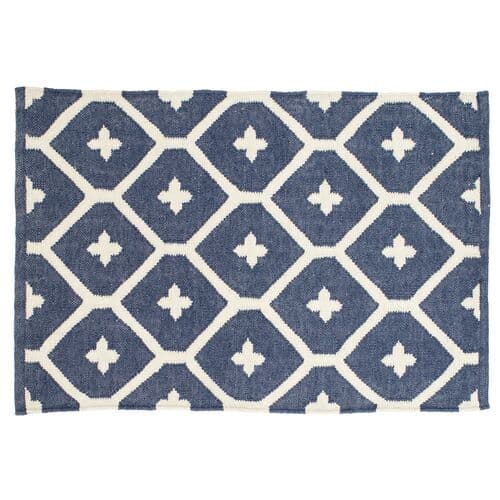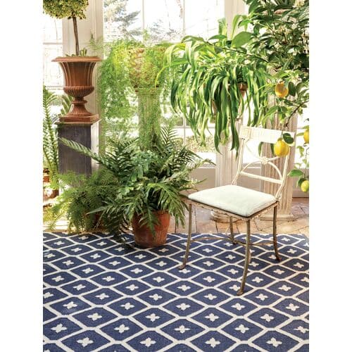 Crafted from UV-treated recycled plastic and handwoven with a bold geometric design in navy, this eco-friendly rug adds a refreshing touch of contemporary style to any indoor or outdoor space. We recommend a rug pad to extend the life of your rug and keep it securely in place.