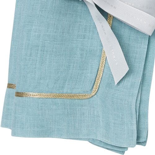 These simply elegant dinner napkins are crafted of blue linen and embellished with golden braided trim.