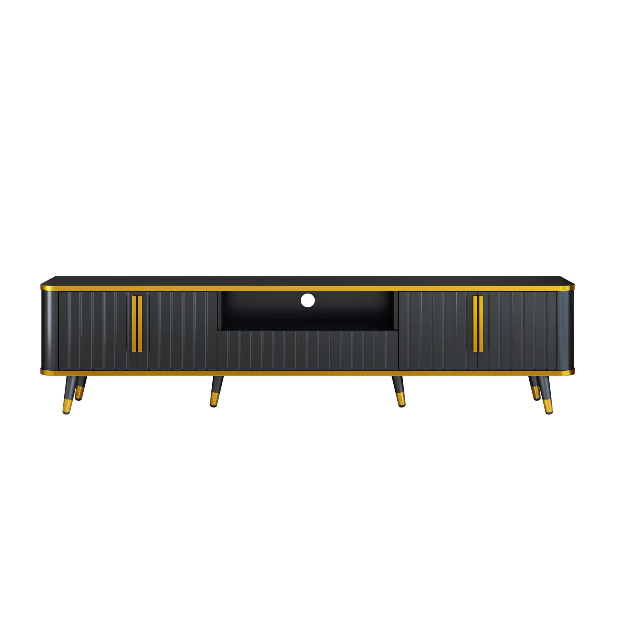 Elevate your living room with the ON-TREND luxury minimalism TV stand, designed for TVs up to 85". This sleek entertainment center features two cabinets, a drawer, and an open storage shelf, providing ample space for all your media essentials. The modern black and gold design adds a touch of elegance and luxury, while the circular cable hole ensures a tidy setup. Made from durable particle board and MDF, this TV stand is both stable and scratch-resistant, making it a practical and stylish addition to any home.