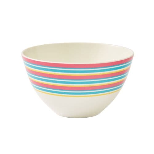 Bring vibrant color to the table with these set of 4 porcelain bowls from the Calypso Stripe collection. Inspired by the colors of the tropical island of Barbados, each plate features a stripe design in yellow, turquoise and pink. Eye-catching design at its finest. Dishwasher and microwave safe. Coordinates with the entire Calypso collection.