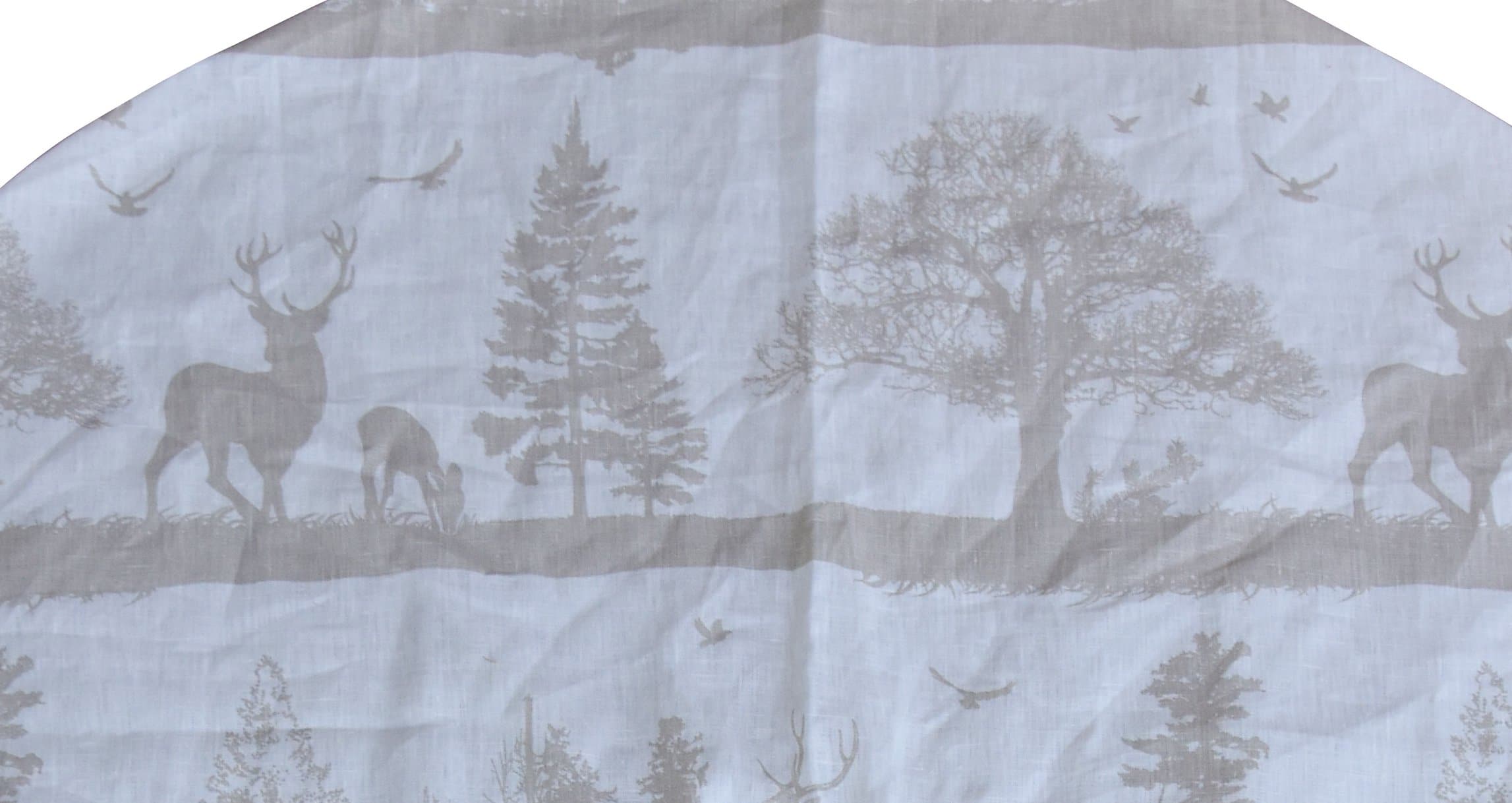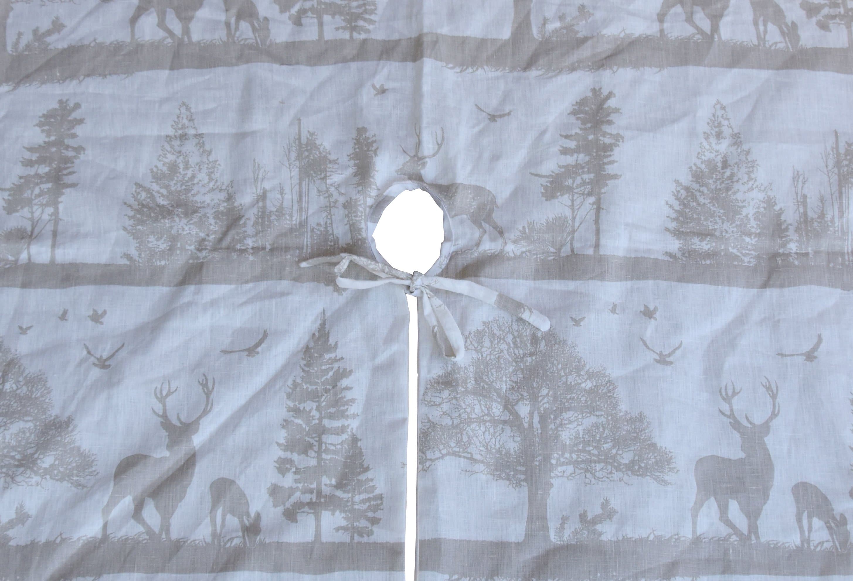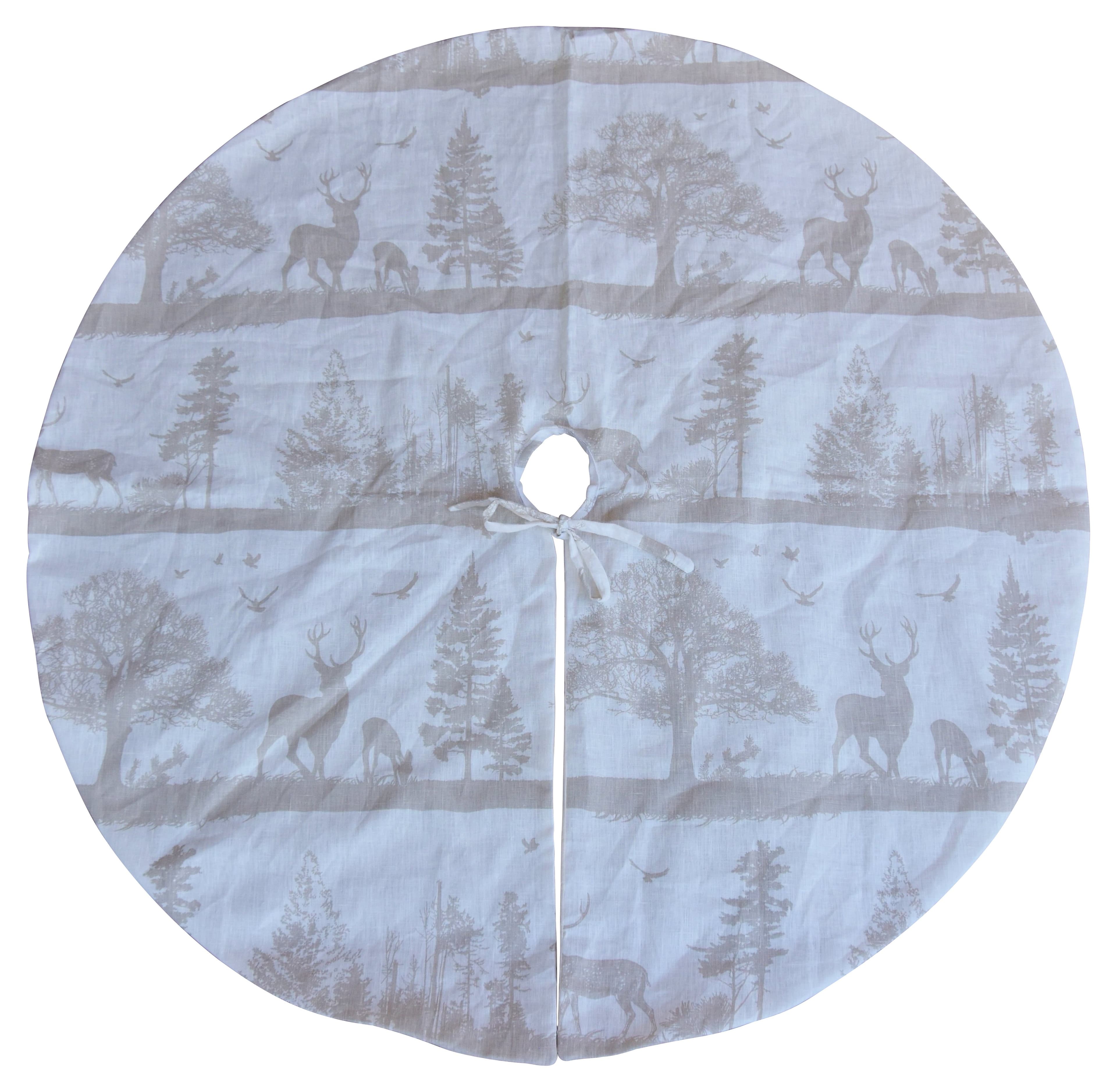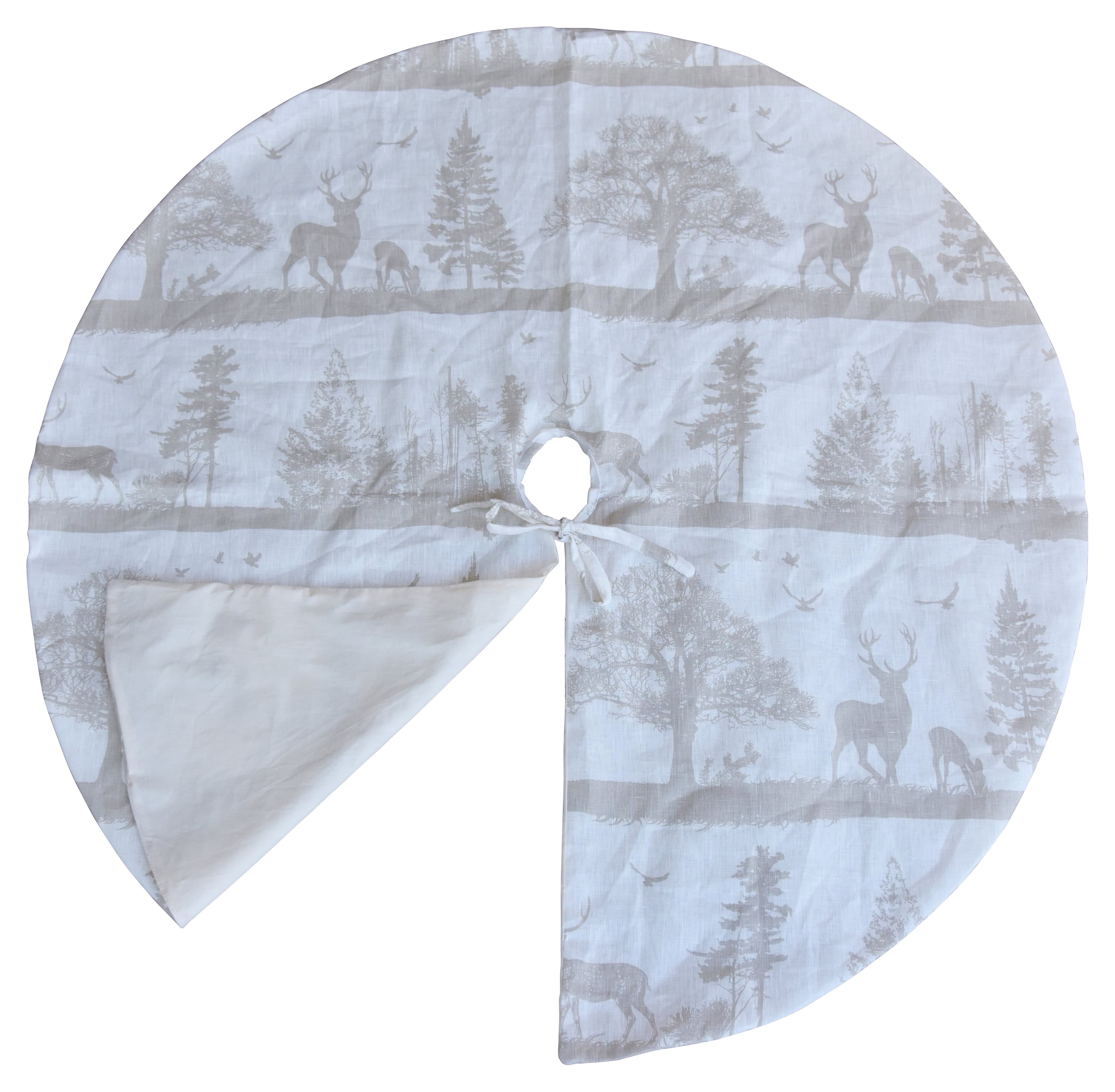 A custom-tailored Christmas tree skirt crafted from linen with a woodland motif, featuring an off-white cotton backing. This item is in excellent, new, unused condition without a maker's mark.