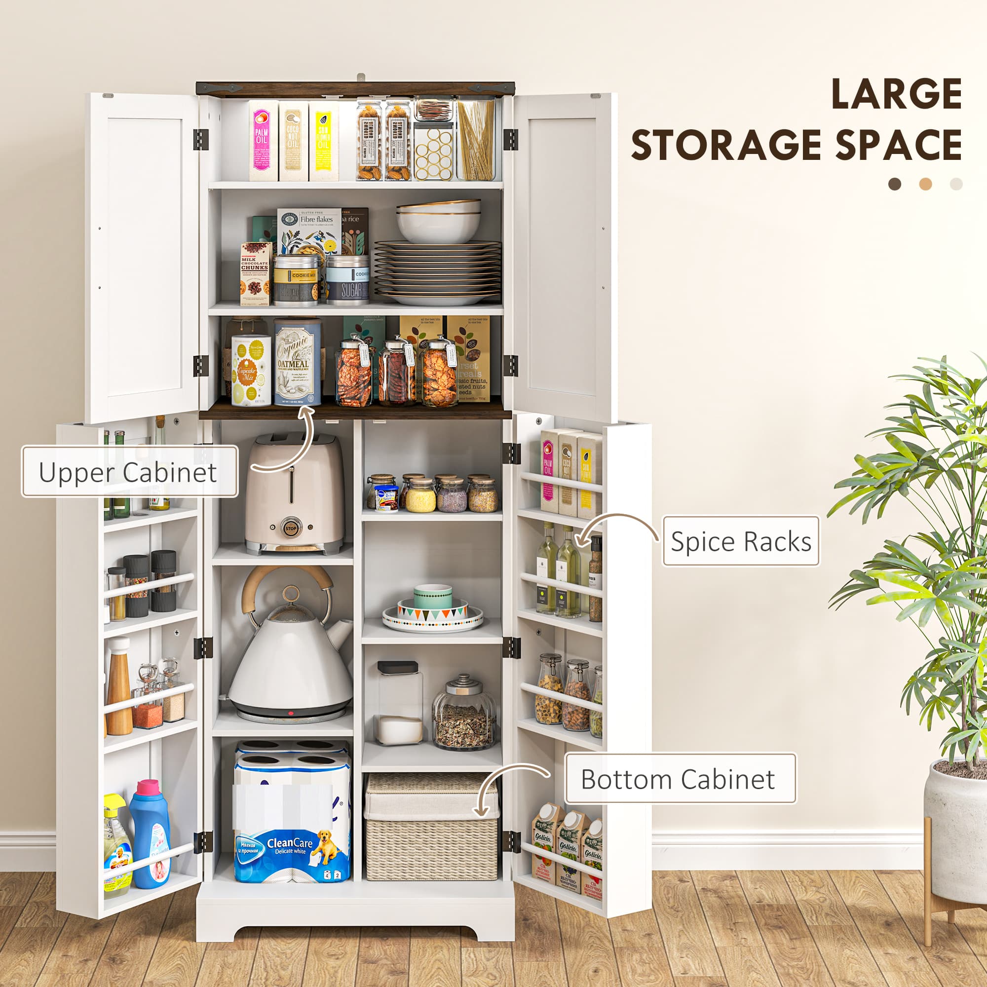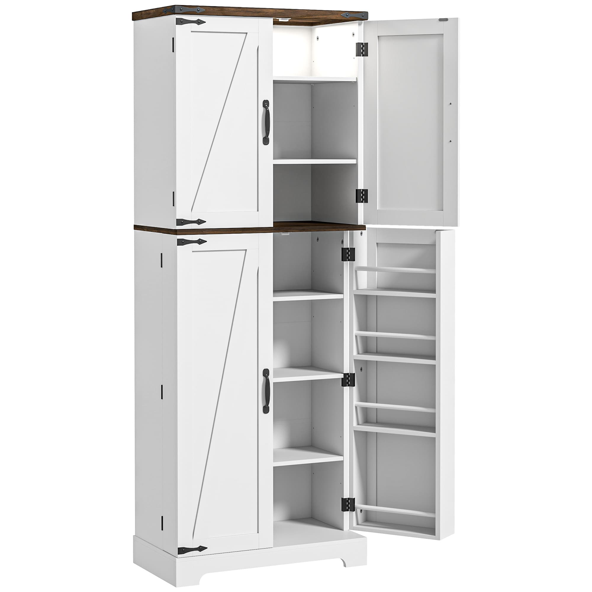 Transform your kitchen with the HOMCOM storage cabinet with doors and shelves, a genius blend of style and functionality. With ten shelves and eight spice racks, this kitchen pantry cabinet maximizes your storage space, while adjustable shelves cater to your specific needs. The anti-tipping design ensures safety and stability, making it a must-have tall storage cabinet for any home.