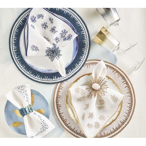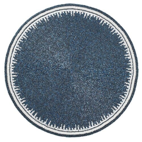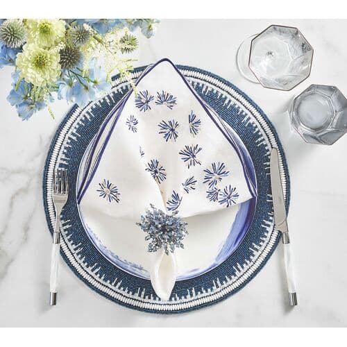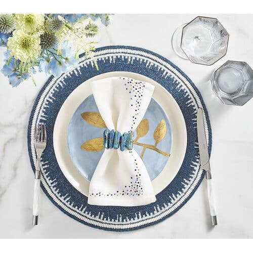 The Enamor Placemat is intricately beaded in a pattern that mimics the beauty of uneven brushstrokes. The glass and acrylic beads were expertly hand-arranged to create an irregular border. It evokes the spirit of springtime entertaining and is available in a variety of colorways to suit different entertaining styles.