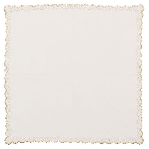 The Arches linen napkin offers a contemporary update to a standard white linen napkin, featuring a thick embroidered geometric edge accented by delicate pick-stitching. This harmonious border beautifully frames the entire napkin. The embroidery enhances the napkin's charm with a striking contrast and balance. Its versatile design seamlessly transitions from formal dining to more casual settings.