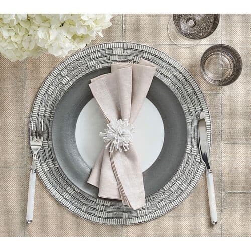 The artisanal Matrix placemat is hand-crafted using captivating beads. This unique beadwork gives the placemat a ceramic-like appearance. Beads of varying heights create an engaging high and low effect on a ringed border. This textured border features a captivating, repeated pattern. The transitional Matrix placemat combines style and function for spring and summer entertaining.